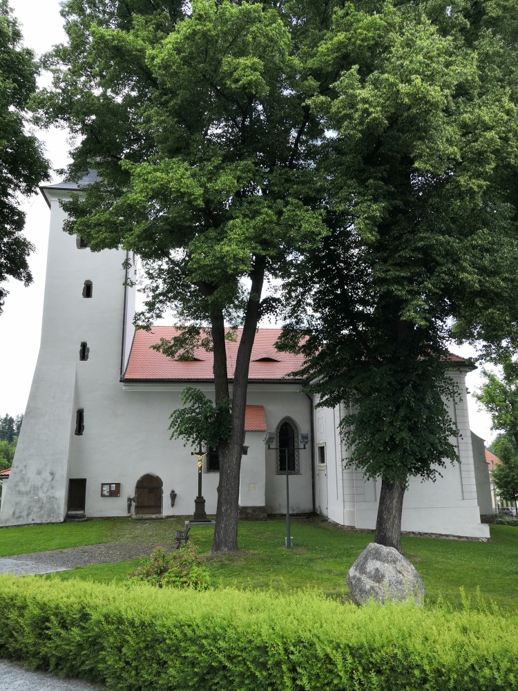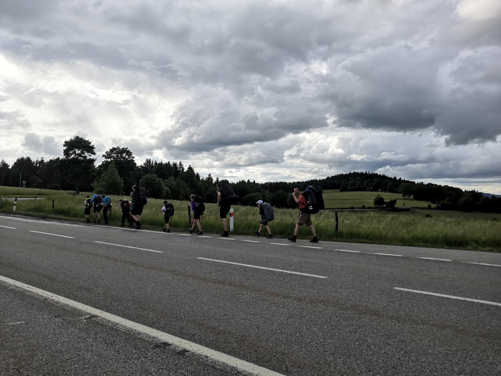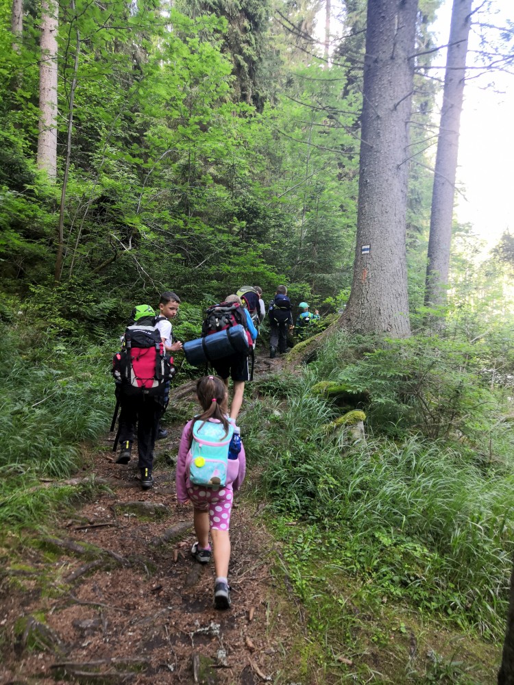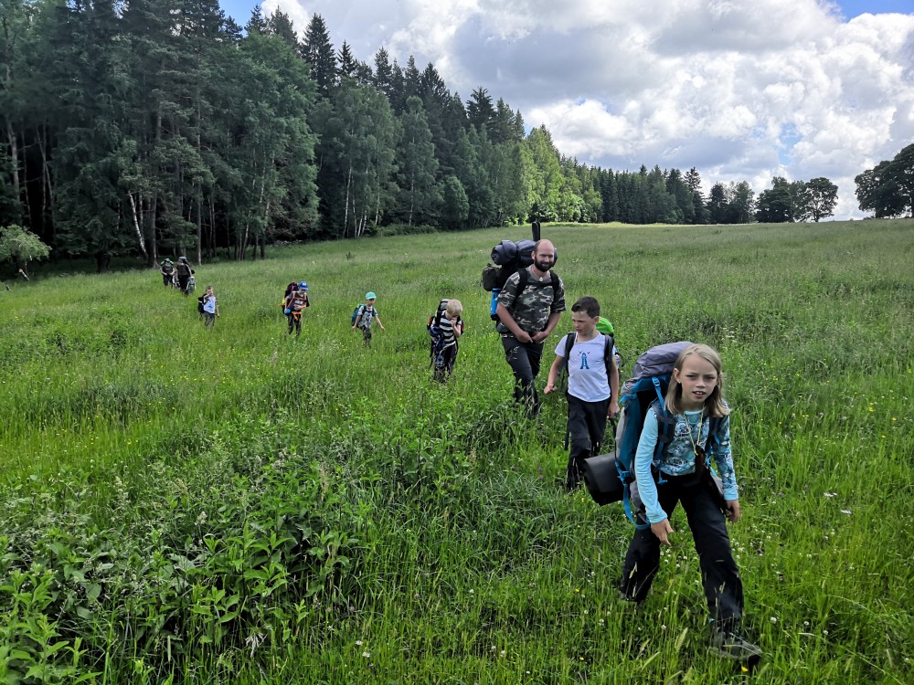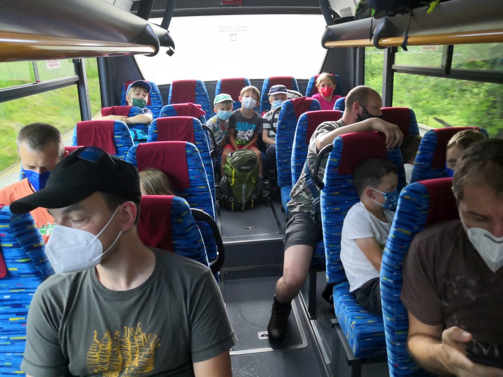 Tam se setkáváme s budějovickou sekcí, Jirkou s Toníkem a Kristýnkou a Pepou s Kryštofem a Šimonem. Jiřina s Adélkou komentátorkou se k nám připojí až zítra. Sedáme na autobus a jedeme přes Libínské sedlo na rozcestí Křišťanovice.