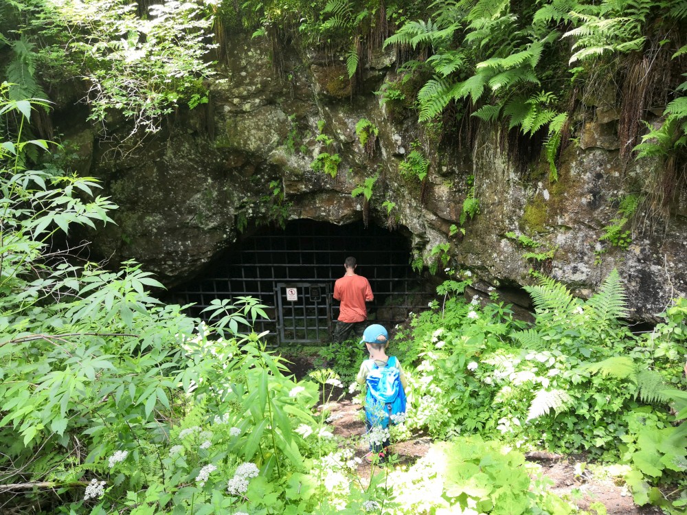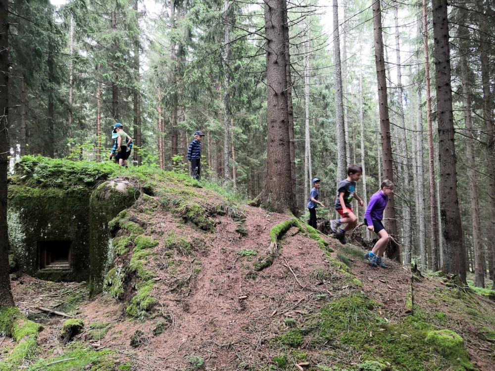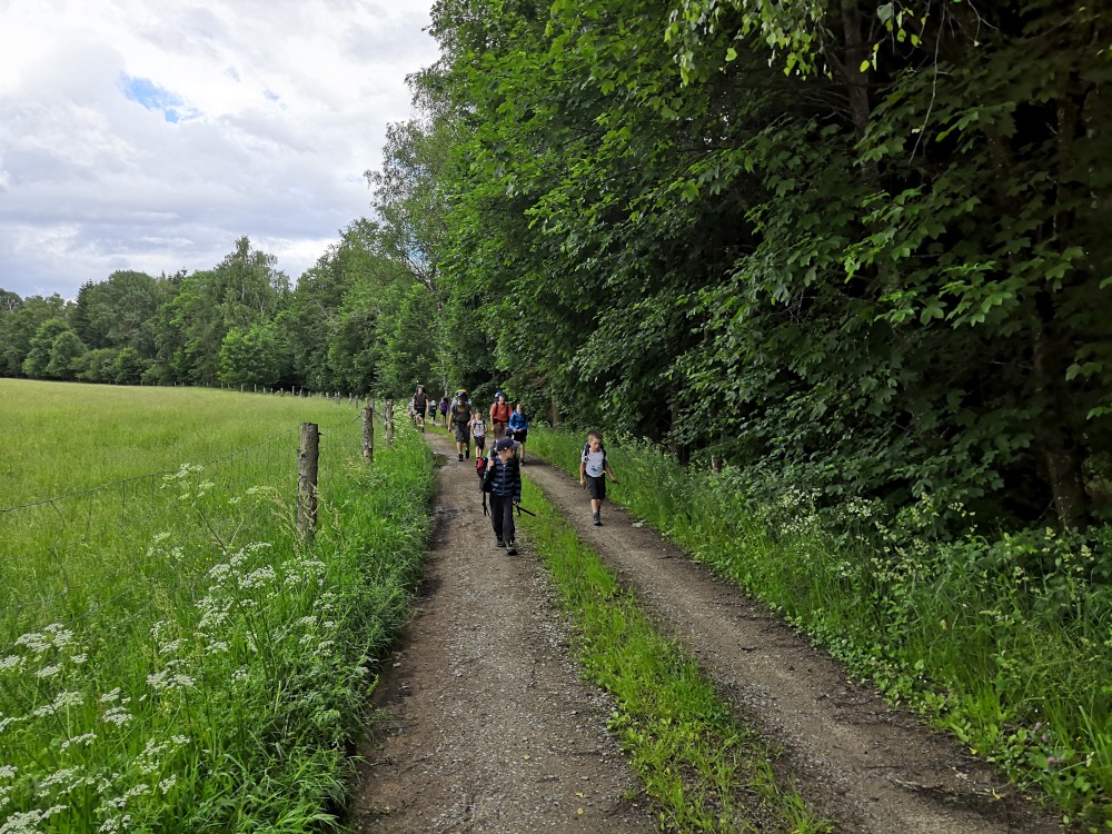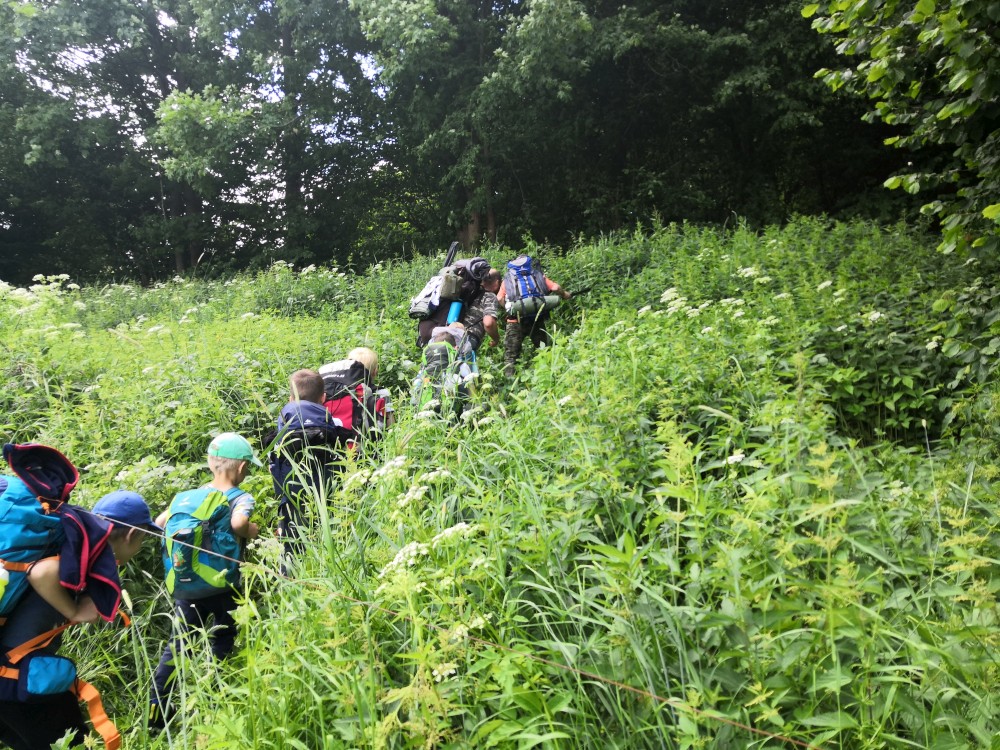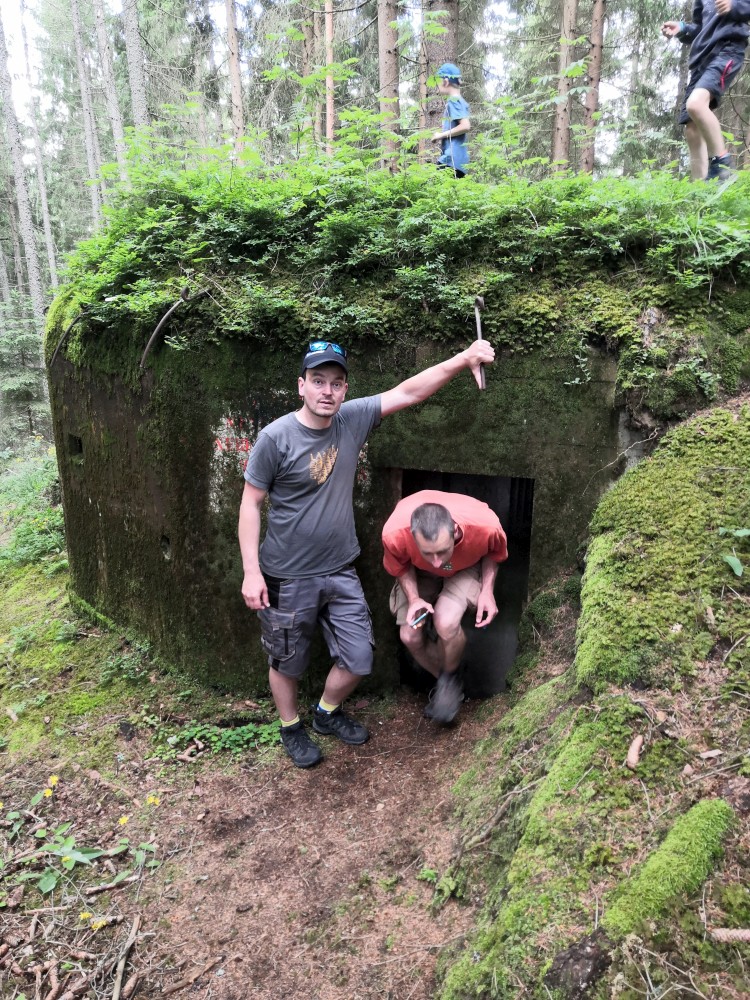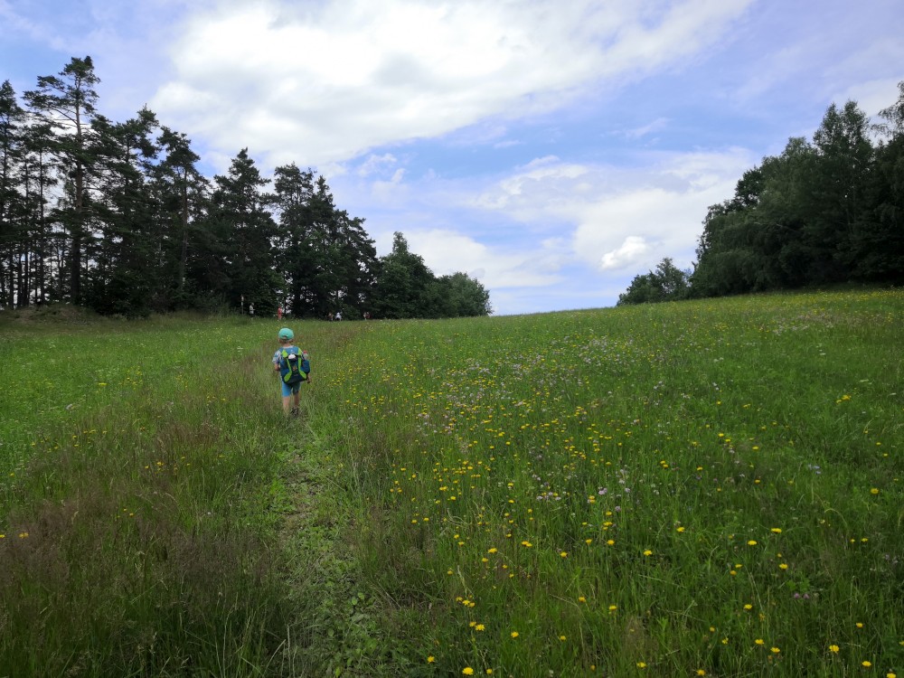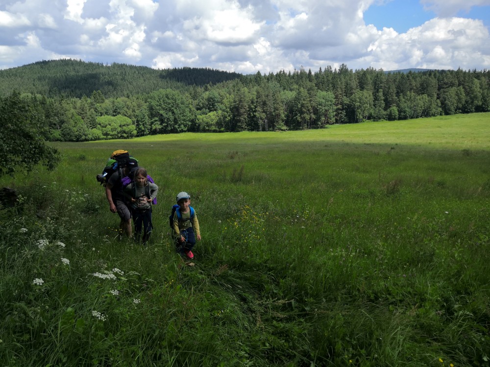Pak klesáme k Blanici a přecházíme jí přes lávku. Po modré pokračujeme vzhůru ke štolám. Děti chytají žáby v louži. Těsně před Cundrovicemi se odkláníme od modré a jdeme přímo přes louku ke zpevněné cestě vedoucí na Plešivec. Jirka využívá svou mačetu a prosekává nám cestu vysokými kopřivami.