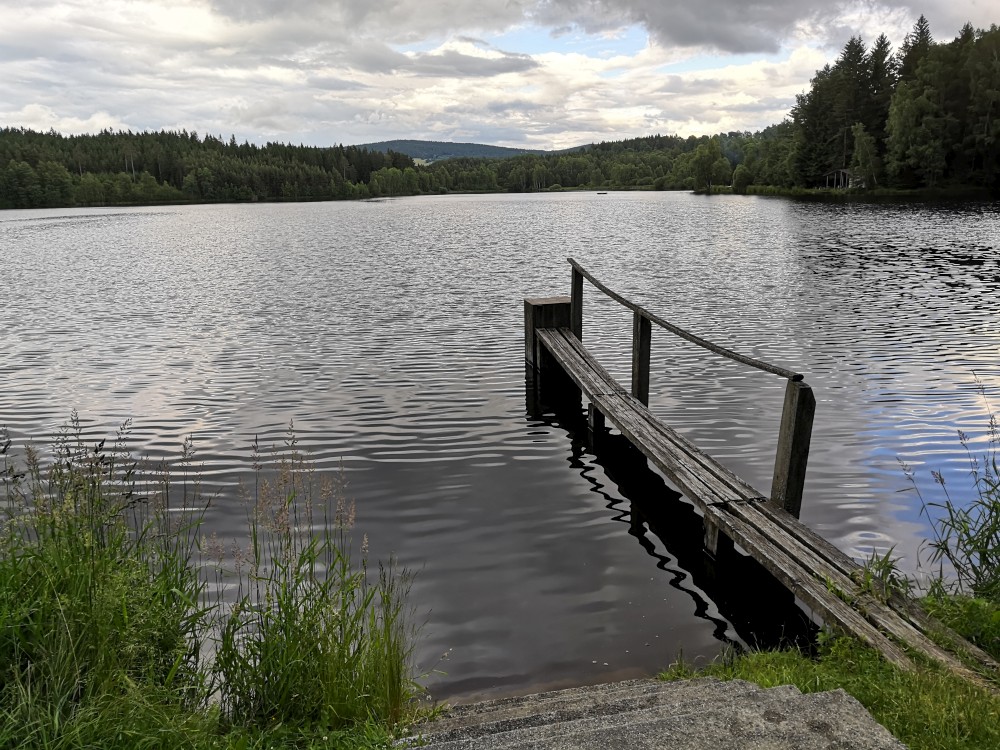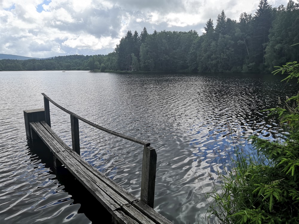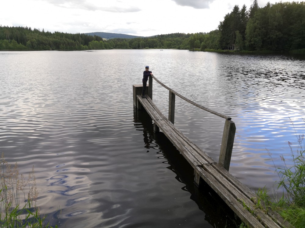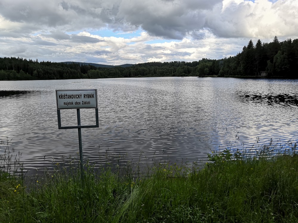 Jdeme kousek po asfaltu a pak po modré turistické značce ke Křišťanovickému rybníku. Tak je otevřený kiosek u vody, který provozuje Josef z Českých Budějovic. Jirka s Pepou ho znají. Dáváme si pivko, děti limonády. Děti si hrají u vody, my vymýšlíme plán co dál.