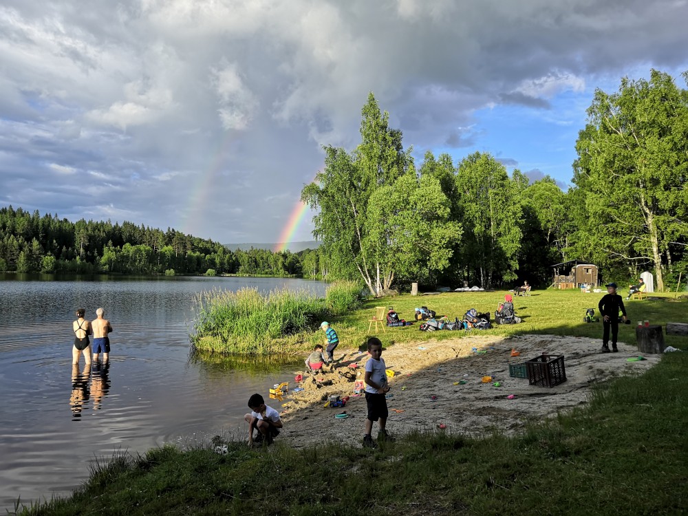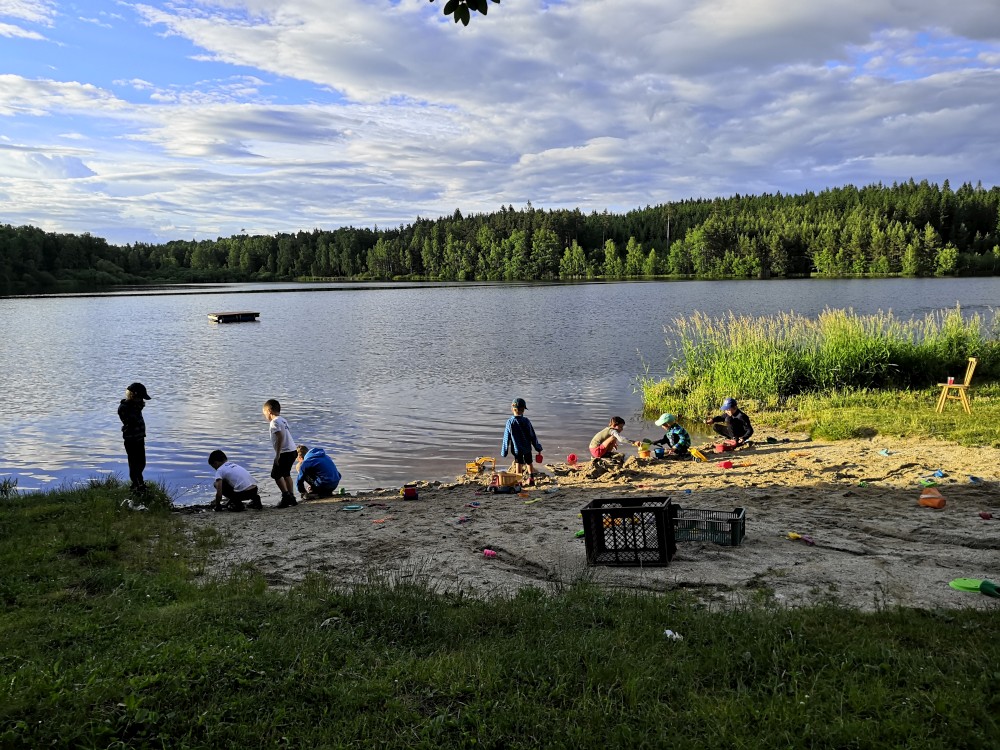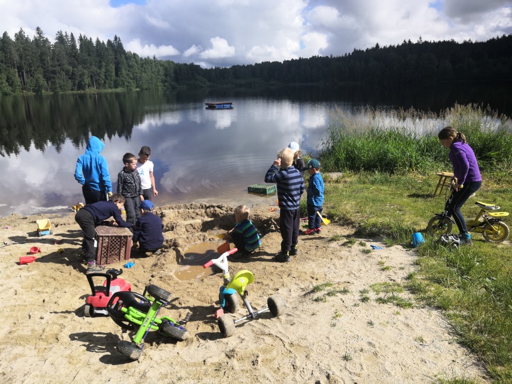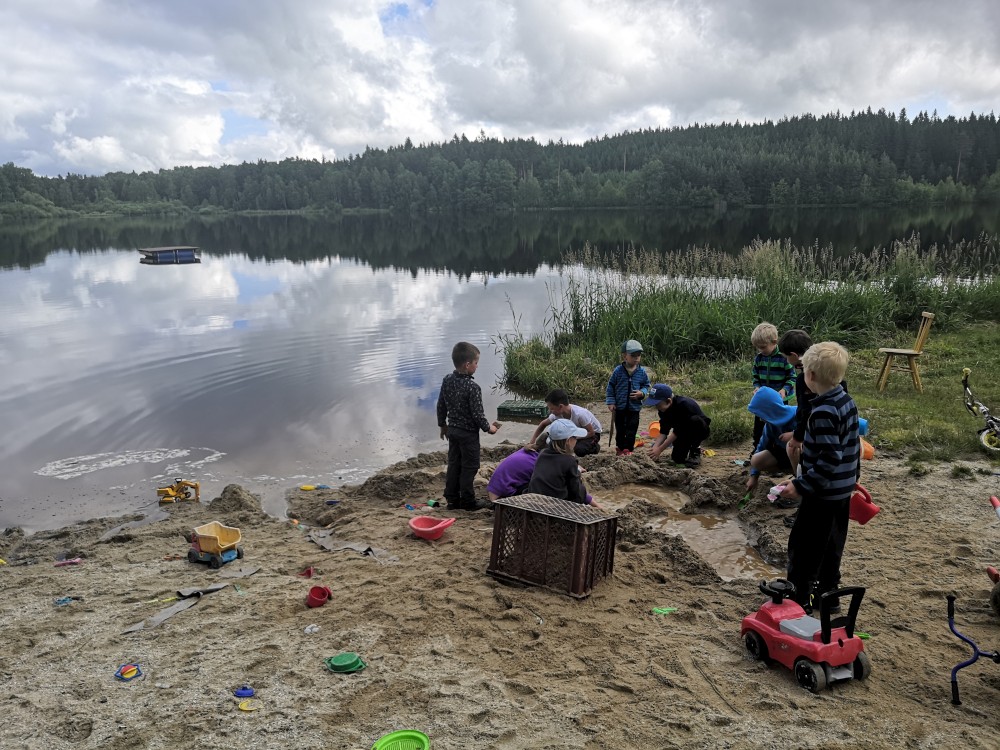 V sobotu ráno děláme přímo na terase čaj, dáváme snídani. Balíme se a jdeme zase ke kiosku. Děti staví přehrady na písečné pláži, mi si dáváme jedno pivko a čekáme na Jiřinu s Adélkou. Ten se k nám za chvíli připojuje. Můžeme tedy vyrazit.