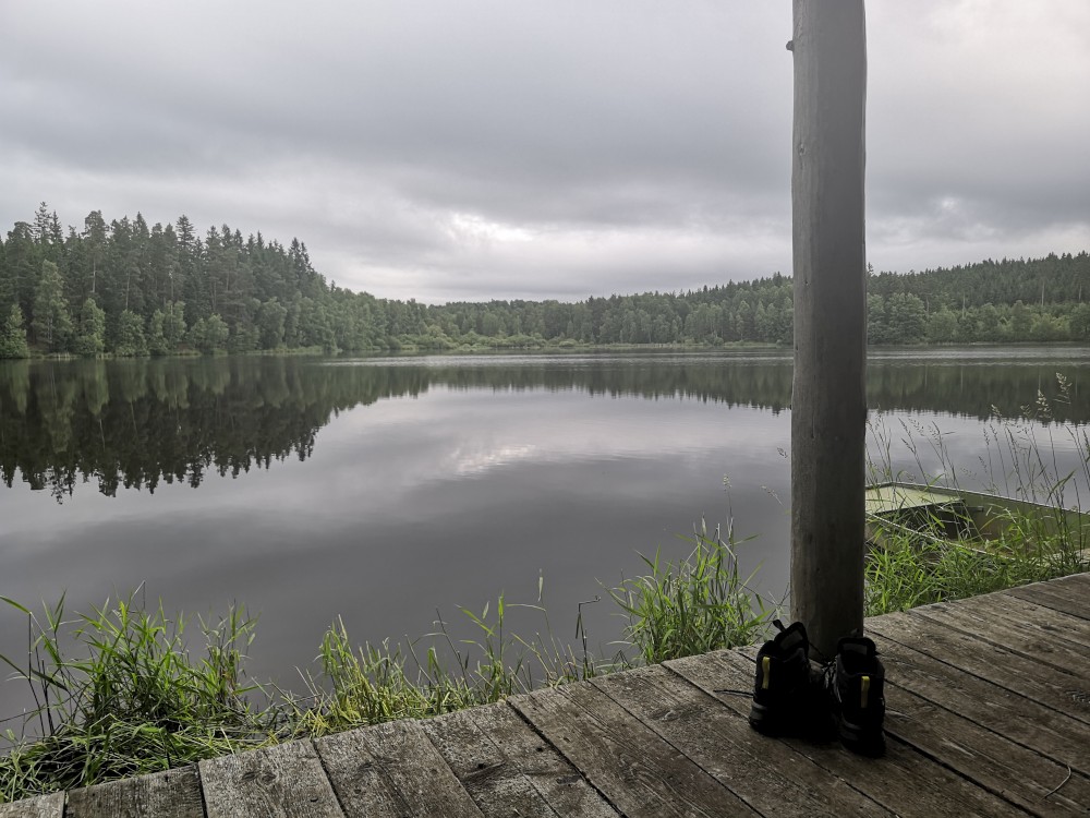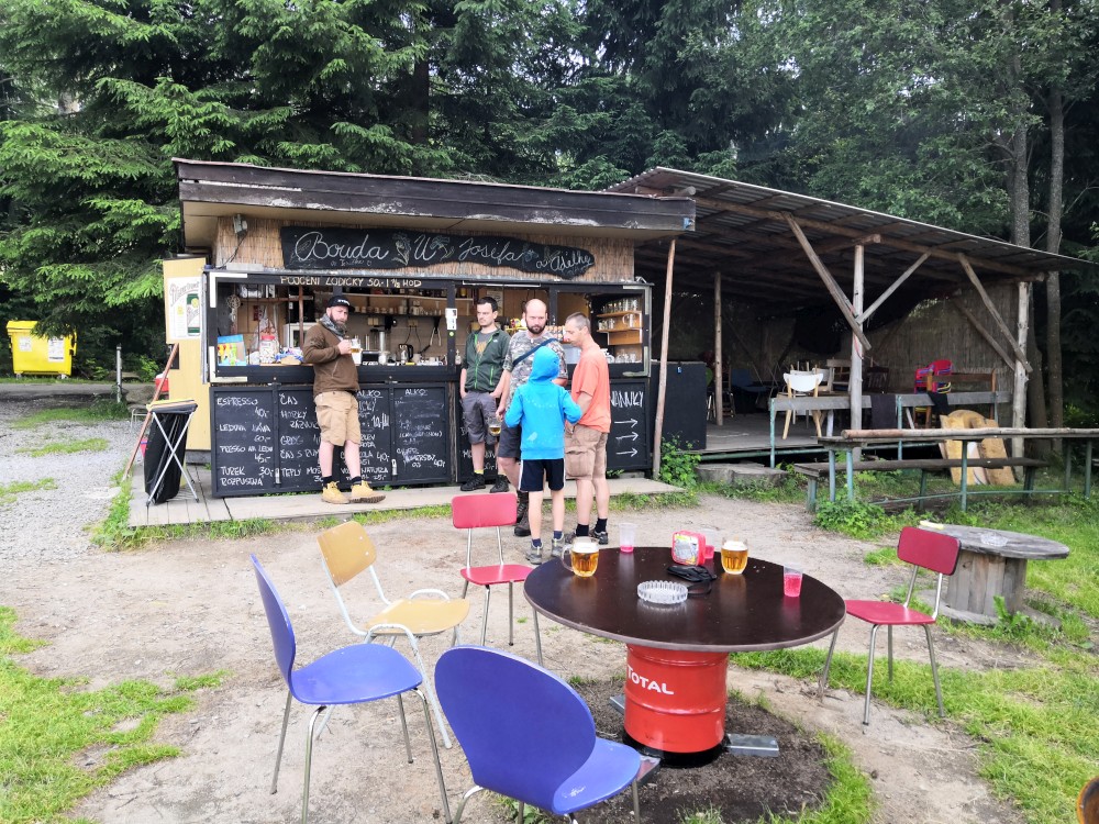 U kiosku hoří oheň. Ten by se nám hodil na opečení kuřecích paliček v alobalu. Ale není tu kemp a než se setmí, potřebujeme najít nějaké místo na spaní. Situace se elegantně vyřešila. Asi sto metrů od kiosku je rybárna na břehu rybníka se skvělou velkou terasou, kde se dá přespat. Připravujeme tam tedy ležení a jdeme opéct kuřata.
