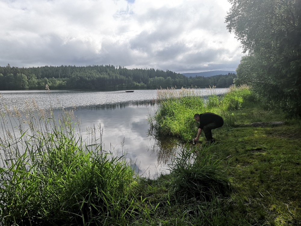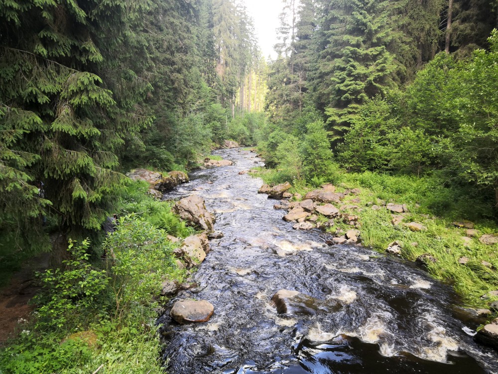 Oběd dáváme kousek před Plešivcem. Děláme kuskus s tuňákem. Po obědě pokračujeme přes Plešivec dále k soutoku Křemenného potoka s Blanicí. Dostáváme se k naučné stezce na soutoku. Začínáme hledat dnešní kempoviště. Dlouho se nám to nedaří. U řeky to nikde nejde, když už se kousek nad řekou objeví louka, jsou na ní krávy ve výběhu.
