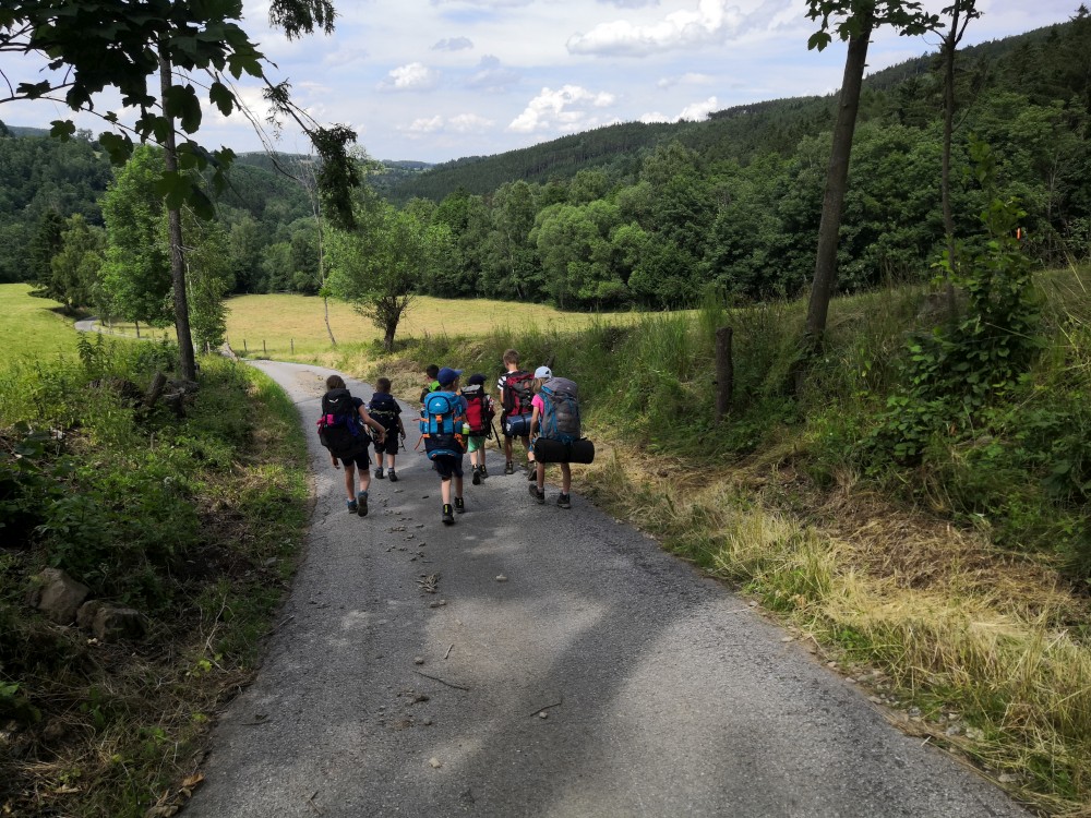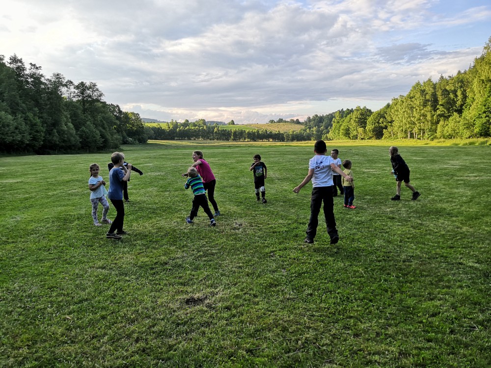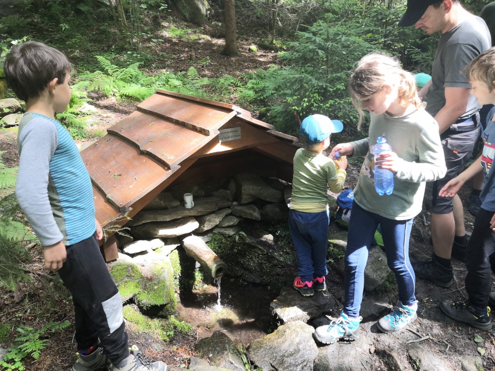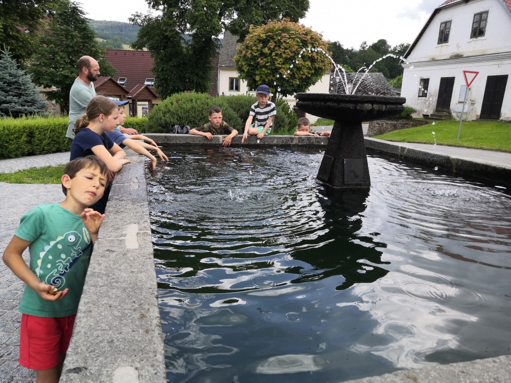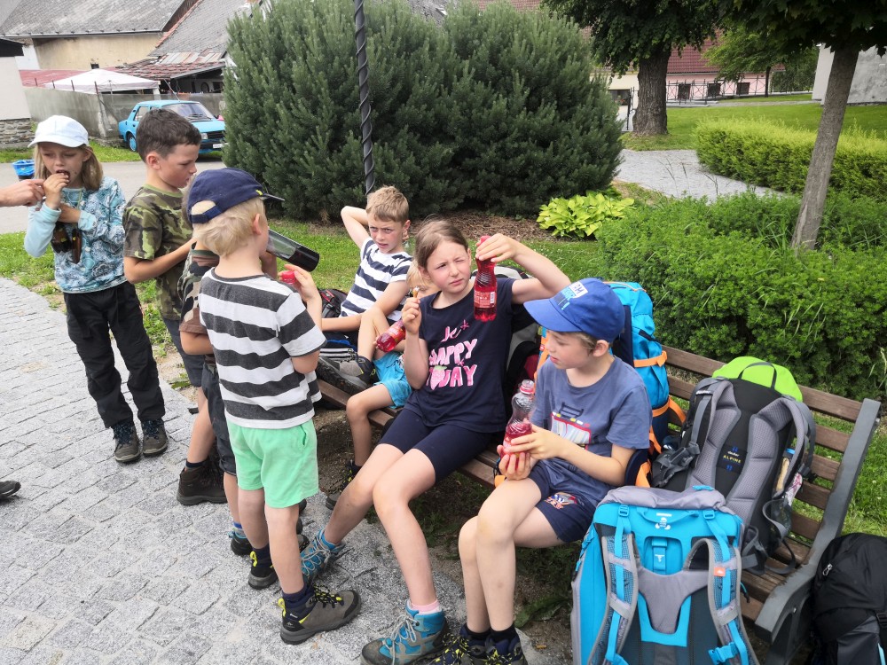 Občerstvujeme se u kašny. Přichází k nám místní paní a dává všem deseti dětem nanuka. Viděla nás na návsi, našla doma nanuky a dětem je darovala. Nic za to nechtěla, úžasné. Už máme hlad. Oběd si budeme vařit sami. Vyrážíme tedy najít nějaké hezké místo.