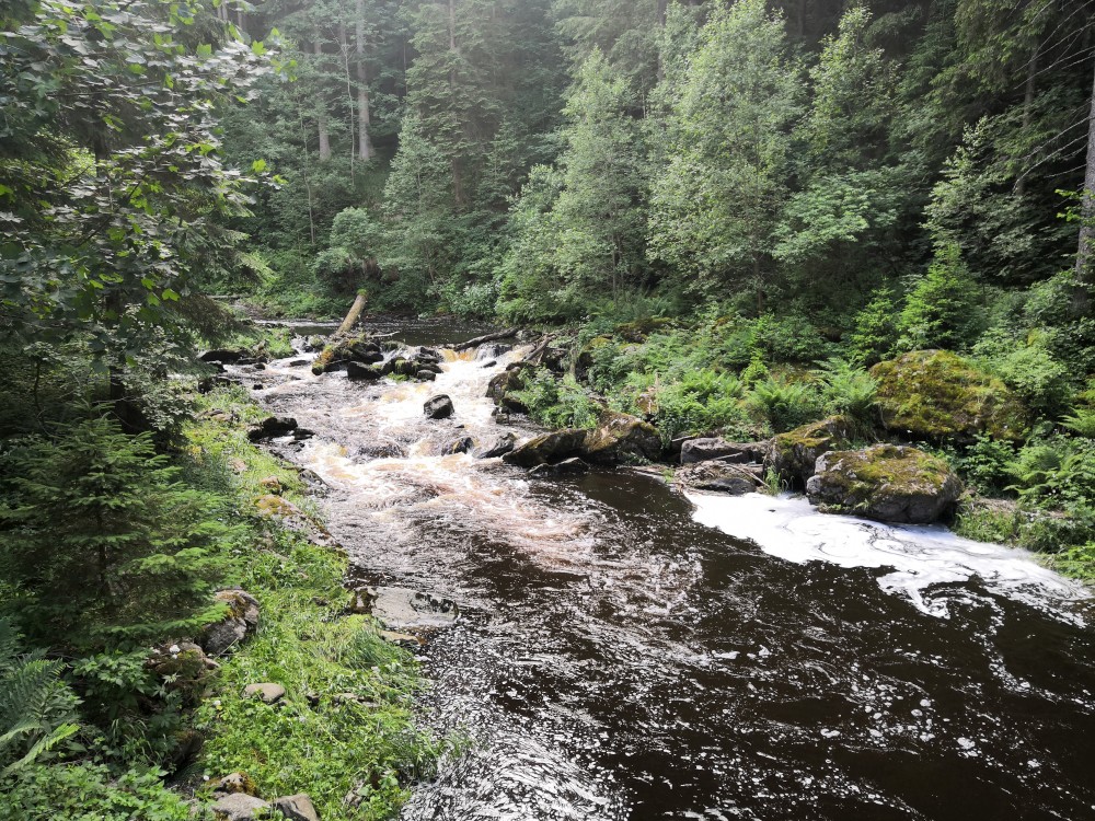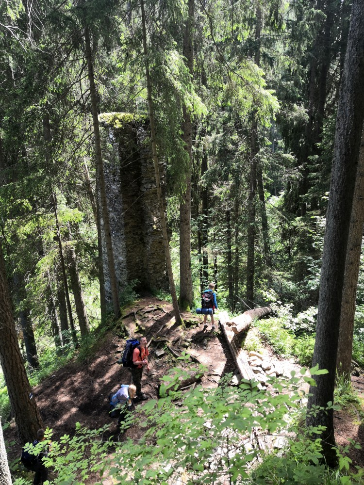 Jdeme zpět ke kempu k modré turistické značce a jdeme po ní přes Kouzelnou studánku až na zříceninu hradu Hus. Je to moc zajímavé místo. Z hradu toho již moc nezbylo. Hrad ale musel být dost rozlehlý a na hodně ostrém výběžku nad řekou. Srázy z hradu k řece Blanici i na druhou stranu jsou opravdu prudké.