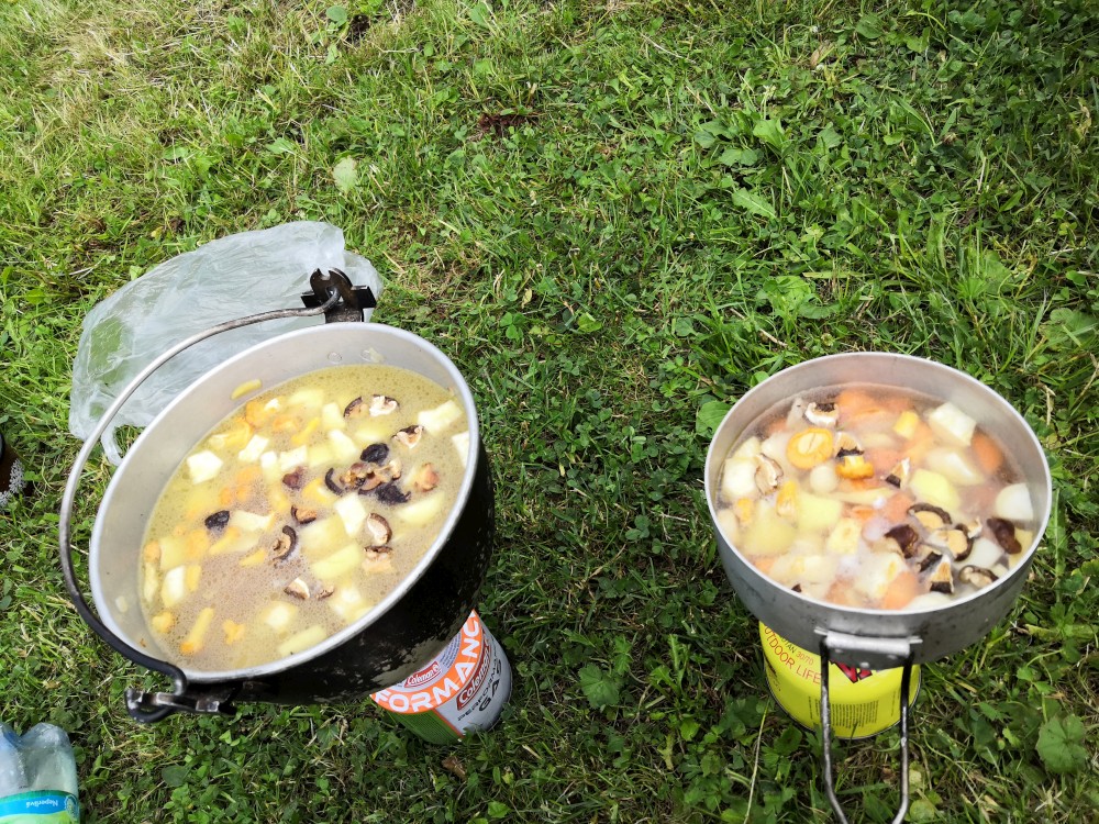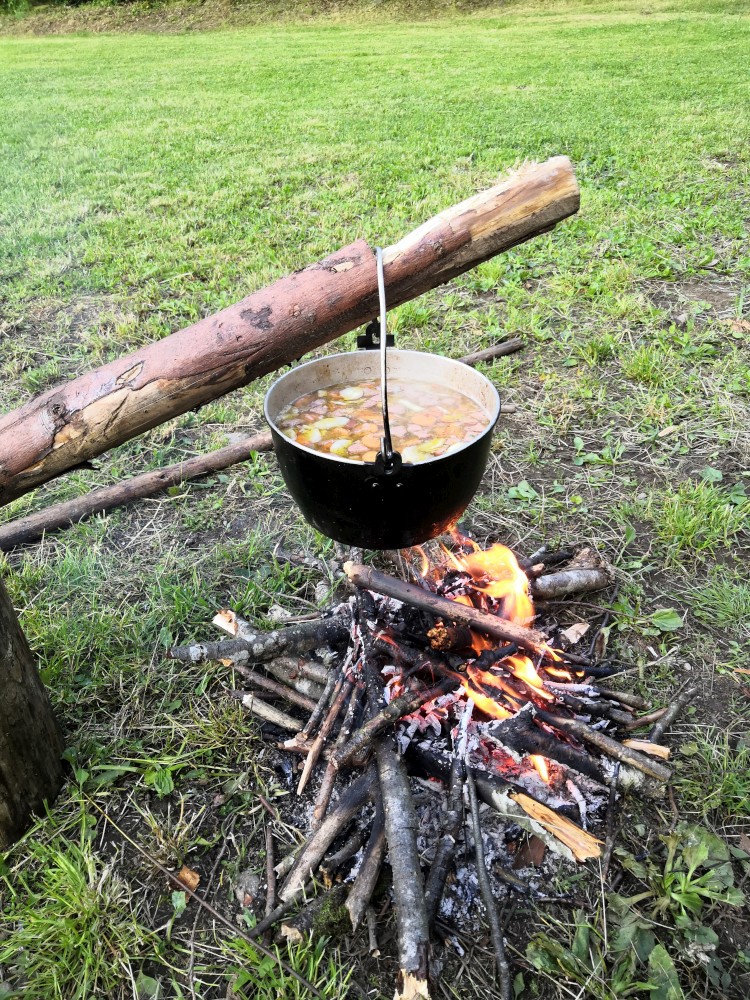 Vaříme bramboračku. I s liškama, které jsme přes den nasbírali. Večer uspáváme děti, pak děláme oheň. Láďa došel do nedaleké obce pro pivo, takže máme u ohně i co pít.