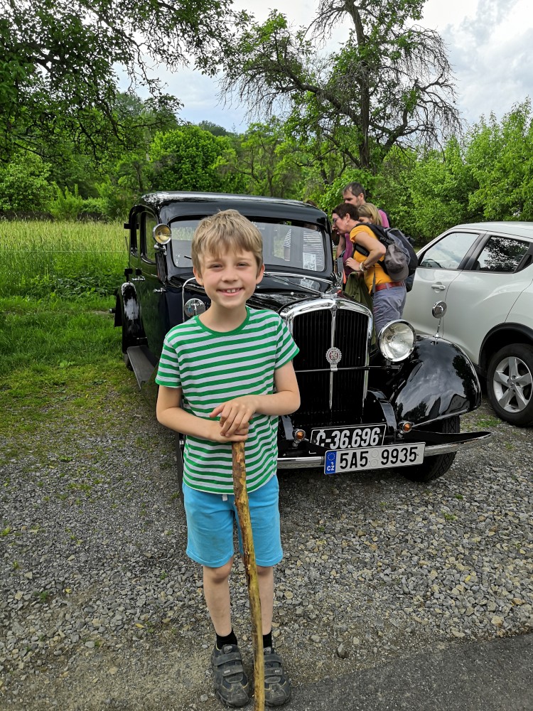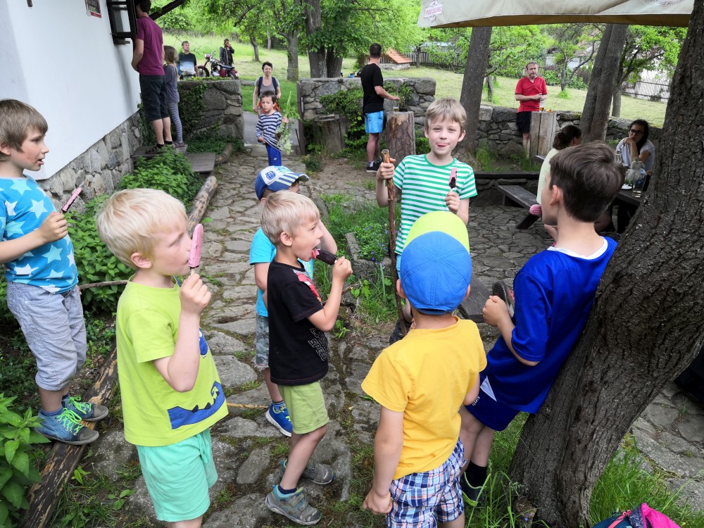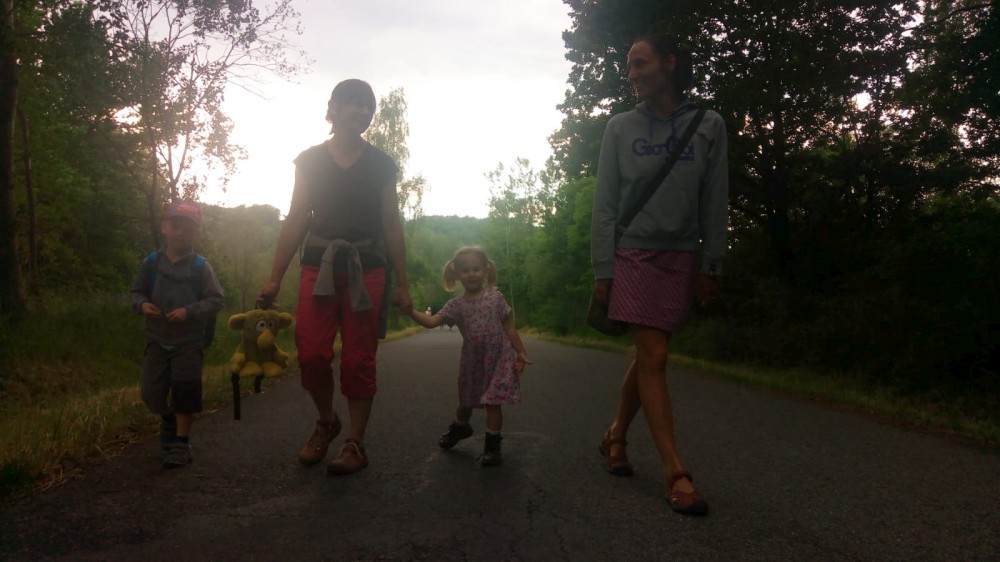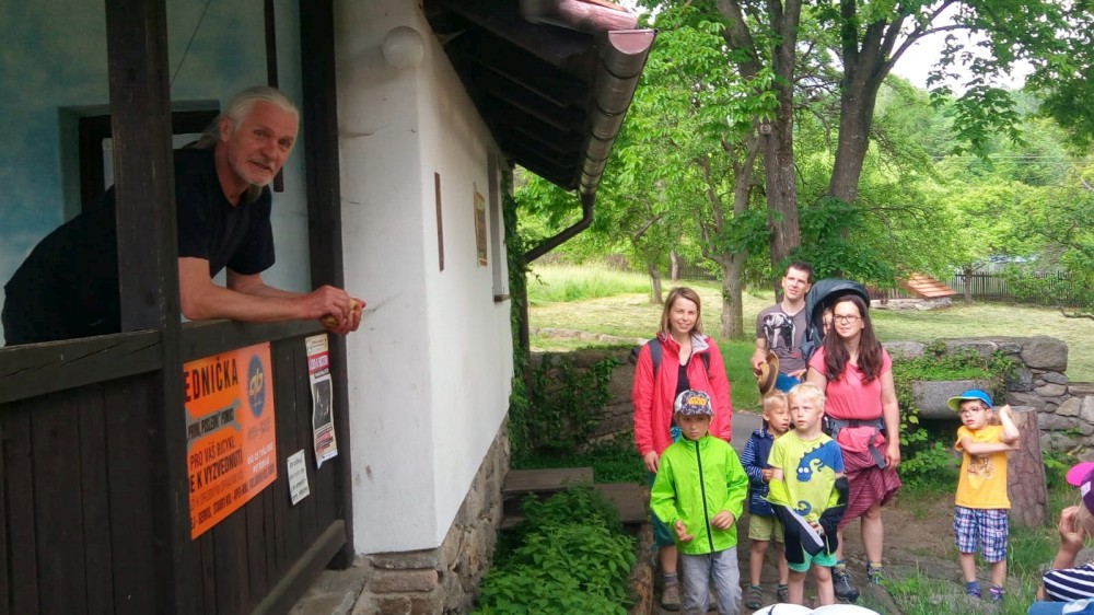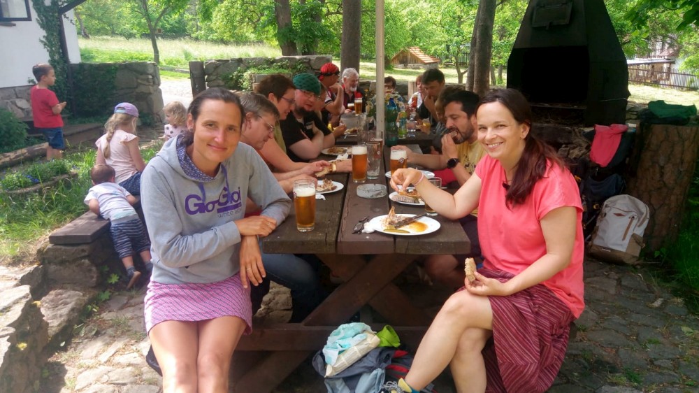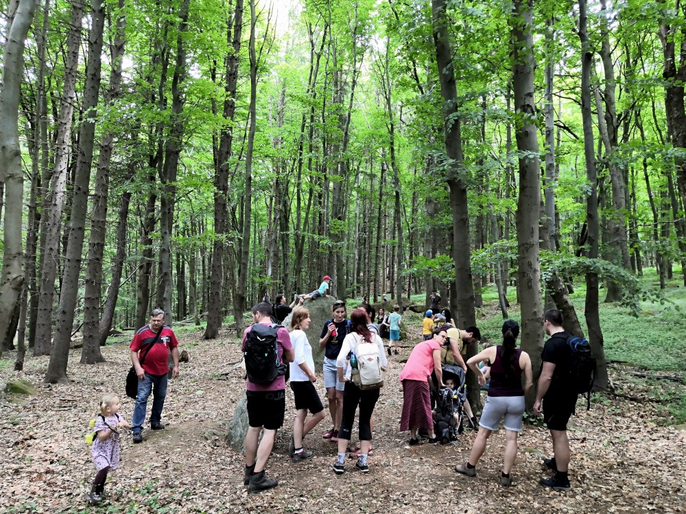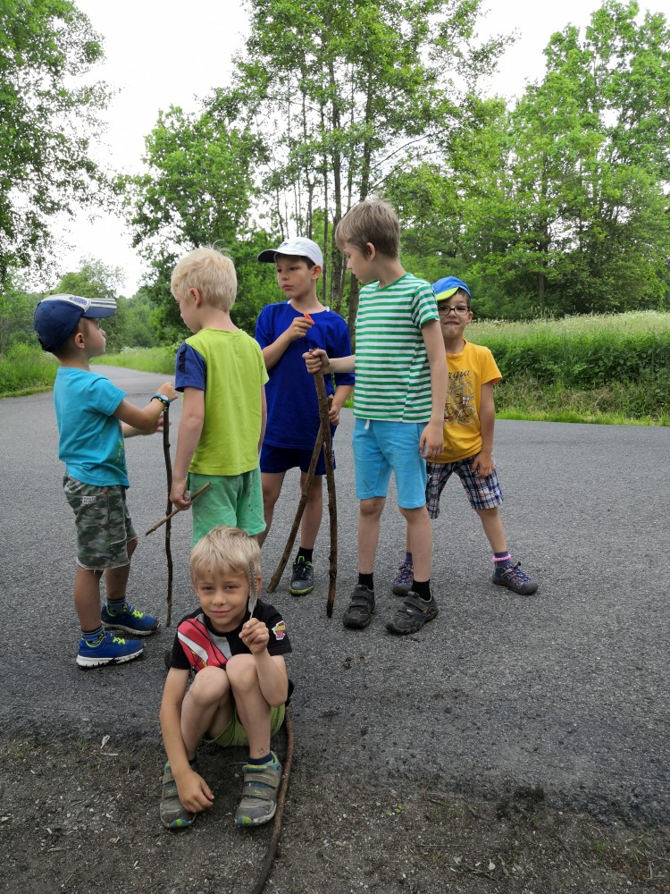 V sobotu jdeme na výlet. Připojuje se k nám Pepa Maroušek s rodinou, Míla a Kultovka. Jsme velká skupina, s dětmi různých věků. Naše tempo není moc rychlé. Jdeme nejdříve na Chlístovské menhiry, pak kousek po silnici a pak lesní cestou do Veletína. Tam máme v hospodě Za pecí domluven oběd - bramboračka a pečené kuře s chlebem. Dáváme také pivko nebo nanuky. Připojuje se k nám Láďa s rodinkou a Lucka Svitáků s holčičkama, kteří s námi v pátek neslavili.