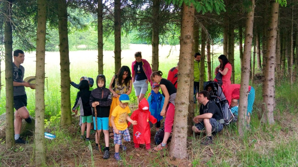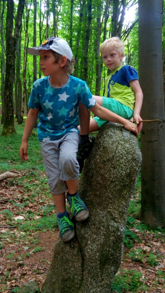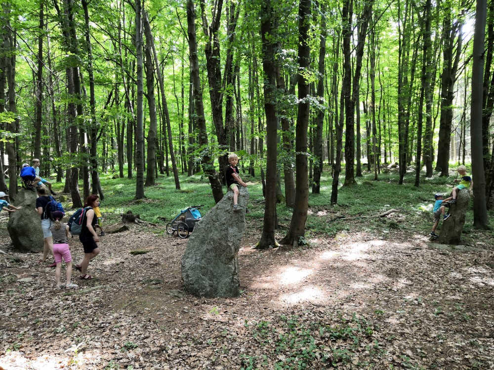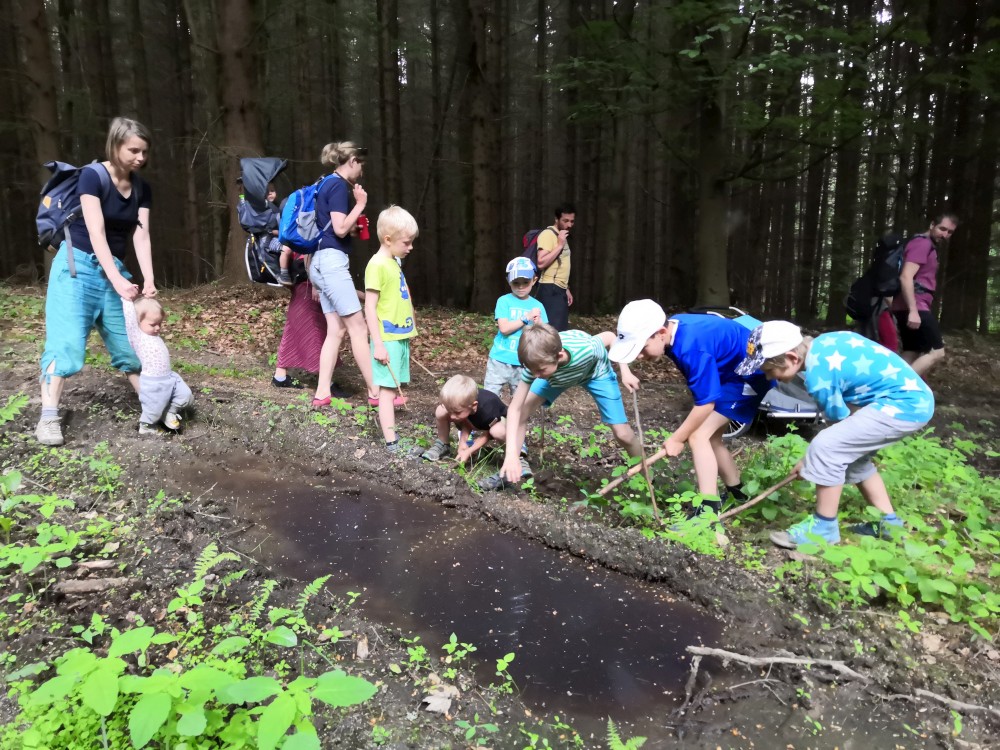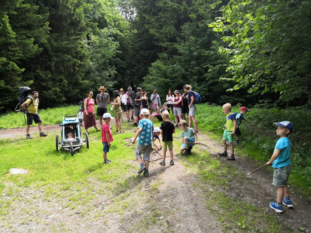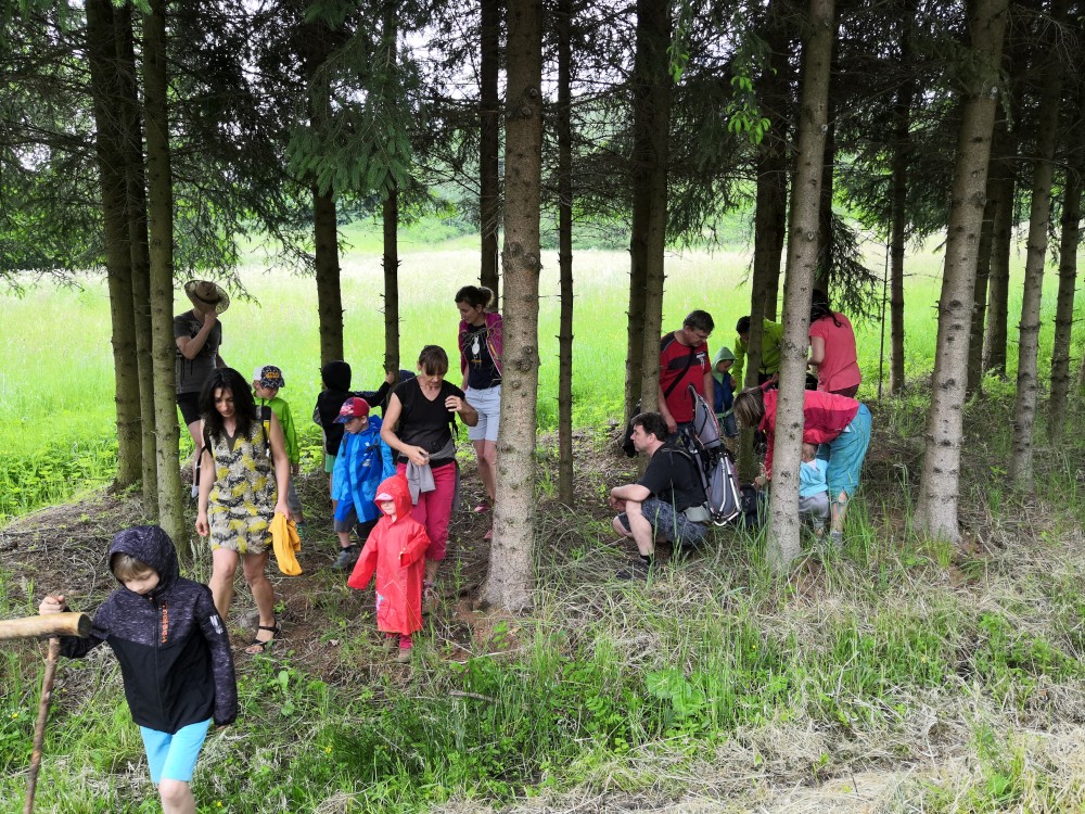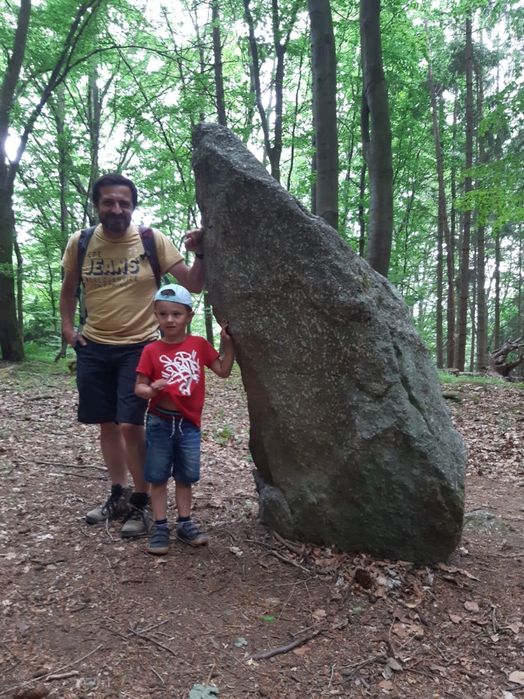 V sobotu jdeme na výlet. Připojuje se k nám Pepa Maroušek s rodinou, Míla a Kultovka. Jsme velká skupina, s dětmi různých věků. Naše tempo není moc rychlé. Jdeme nejdříve na Chlístovské menhiry, pak kousek po silnici a pak lesní cestou do Veletína. Tam máme v hospodě Za pecí domluven oběd - bramboračka a pečené kuře s chlebem. Dáváme také pivko nebo nanuky. Připojuje se k nám Láďa s rodinkou a Lucka Svitáků s holčičkama, kteří s námi v pátek neslavili.