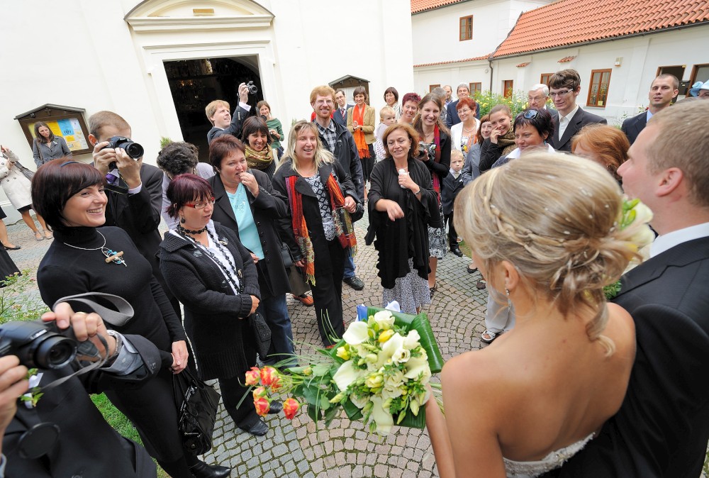 Focení svatebčanů před kostelem