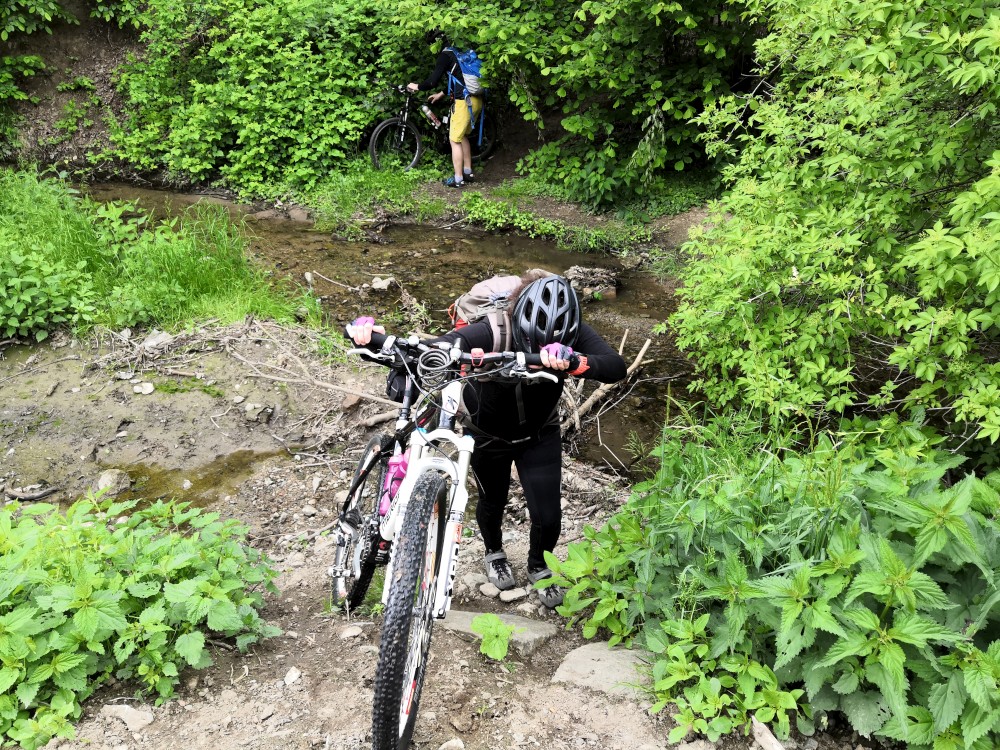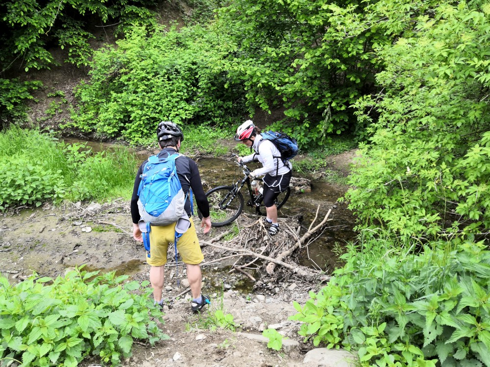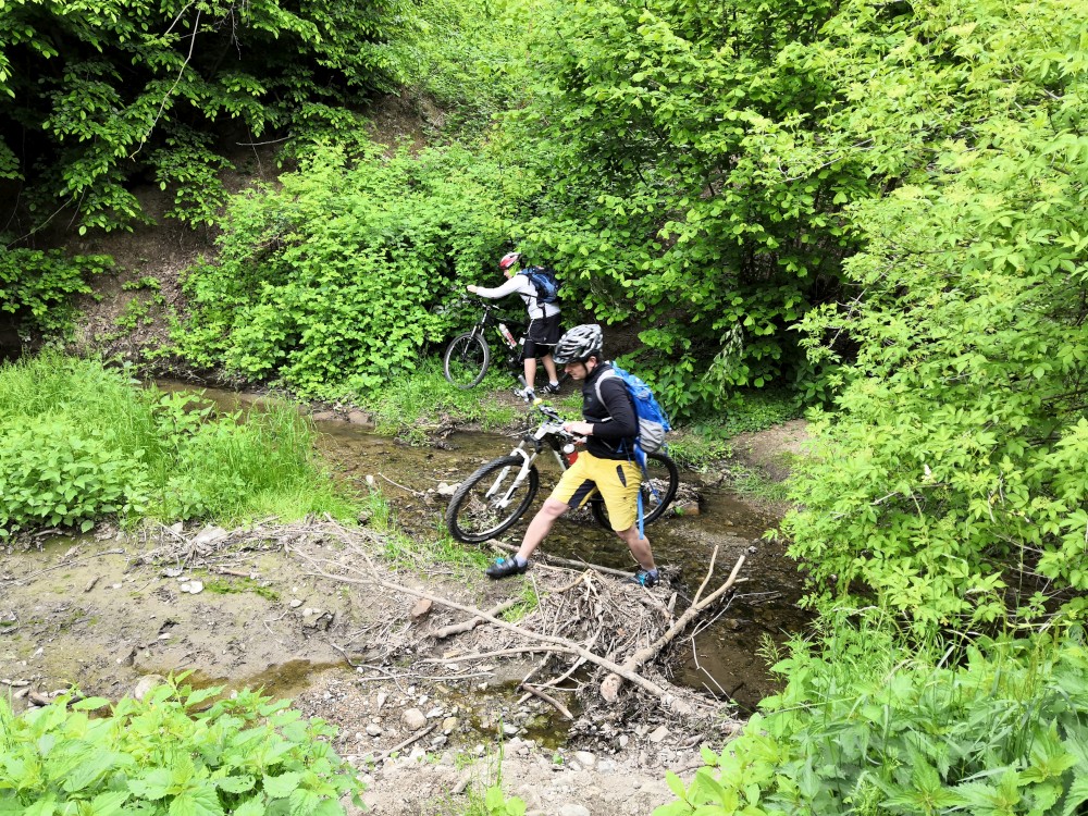 Pokračujeme na po modré. Dolů k přehradě sjíždíme křížovou cestou Chudčice. Další stanoviště je Panáčkova skála. Je tam parabola vysílající hádanku doprostřed přehrady. Nemusíme se naštěstí koupat. Část hádanky slyšíme ze břehu a výsledek si domyslíme. Přes hrad Veveří jedeme za ostatním na Prádelnu, kde si dáváme občerstvení a oběd.