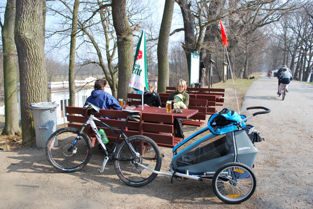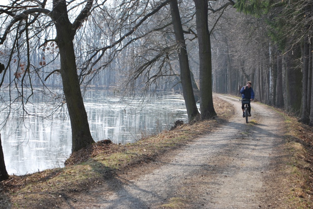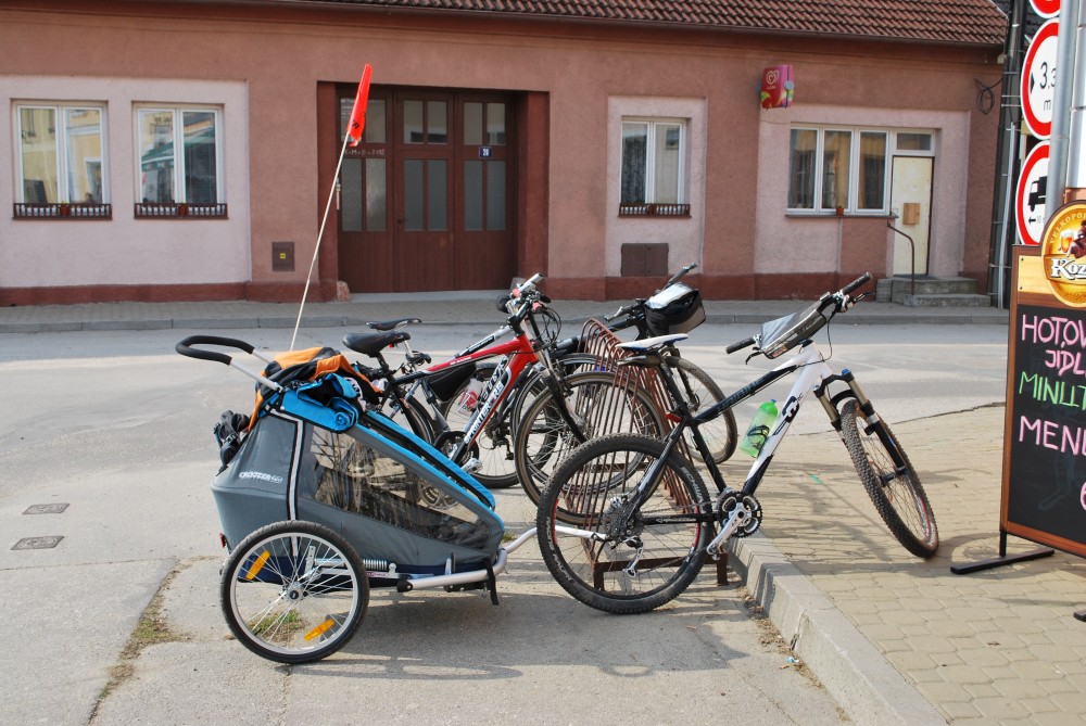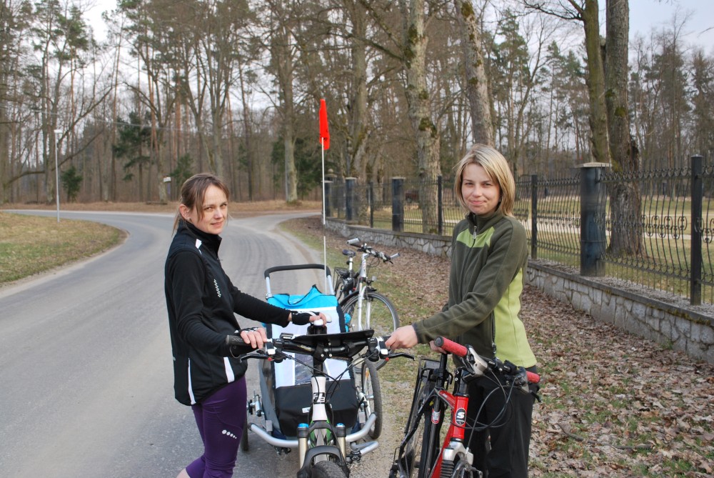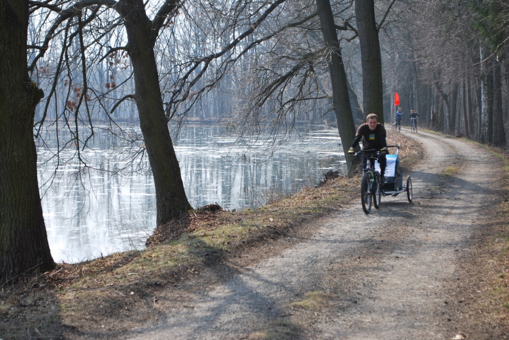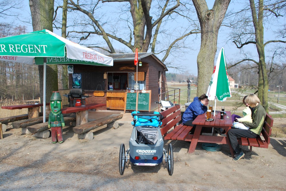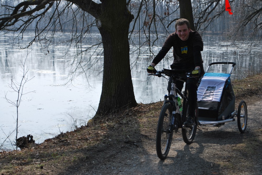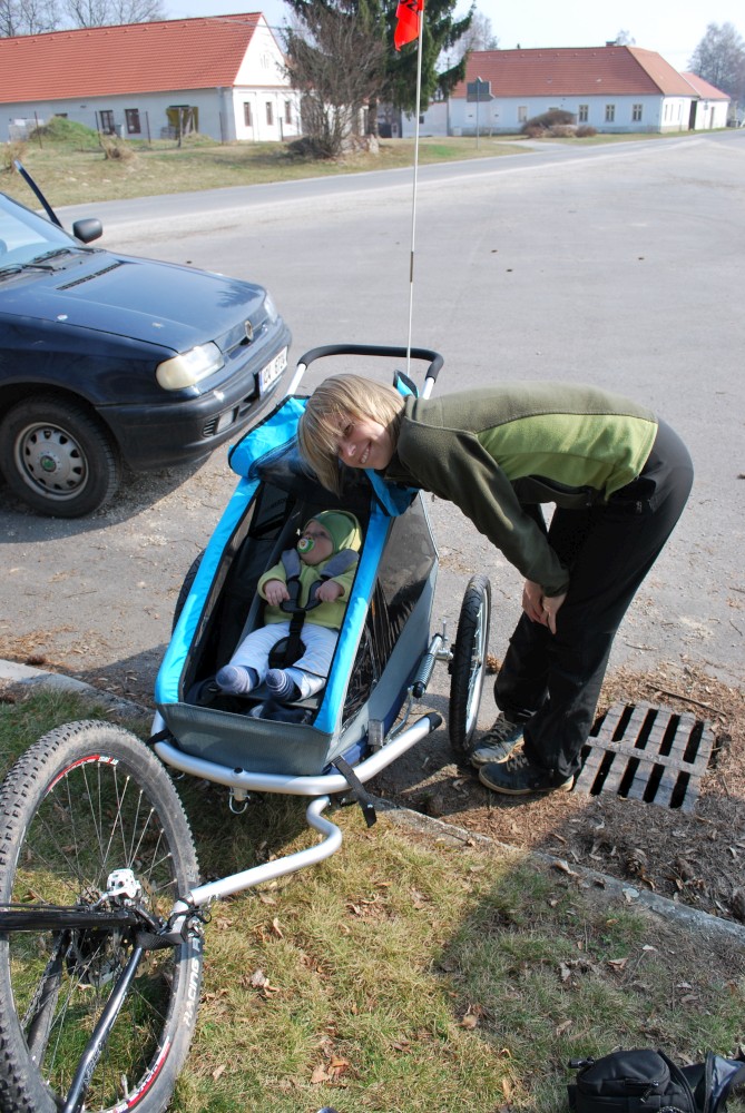Dnes vyrážíme s Víťou poprvé na kolo. Na běžkách se Víťovi líbilo, tak doufáme, že se mu bude líbit i za kolem. Z vozíku jsme odmontovali zimní výbavu a namontovali kola a speciální odpružení. Vyrážíme na Třeboňsko. Startovat budeme z vesničky Lužnice. Jede s námi Petr s Blankou. Kolem desáté jsme se všichni sešli na návsi. Počasí nám přeje. Je krásně, svítí sluníčko. Vyndaláme kola, zapojujeme vozík a vyrážíme směrem k hrázi Rožmberka.