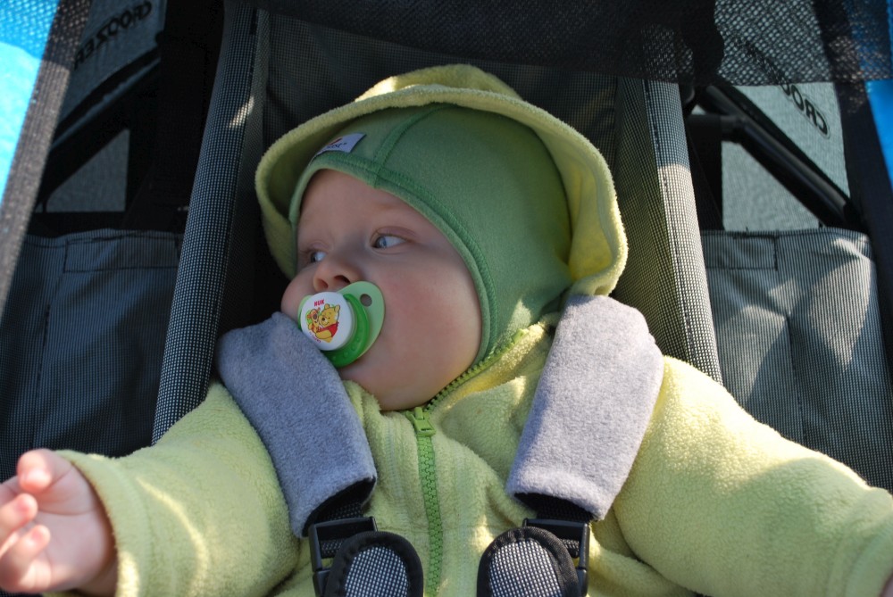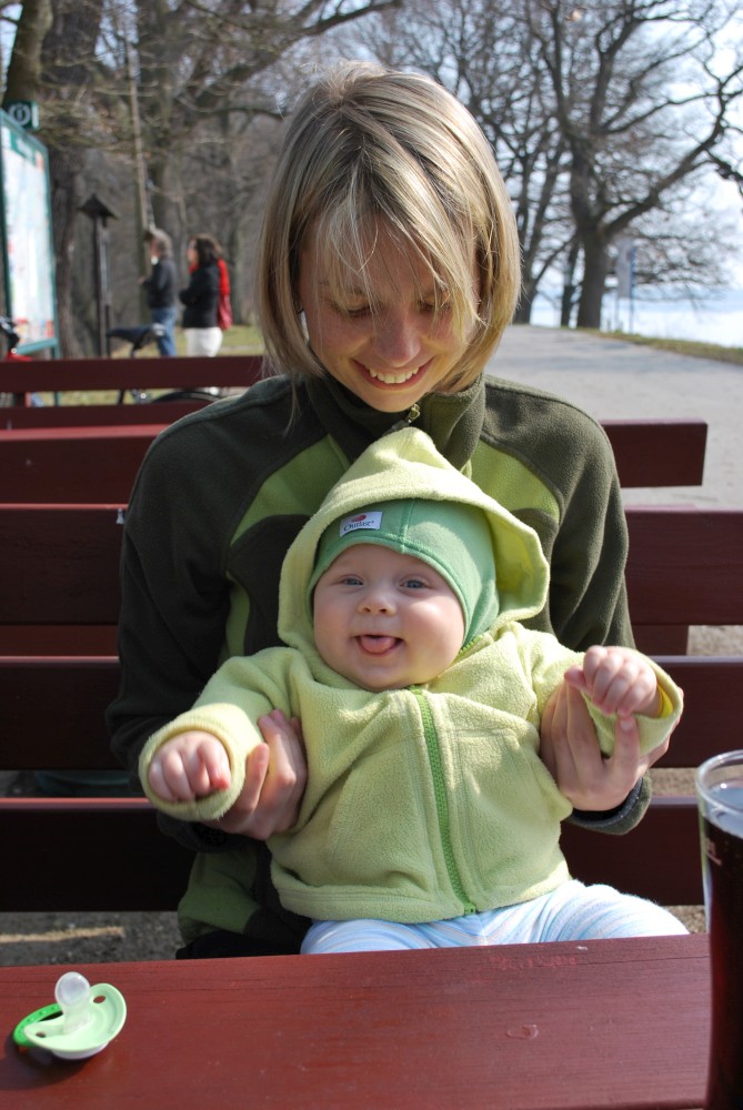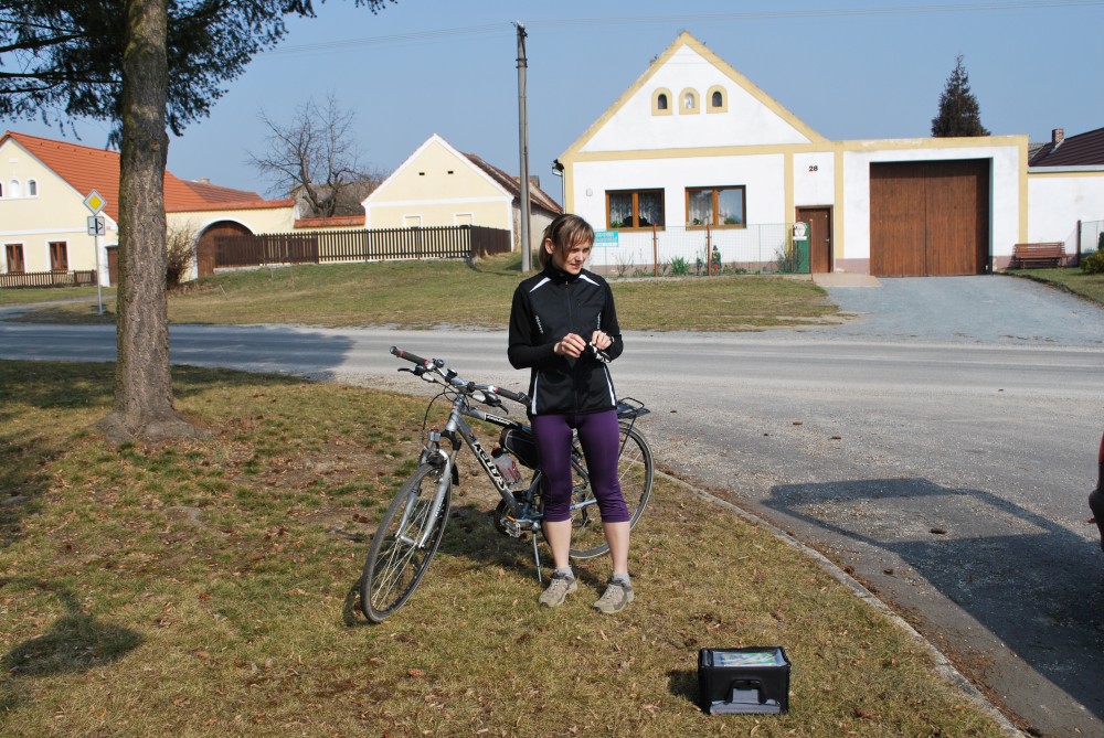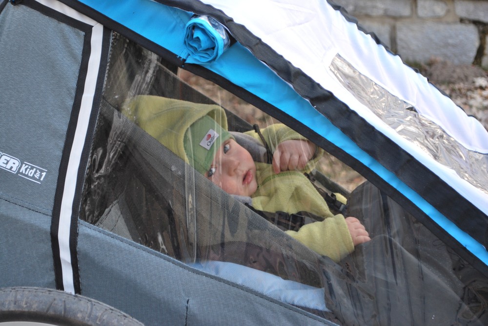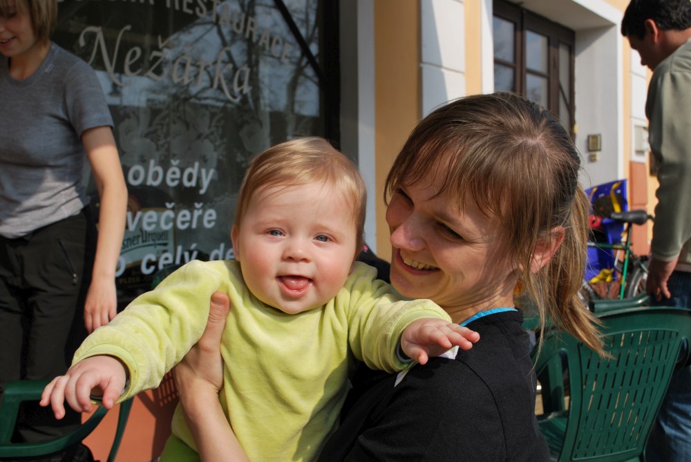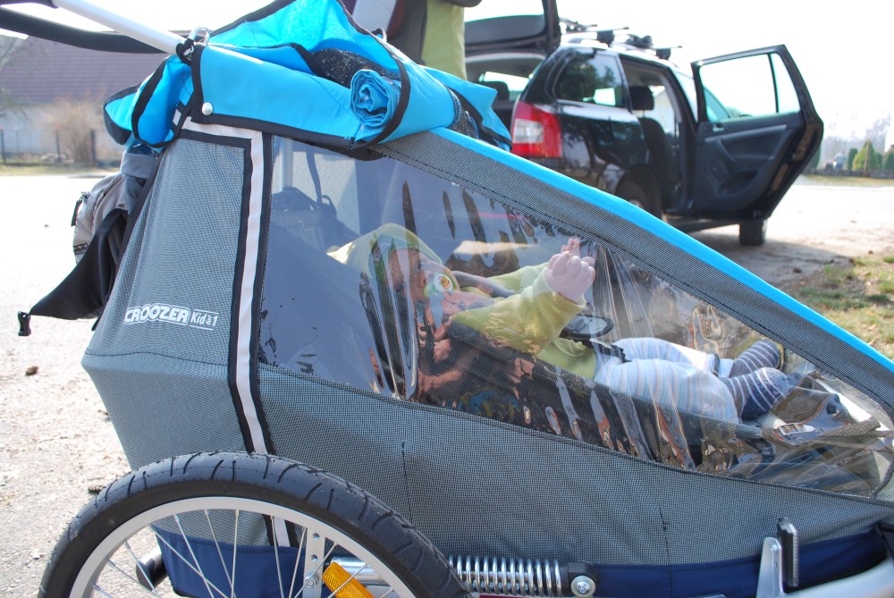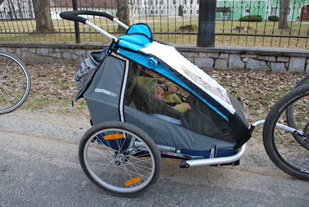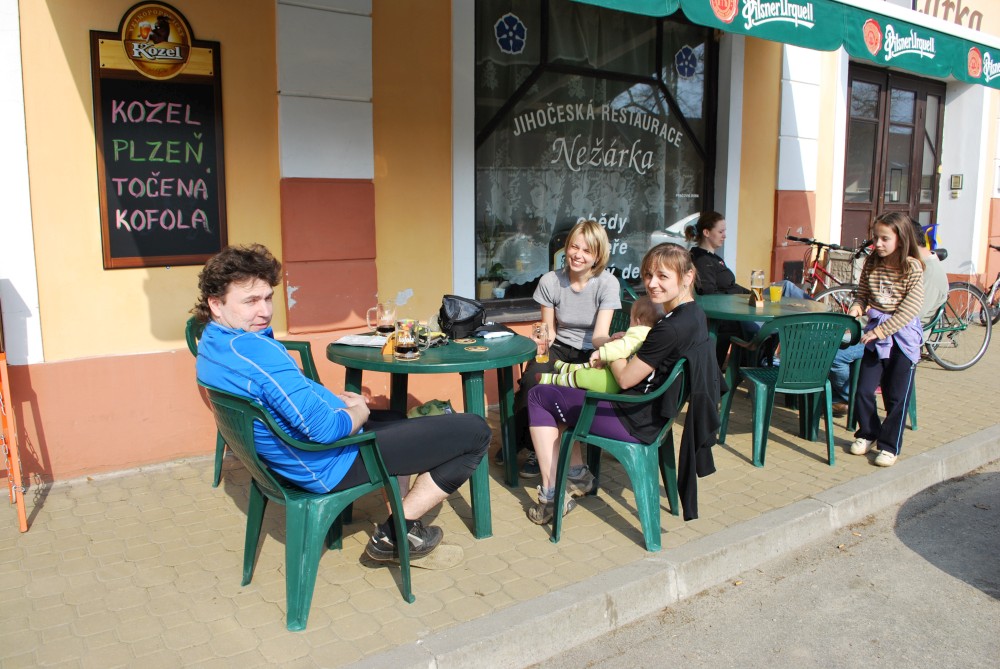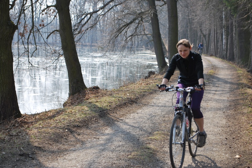 Dnes vyrážíme s Víťou poprvé na kolo. Na běžkách se Víťovi líbilo, tak doufáme, že se mu bude líbit i za kolem. Z vozíku jsme odmontovali zimní výbavu a namontovali kola a speciální odpružení. Vyrážíme na Třeboňsko. Startovat budeme z vesničky Lužnice. Jede s námi Petr s Blankou. Kolem desáté jsme se všichni sešli na návsi. Počasí nám přeje. Je krásně, svítí sluníčko. Vyndaláme kola, zapojujeme vozík a vyrážíme směrem k hrázi Rožmberka.