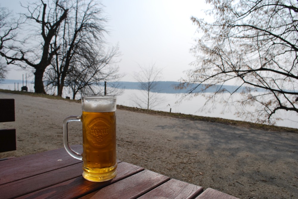 Již po dvou kilometrech jízdy nás čeká milé překvapení. Stánek na hrázi je otevřen. Tak to jsme nečekali. Byl by hřích nezastavit na jedno (dvě). Snídani doma jsme neměli moc vydatnou, takže jí na místě doplňujeme výbornou klobáskou.