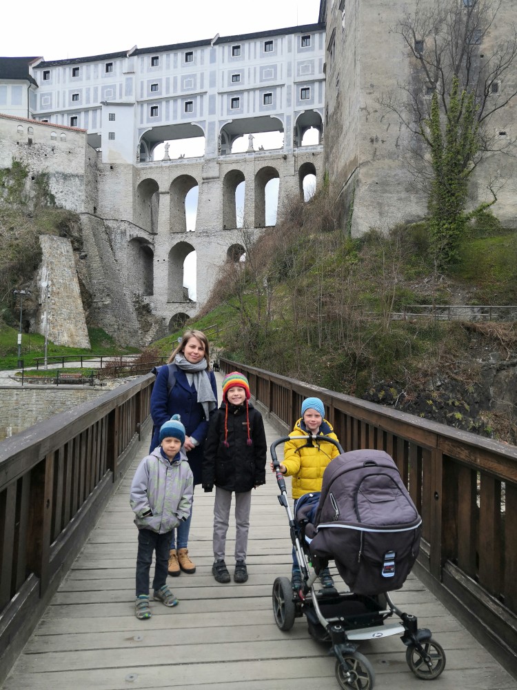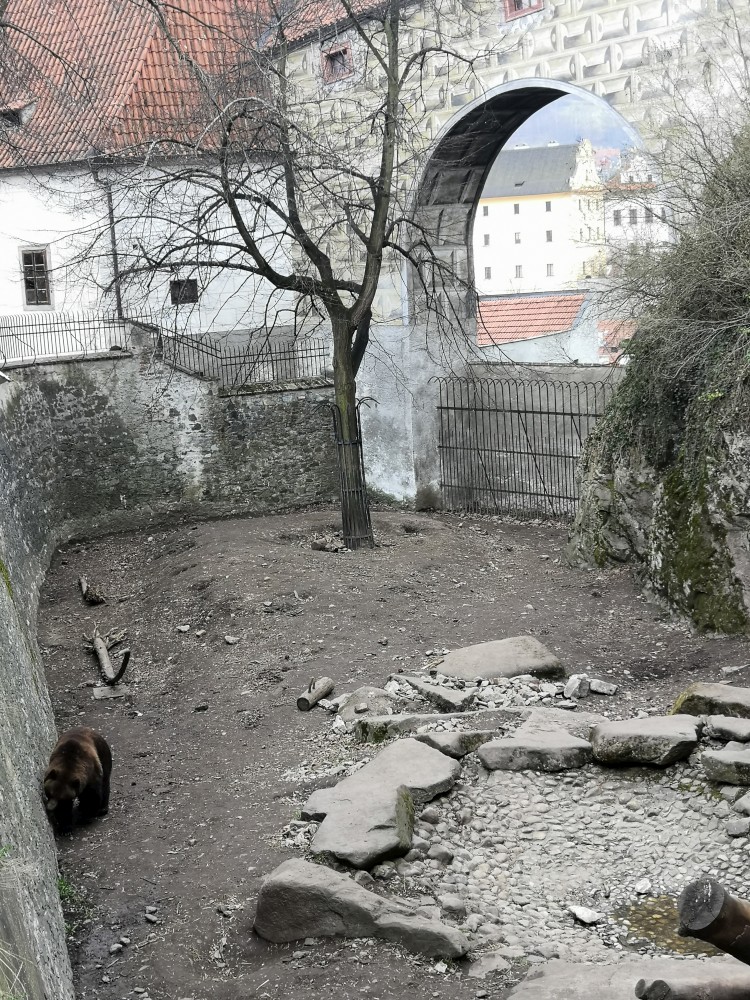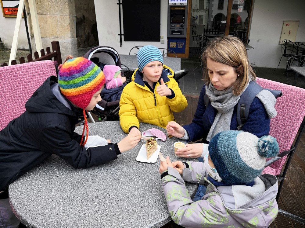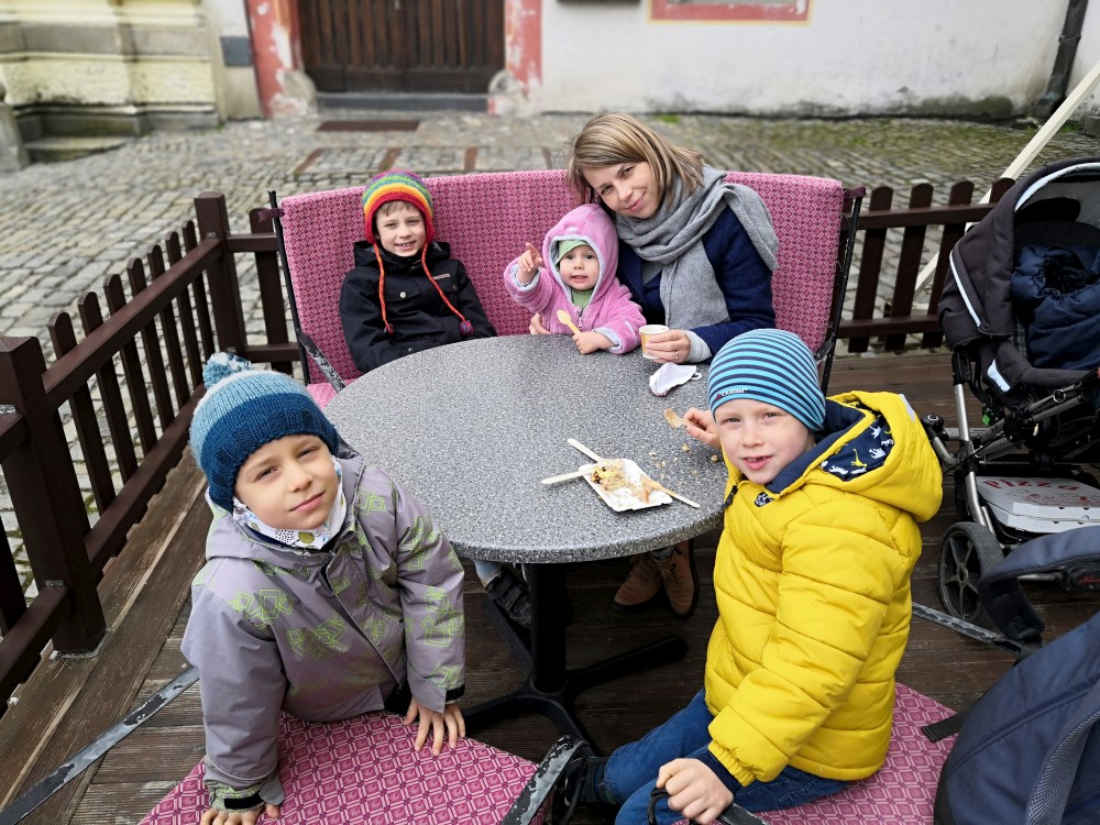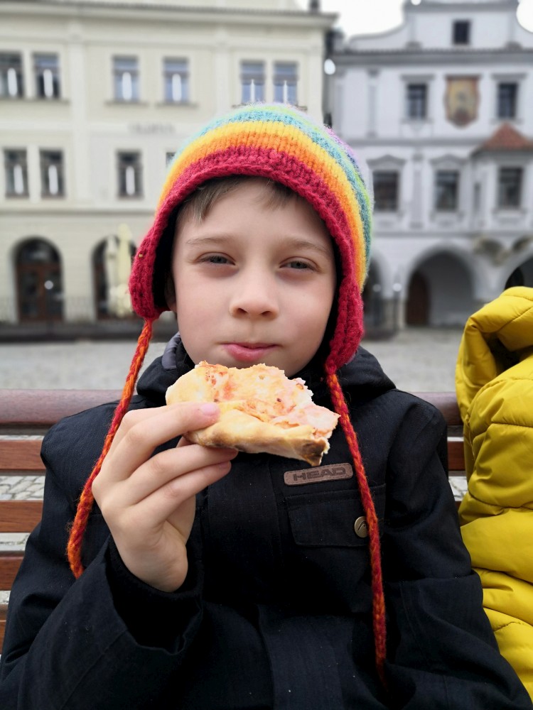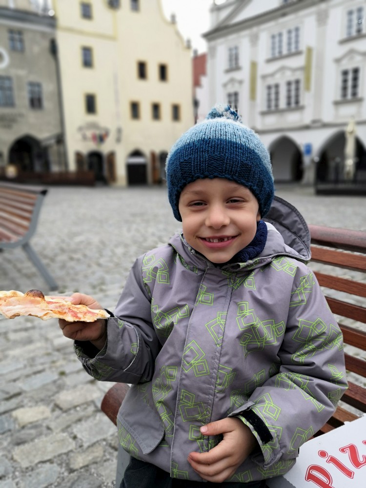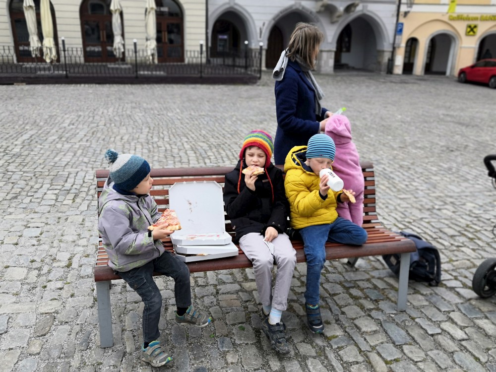V Horní ulici objednáváme pizzu a jdeme na náměstí Svobody. Tam sedáme na terasu kávu a dortíček, já jdu pro pizzu. Pizzu jíme na lavičkách na náměstí. Pak pokračujeme přes Lazebnický most na druhou stranu Vltavy. Procházíme staré uličky a pak se jdeme podívat na zámek na medvědy. Odtud se Jelení zahradou vracíme k autu.