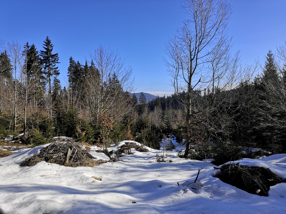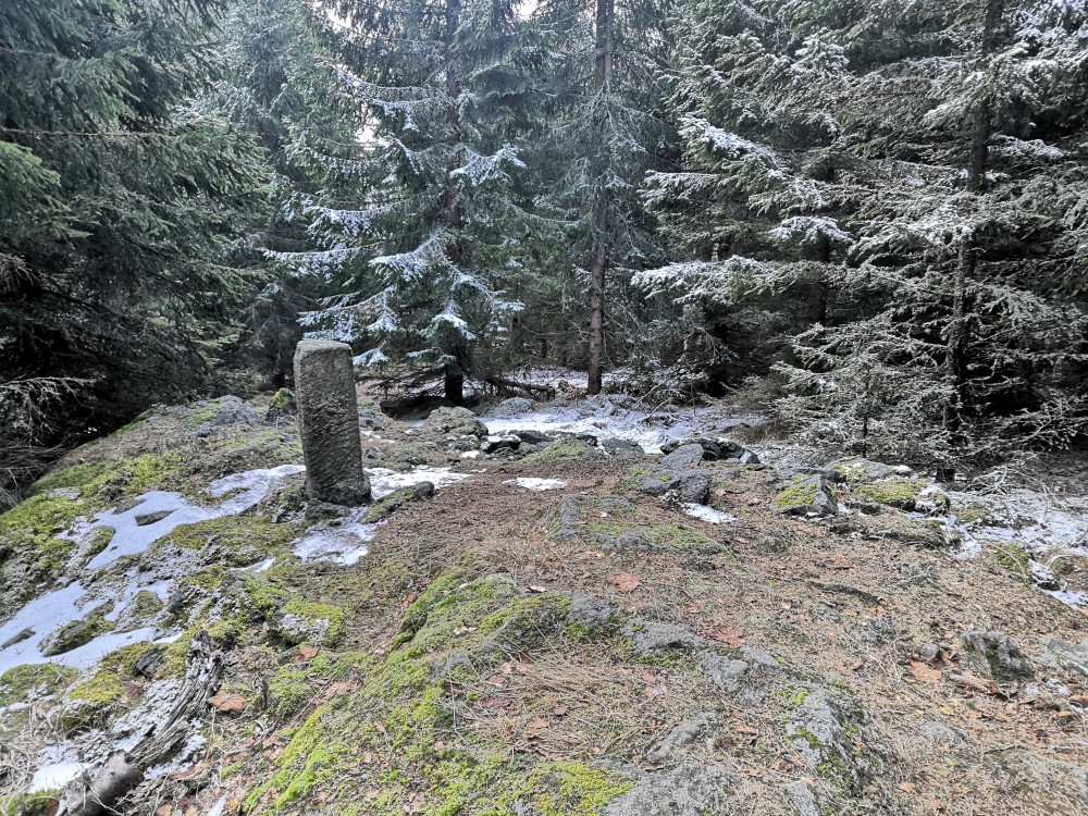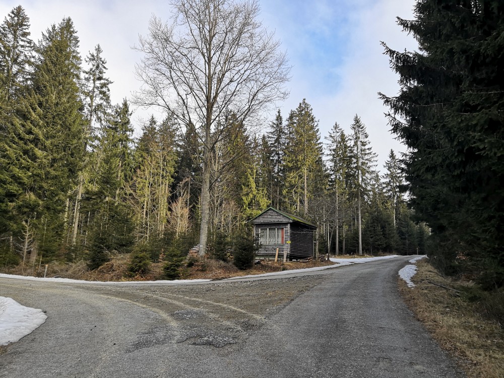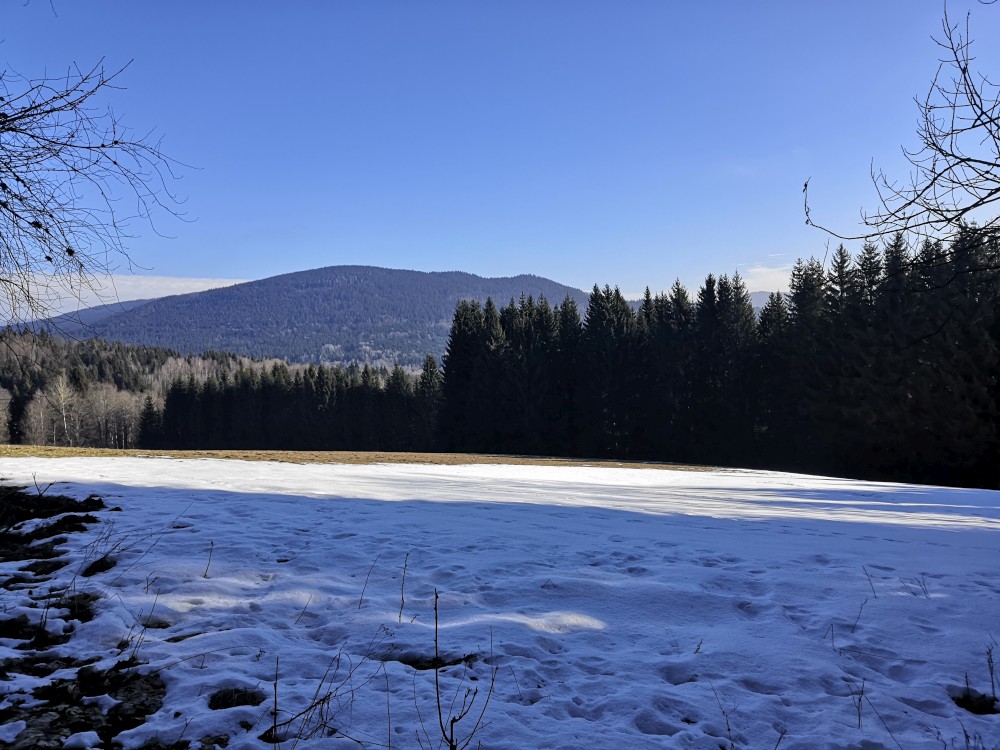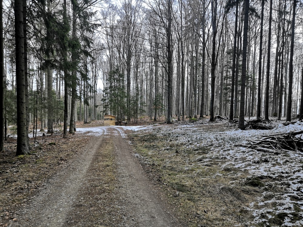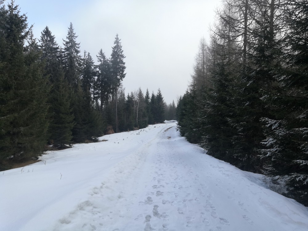 Tam se potkávám s asfaltkou, po které pohodlně klesám ke žluté Vimperské zlaté stezce. Tu jen překračuji a pokračuji rovně. Na rozcestí u turistického přístřešku vidím rysa. Paráda. Bohužel se mi ho nepodařilo zachytit na fotku. Stihl se schovat. Pokračuji tedy na vrchol Chlustov. Dávám sváču a jdu zpět k autu. Jdu paralelní cestou ke zlaté stezce. Na tu se napojuji až u Havránky. Pokračují po ní přes sjezdovku, kde jezdí mladí sjezdaři, až k autu.