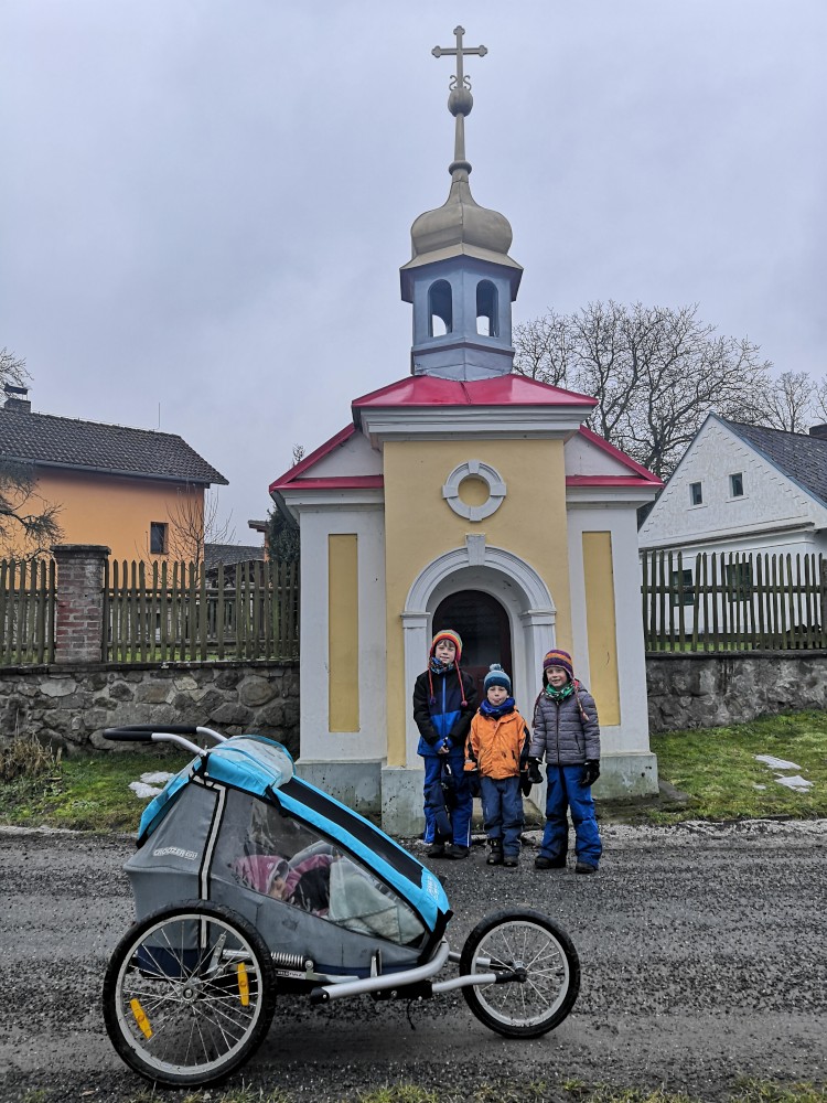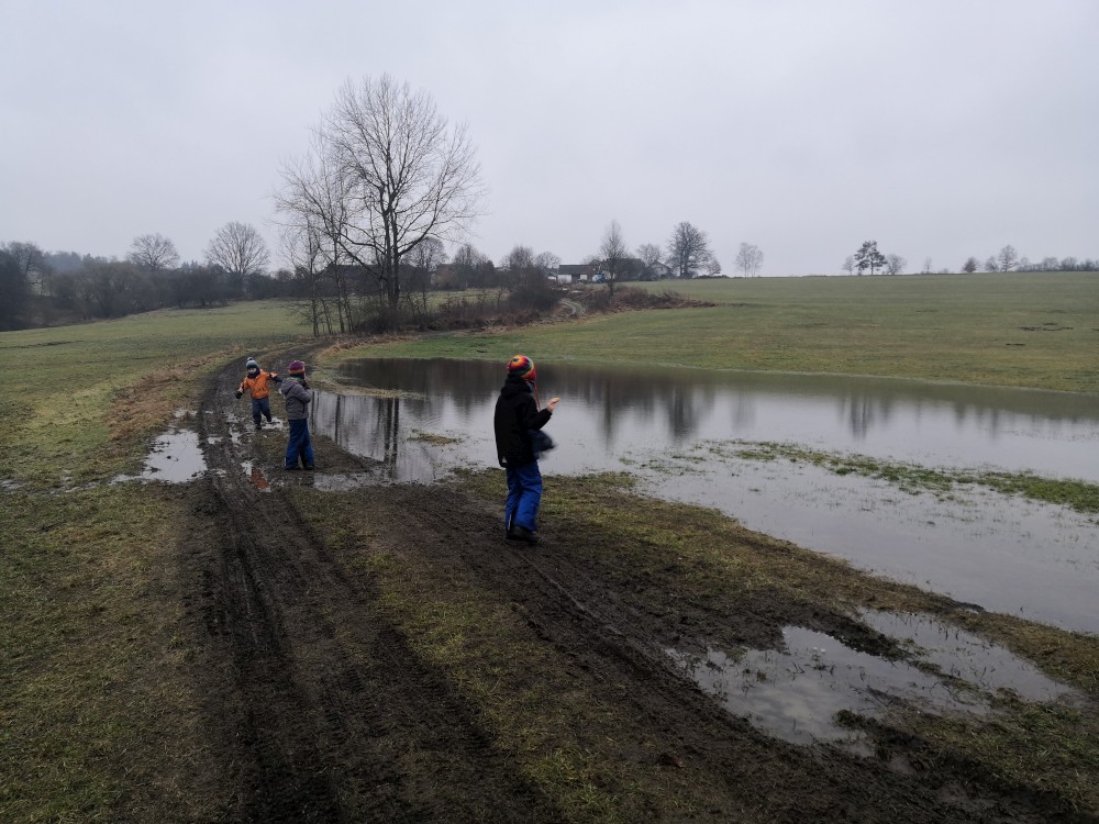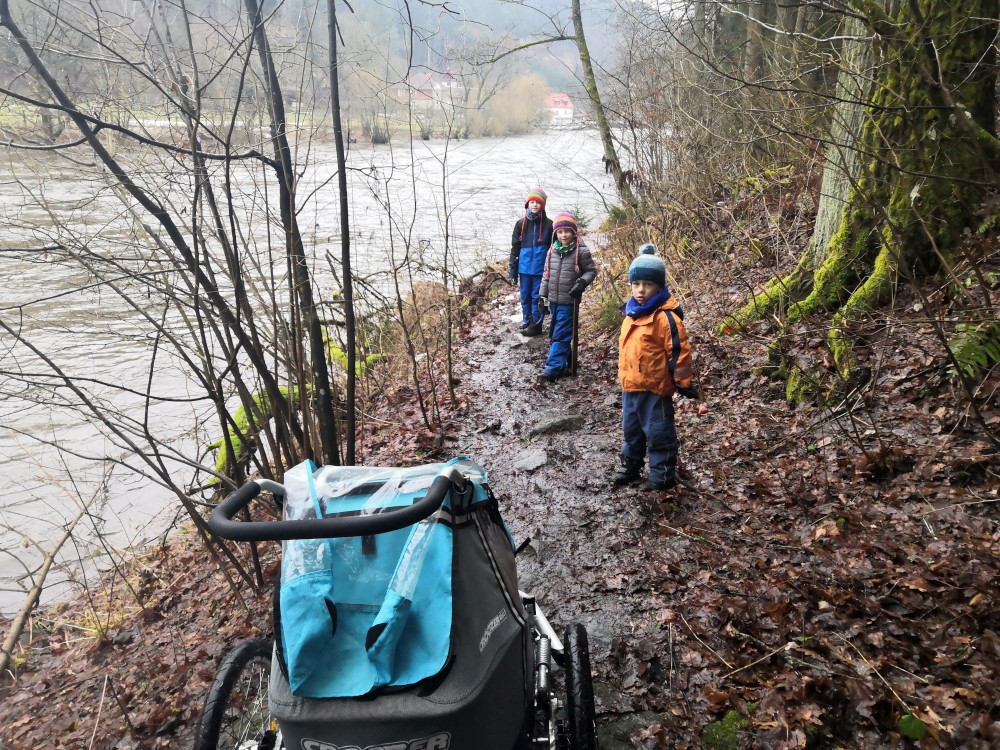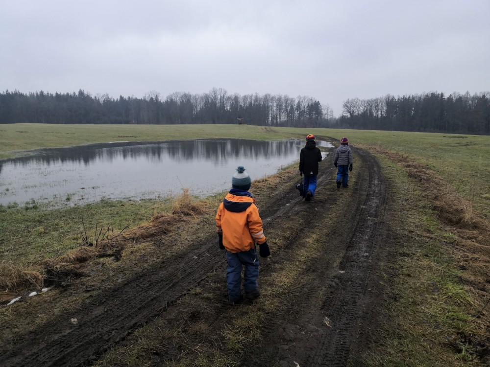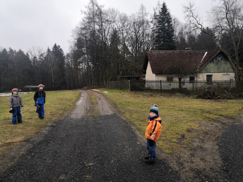 Jana jde na sraz s holkama. Dnes už jsem slušně vyvětraný ze Šumavy, ale přesto vyrážíme s dětma na výlet. Jdeme Vlčákem na Hnojnou Lhotu, odtud dolů dobrodružným terénem k Lužnici a podél ní na Harrachovku. V Lužnici je opravdu hodně vody. Na Harrachovce dáváme malé občerstvení a jdeme Vlčákem domů.
