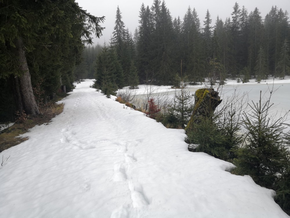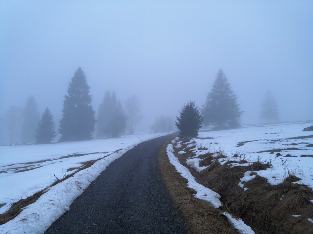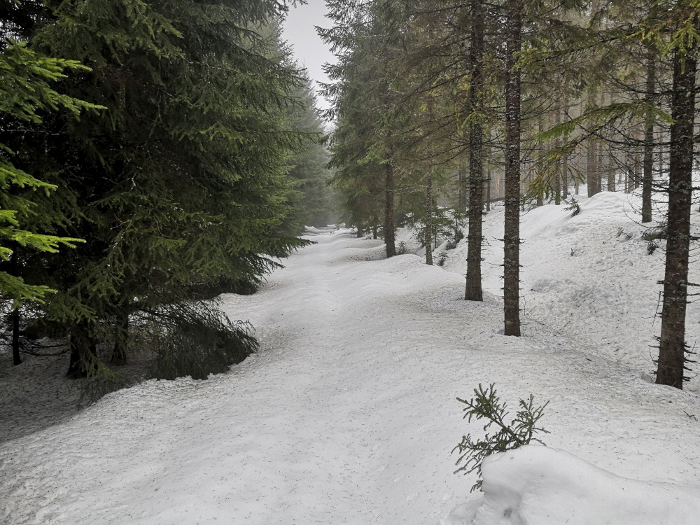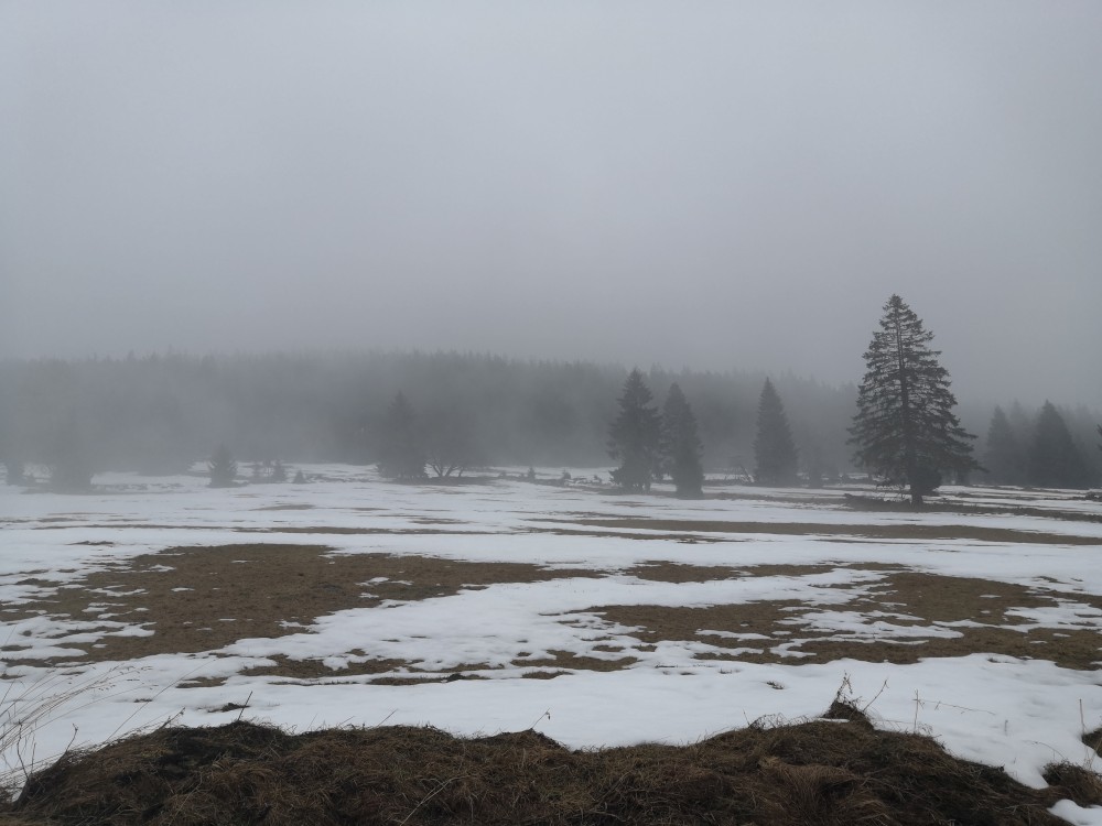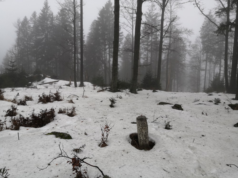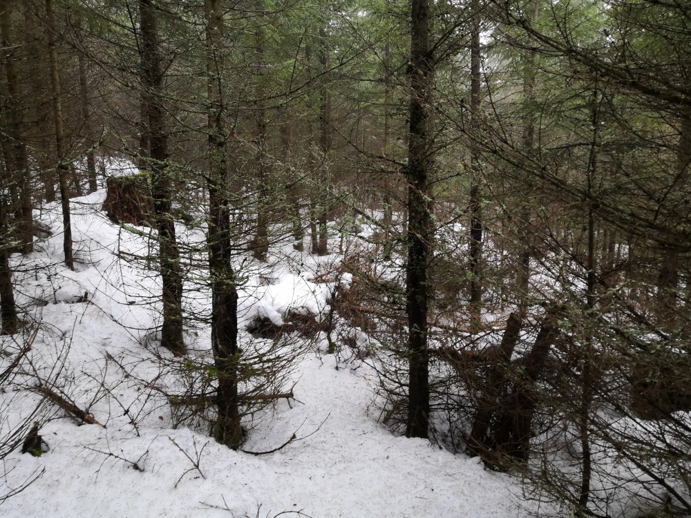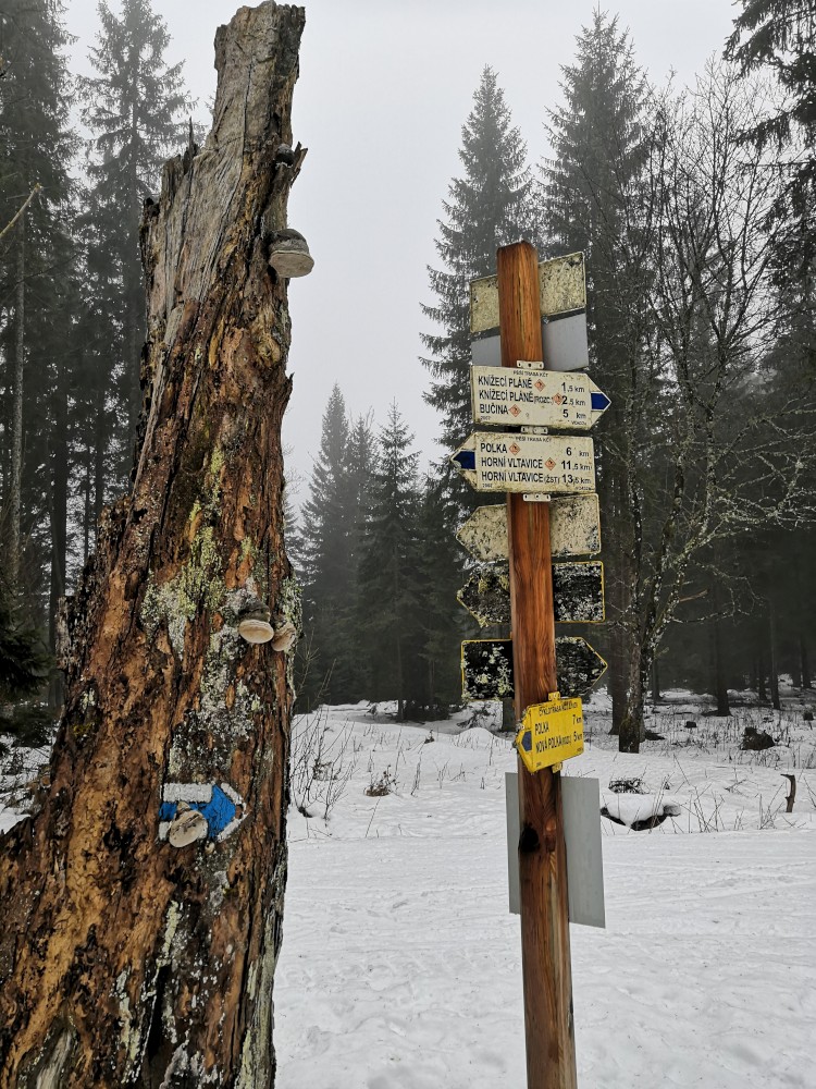 Vyrážím zase hodně brzy ráno zdolat další šumavskou ultratisícovku. Tentokrát Polecký vrch. Auto nechávám na parkovišti na Polce. Jdu po modré, ze které odbočuji k prameni U Diany, odbočuji z asfaltky doleva. Nasazuji sněžnice a jdu volným terénem na Polecký vrch. Počasí je velmi sychravé.