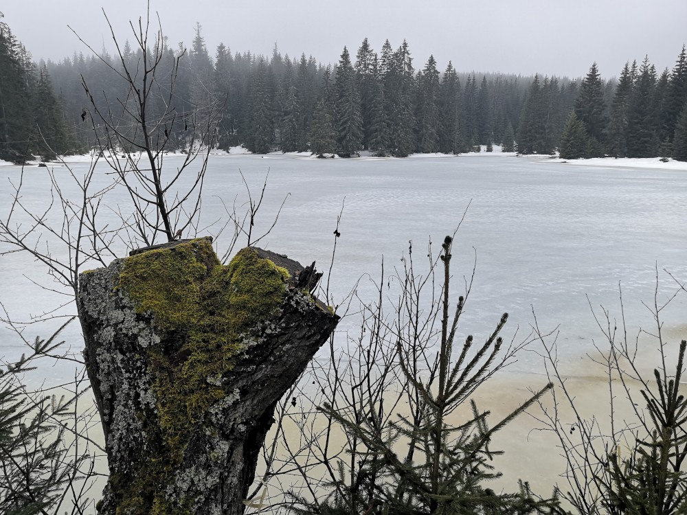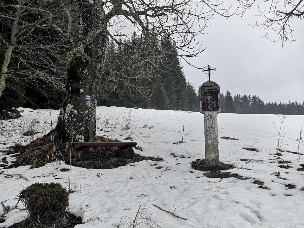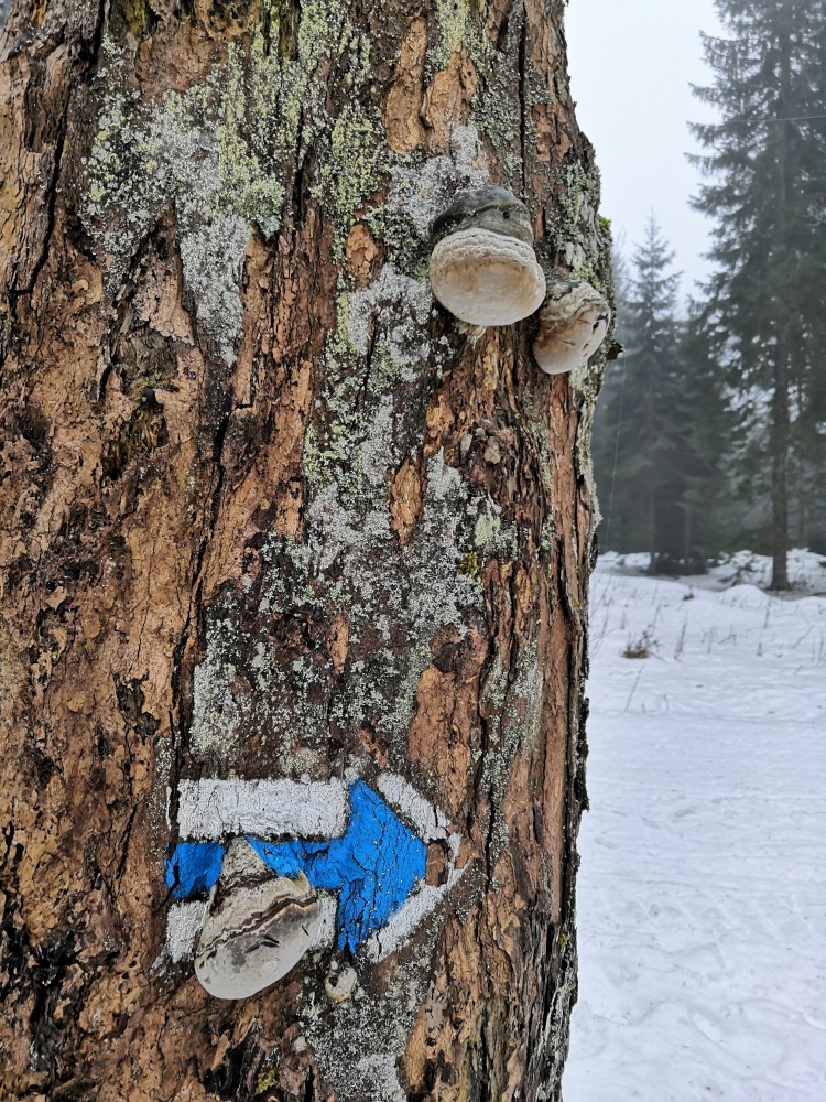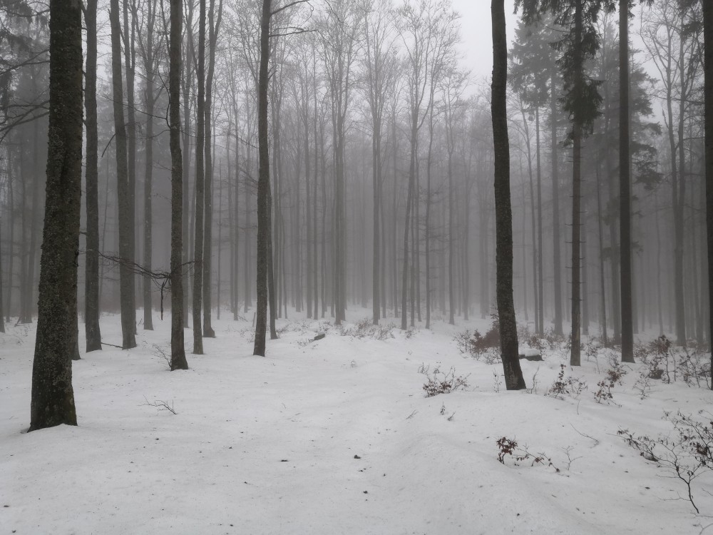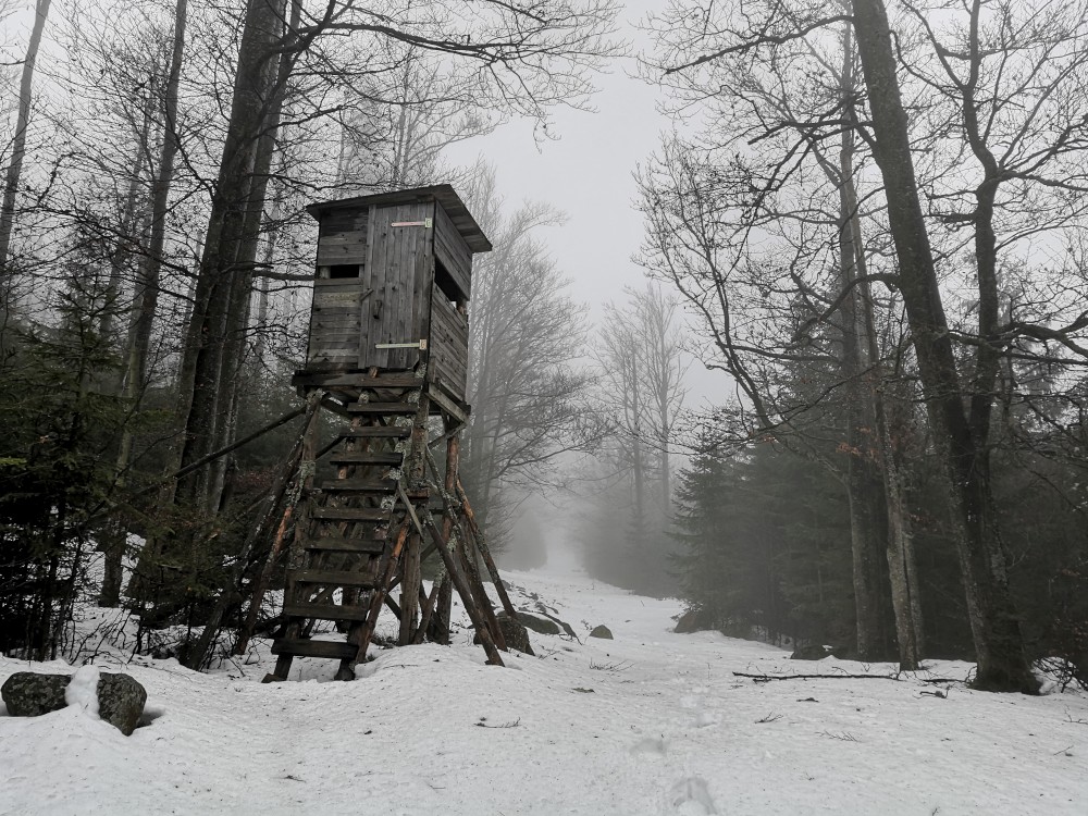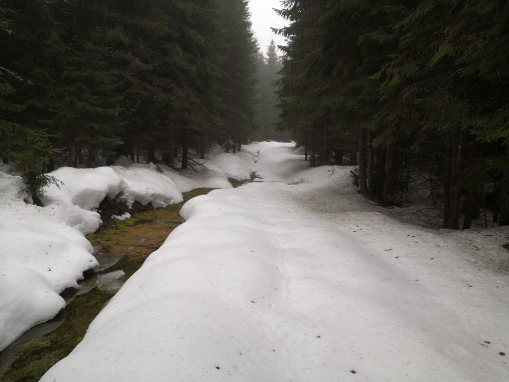 Vyrážím zase hodně brzy ráno zdolat další šumavskou ultratisícovku. Tentokrát Polecký vrch. Auto nechávám na parkovišti na Polce. Jdu po modré, ze které odbočuji k prameni U Diany, odbočuji z asfaltky doleva. Nasazuji sněžnice a jdu volným terénem na Polecký vrch. Počasí je velmi sychravé.