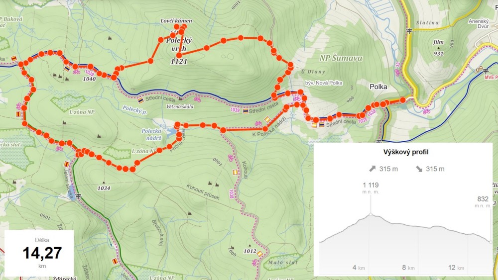 Chvíli posedím na vrcholu a jdu se podívat na Lovčí kámen. Zajímavé místo. Ostrá skála uprostřed lesa, kde bych ji nečekal. Odtud jdu hodně hustým lesem zpět k modré turistické značce. Pokračuji po ní směr Knížecí pláně. U rozcestníku Žďárecké sedýlko to beru doleva po zelené. Ještě před Žďáreckým jezírkem odbočuji doleva k Polecké nádrži.