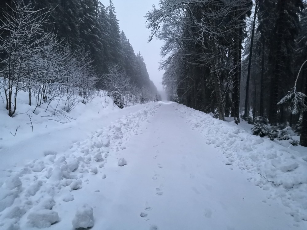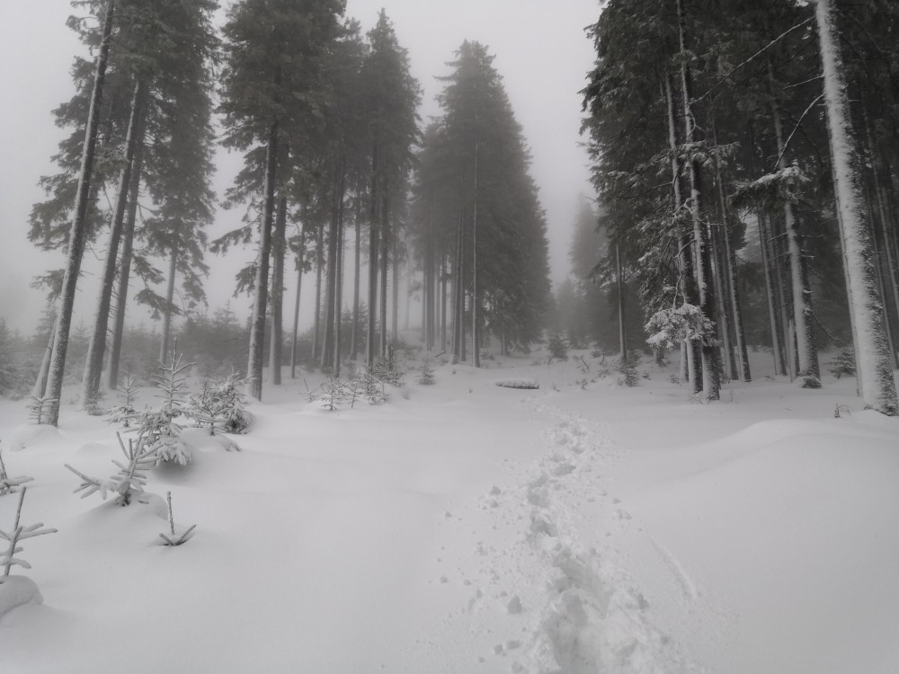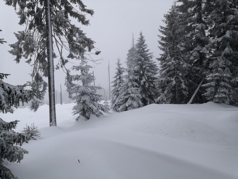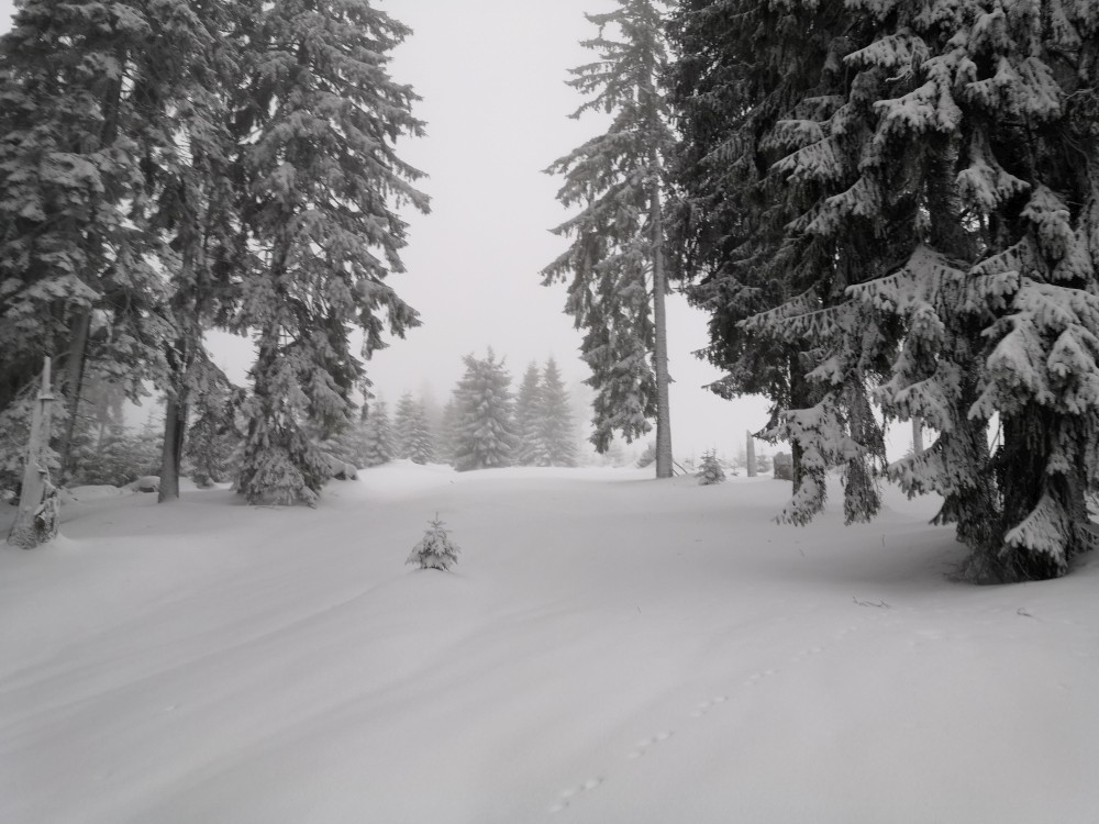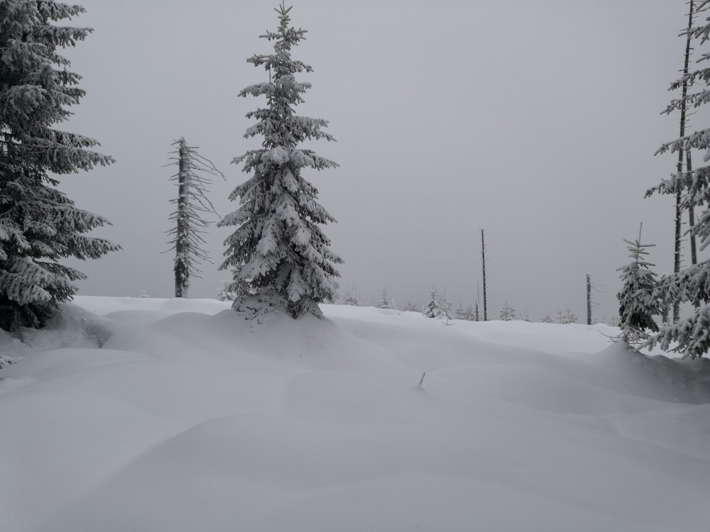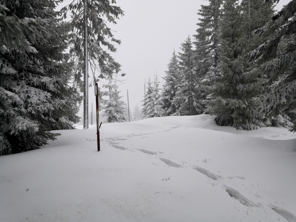 Jsem na vrcholu. Na nějaké dlouhé pobývání zde to nebude. Dávám malé občerstvení, přemáhám myšlenku, že bych se vrátil stejnou cestou zpět a vyrážím dle původního plánu zpět na Kvildu volným terénem na sever. Jdu po zasněžené Štruncově cestě, pak mokřinami kolem Lesního potoka na Kvildu. Sedám do auta a na oběd jsem doma.