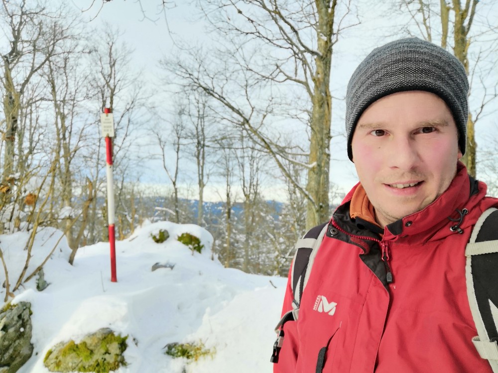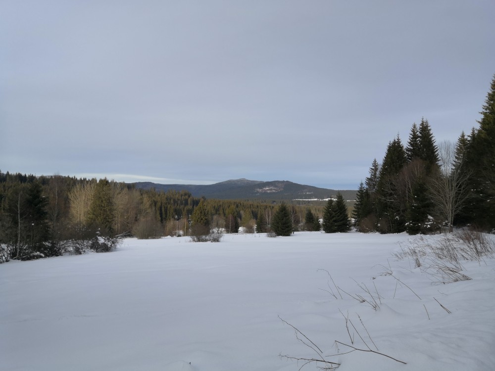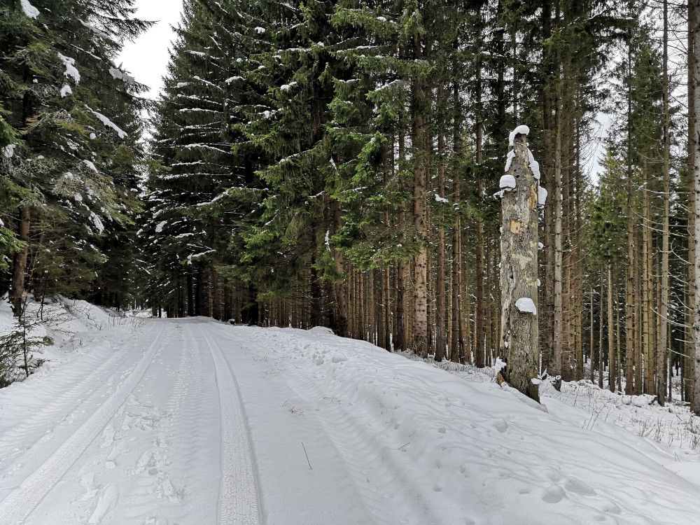 Končím v práci dříve a jedu ještě na otočku na jeden šumavský výšlap. Parkuji na kraji obce Dobrá a jdu na vrchol Stožec. Jdu lesem přímo k vrcholu. Musím jít ze severu, abych nevstoupil do první zóny NP. Cesta je hodně náročná, je hodně sněhu a nemám sněžnice, také je náročné překonávat padlé stromy. Vracím se stejnou cestou ve svých stopách.