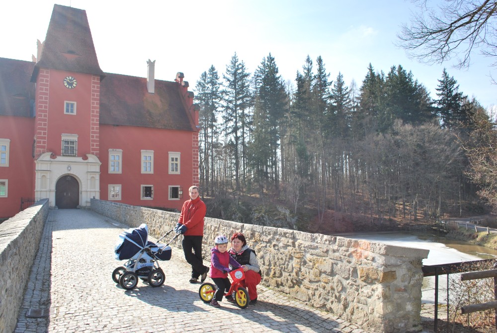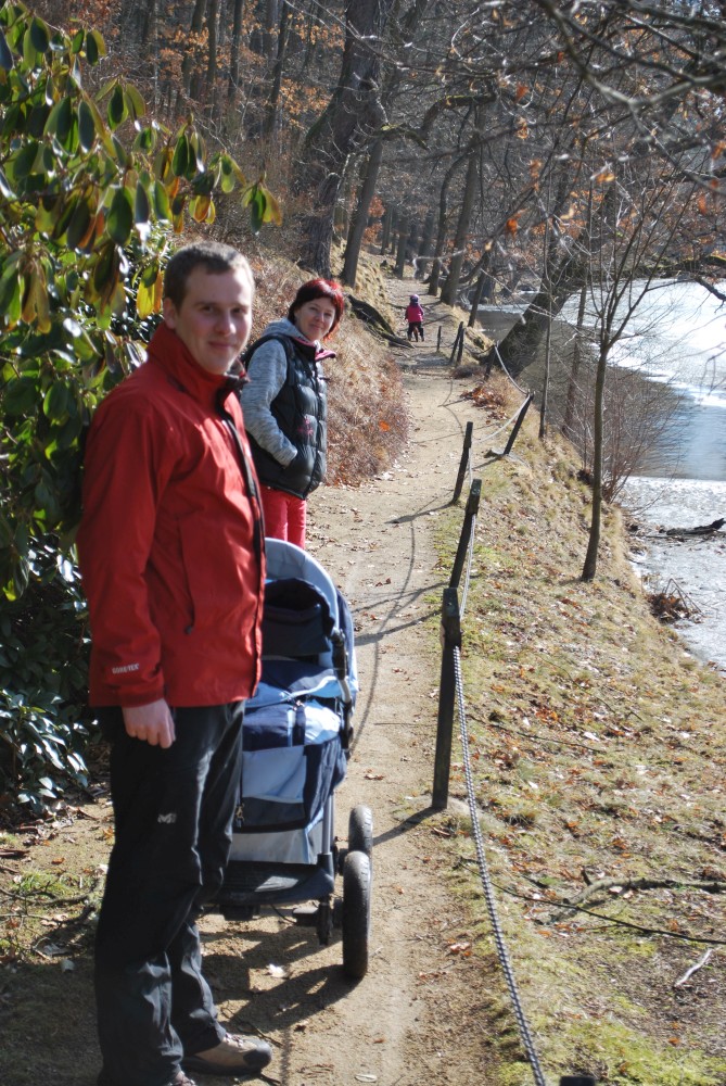 Dnes jsme s rodinkou vyrazili na krátký dopolední výlet na Červenou Lhotu. Jela s námi také Mací s Nikolkou. Víťula cestu autem prospal, a v podobném duchu pokračuje i celou vycházku. Děláme okruh po žluté kolem jezírka u zámku. Nejdříve to vypadá na vycházku po pohodové pěšince. Nakonec musíme překonávat docela nepříjemnou pasáž s lávkou, která je užší než kočár a s "horolezeckou" vložkou. Následuje bahýnko a kořeny. Nic z toho však Víťu neprobouzí. Sedáme znovu do auta a jedeme si dát sobotní oběd. Krátký, ale příjemný výlet.