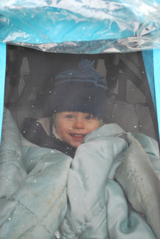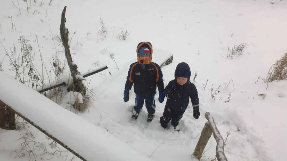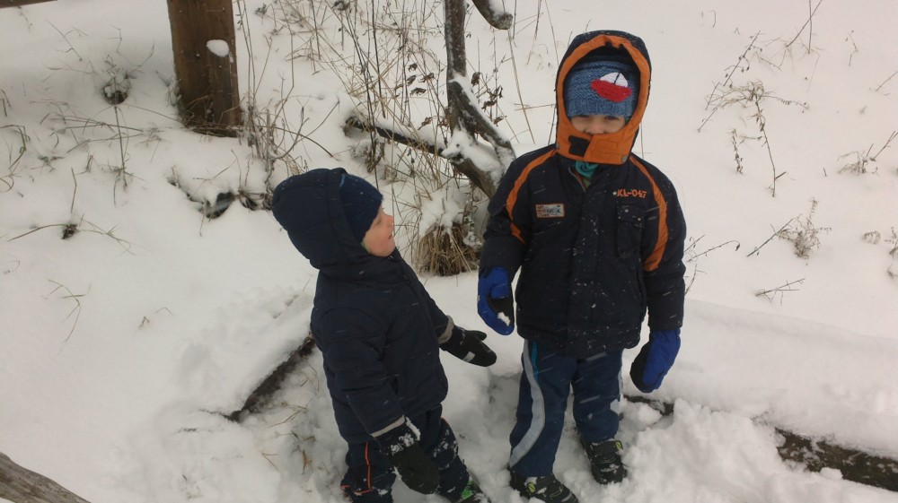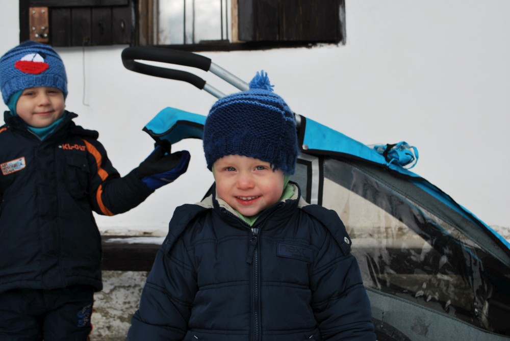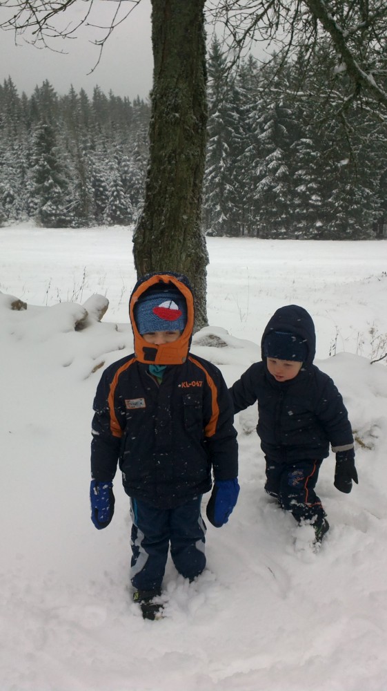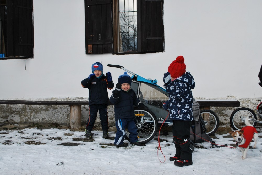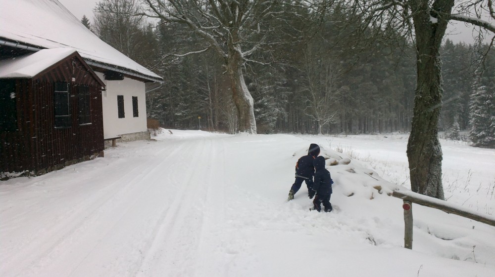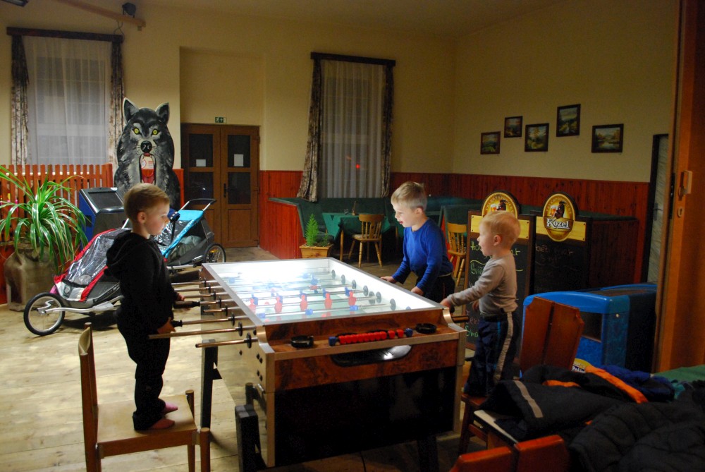 Po chvilce odpočinku pokračujeme po cyklostezce přes Svinnou ladu do Borovky. Už chumelí docela slušně. V 5 otvírají U vlka. Už mají otevřeno. Jídlo sice nemají, ale i pivko přijde vhod. Kluci si hrají s Tončou v dětském koutu. Po chvíli je to tam už nebaví, tak jdou hrát fotbálek.