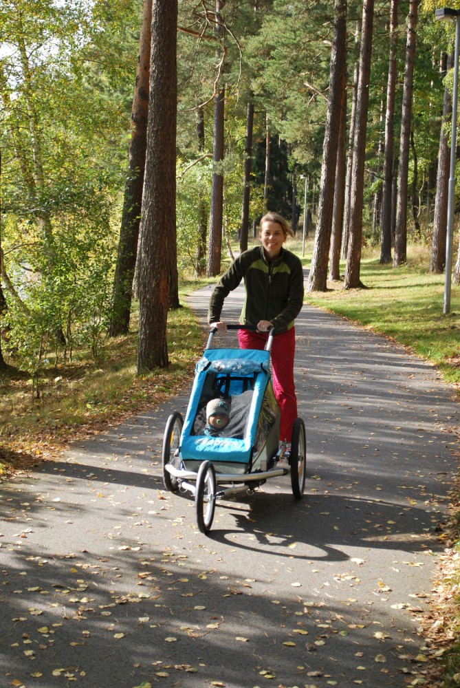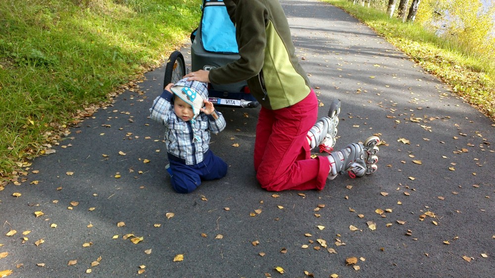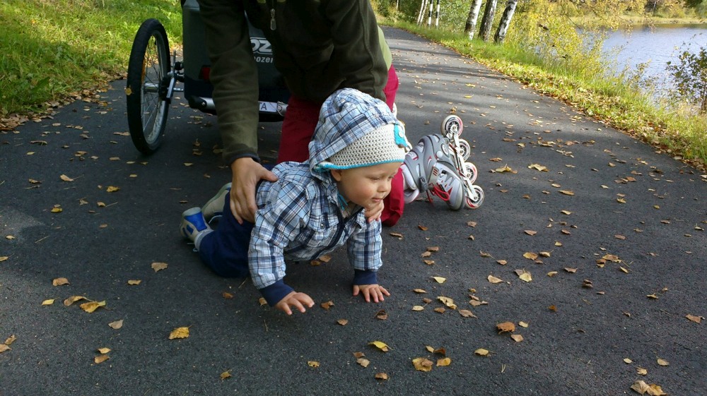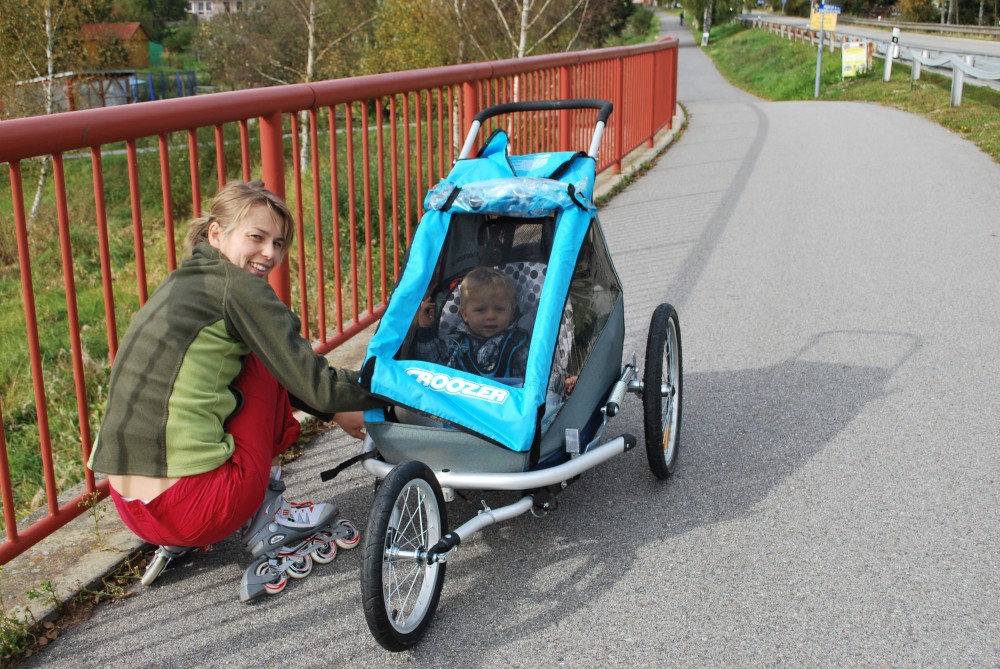 Pak nasazujeme brusle a vyrážíme kolem břehu Lipna směrem do Lipna nad Vltavou. Začínáme z kopečka do kopečka, což se Janičce moc nelíbí. Ani Víťa není ve vozíčku moc spokojen. Na prvních tak dvou kilometrech Víťu několikrát vyndaváme z vozíčku, aby se trochu prošel a prolez. Vypadá to, že moc daleko nedojedeme.