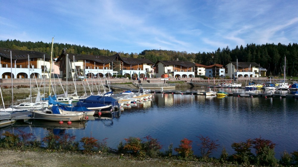 Nakonec se Víťa umoudřil, z vozíčku se rozhlíží po okolí a cesta jde celkem hladce. Kolem čtvrté přijíždíme do přístavu Lipna nad Vltavou. Je to zajímavé místo, takové dost nečeské, působí na nás dost uměle. Je tu ale restaurace s terasou a dětským koutkem. Pro zastavení ideální.