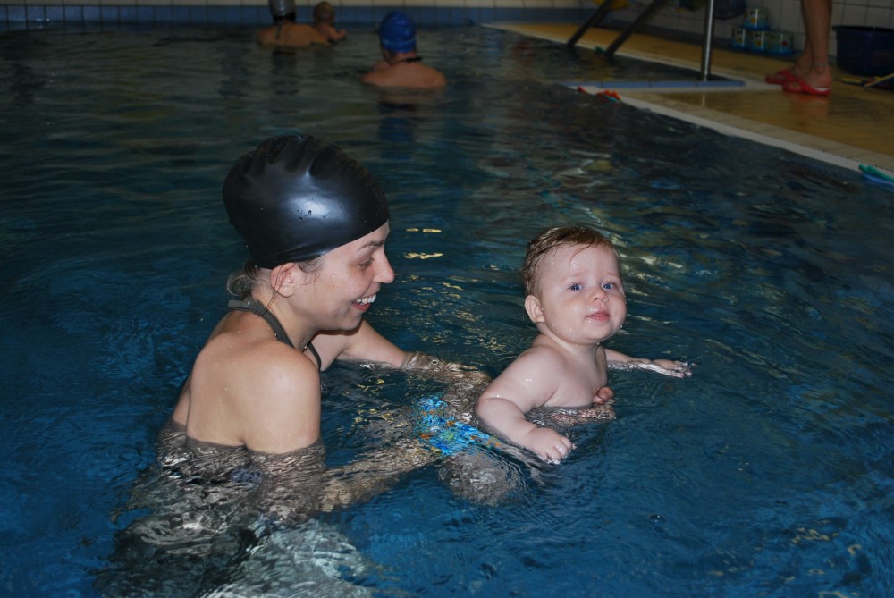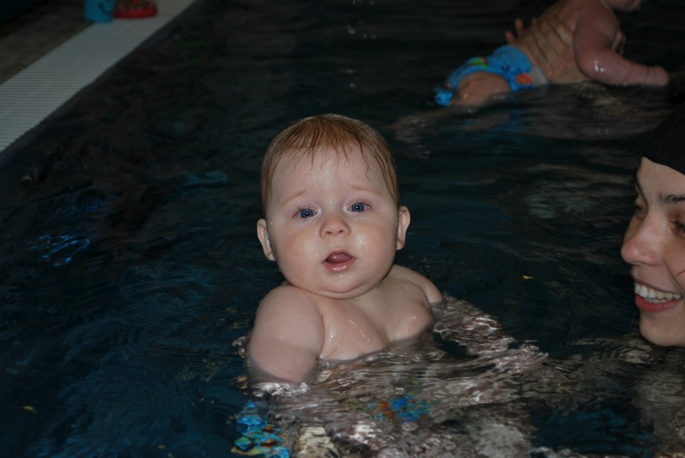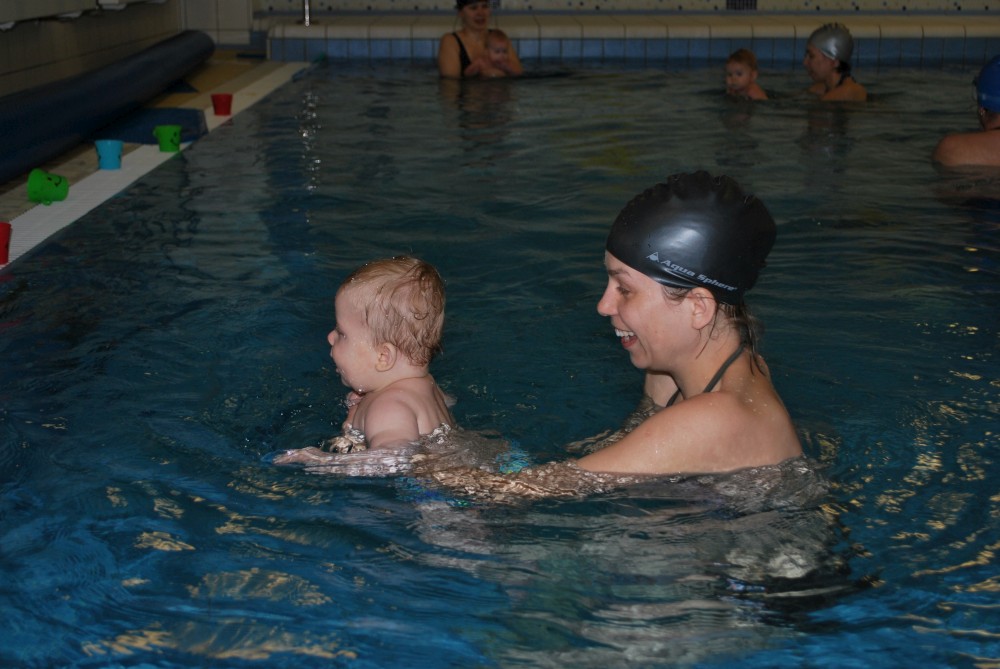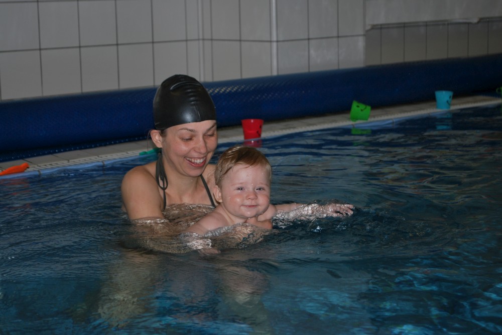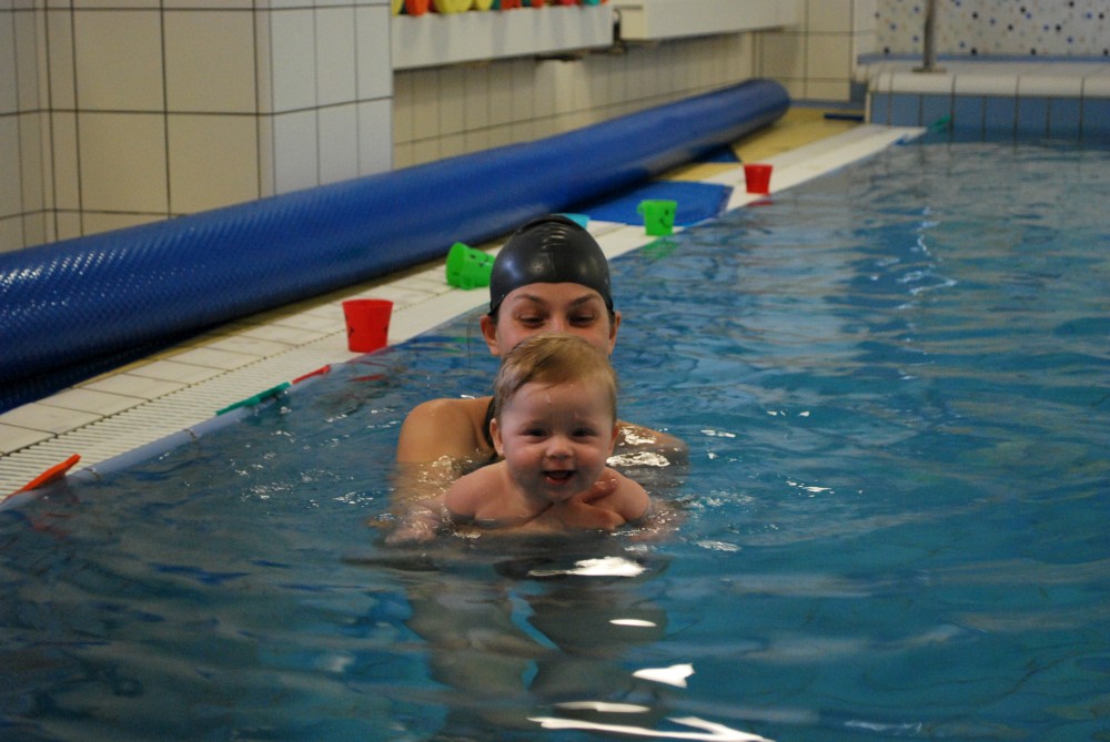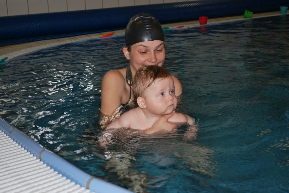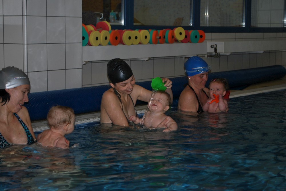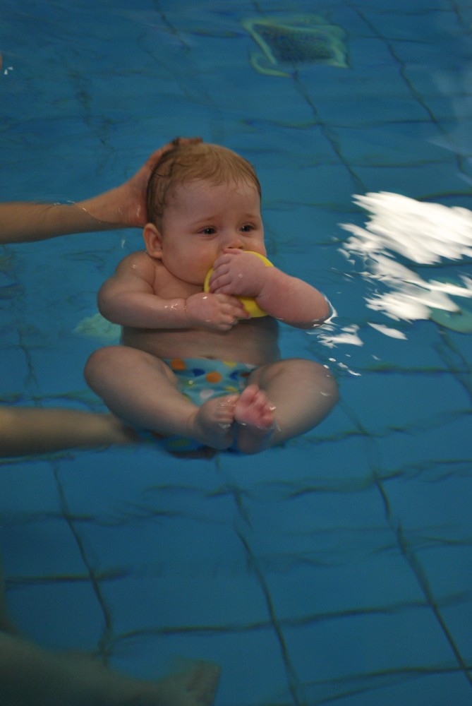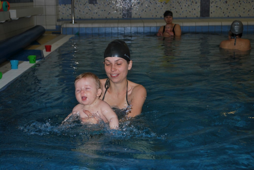 Vítečkovi je 6 měsíců a začíná s Janou chodit do bazénu. Vítek má moc rád vodu, takže si to hodně užívá. Na třetí hodinu jsem se šel podívat s nimi. Stál jsem u bazénu a udělal pár fotek. Byl jsem u Vítkova prvního celkového potopení.