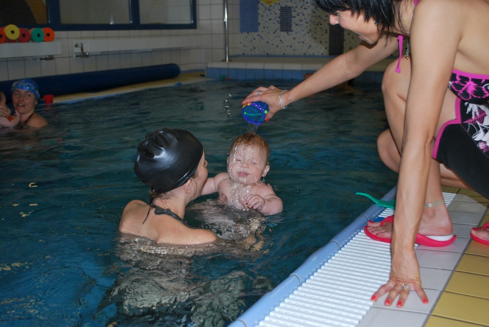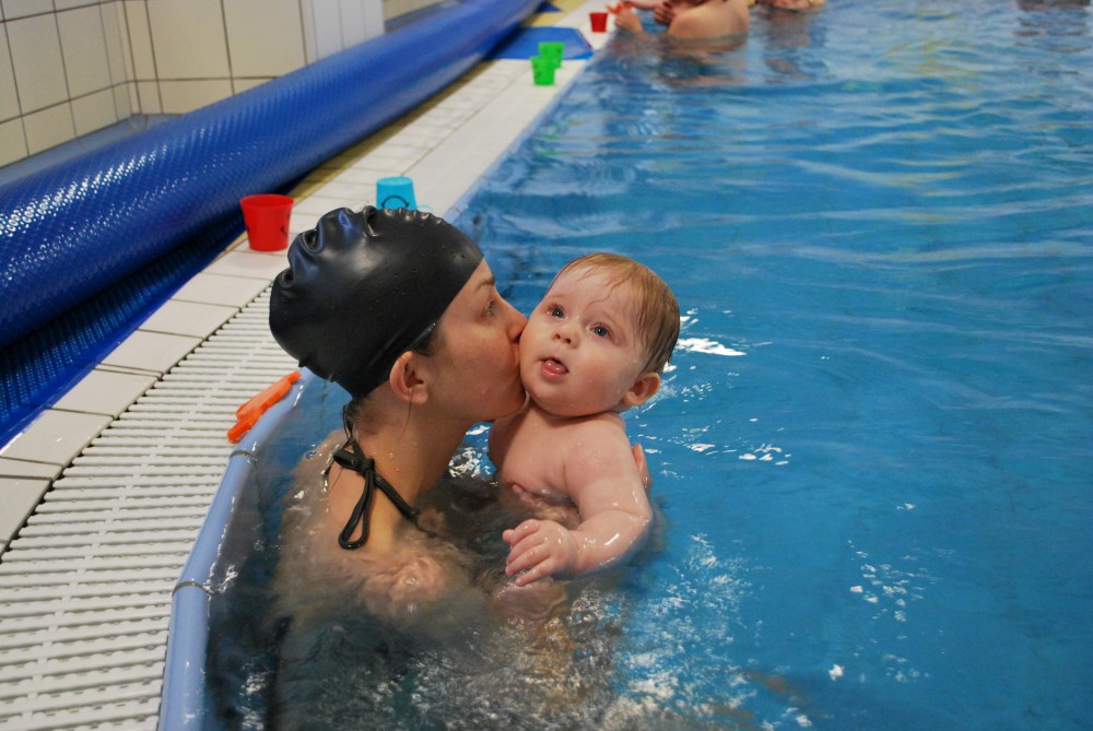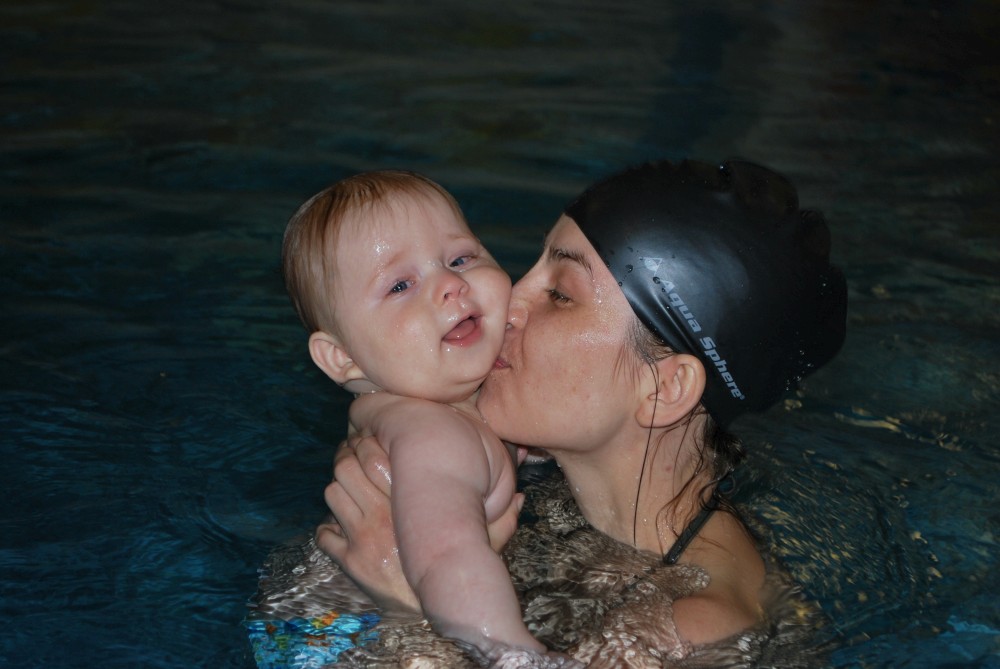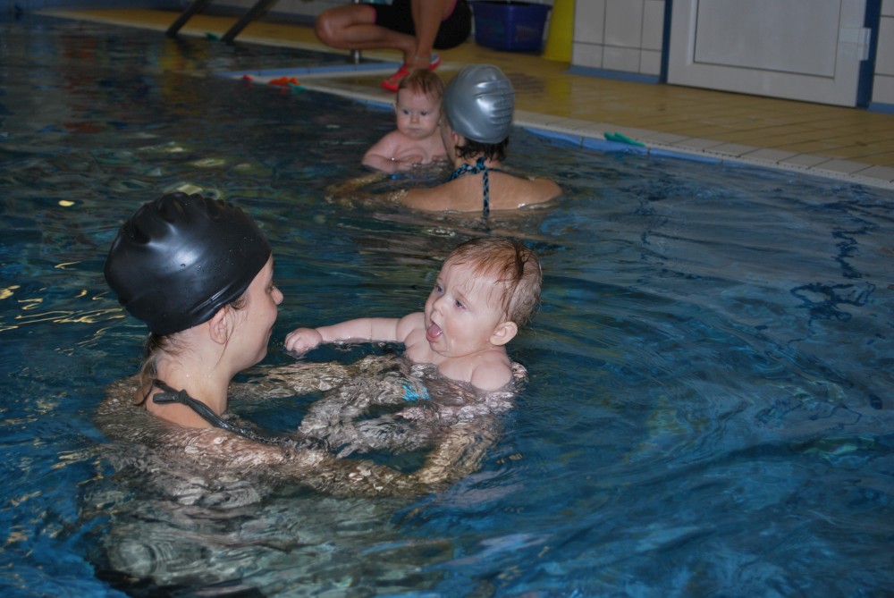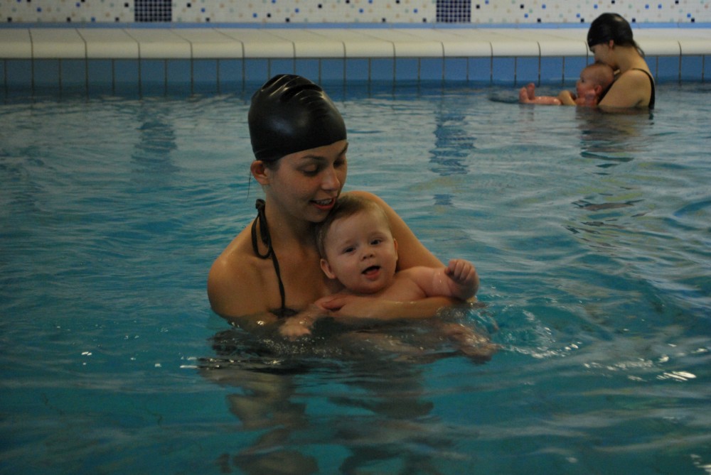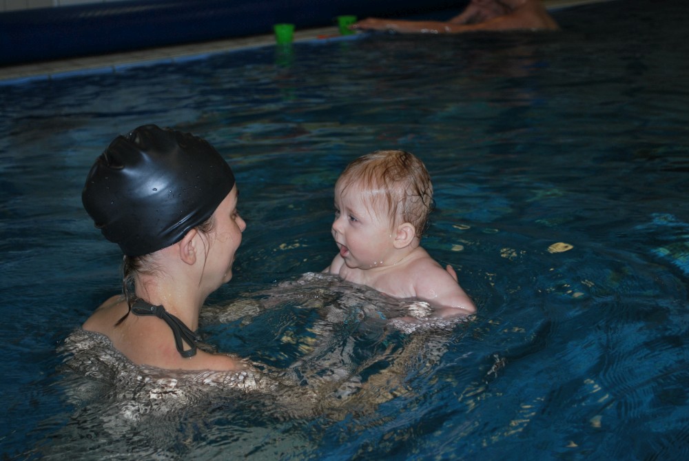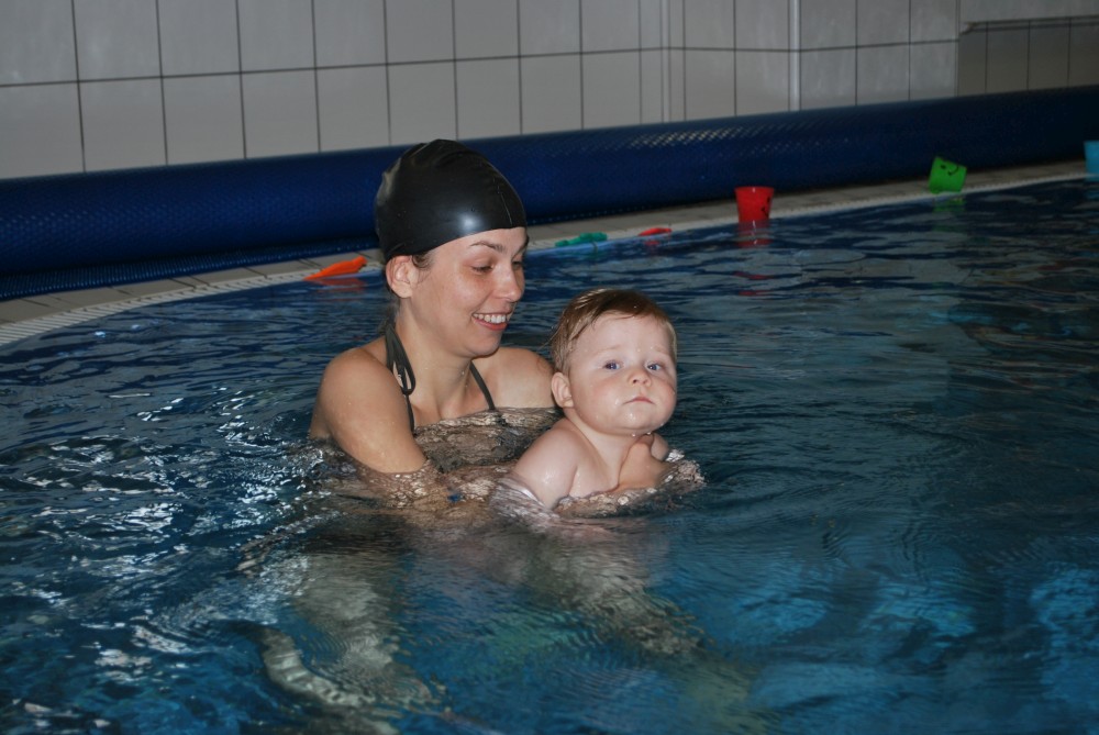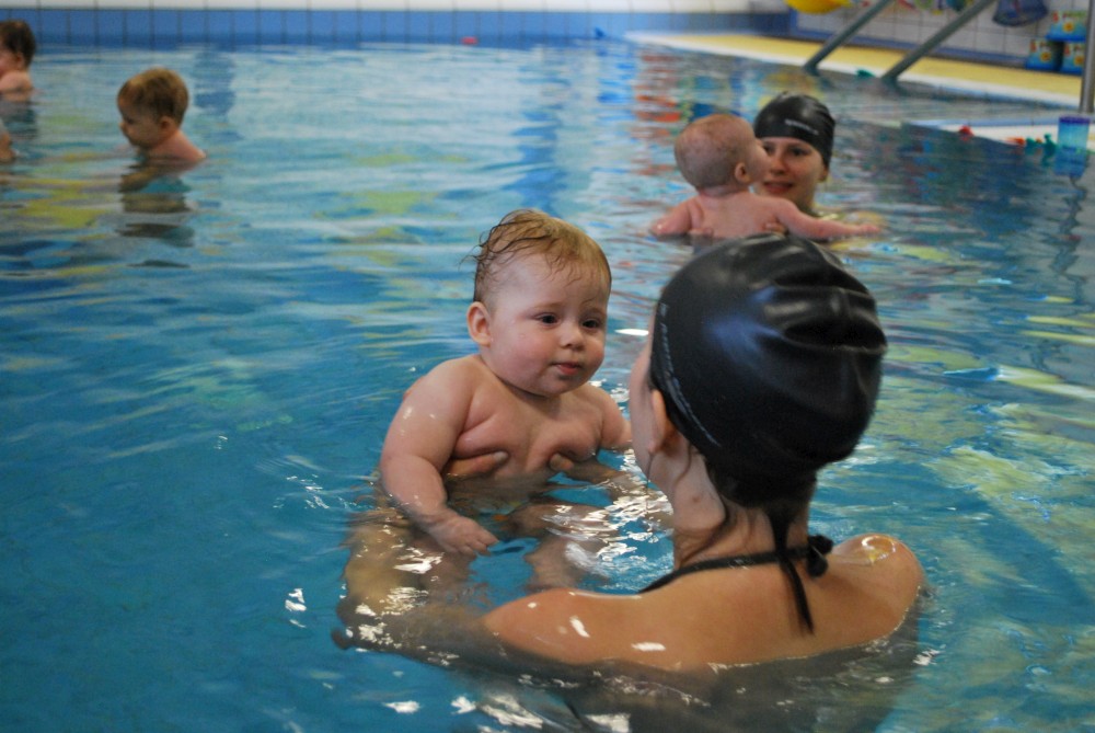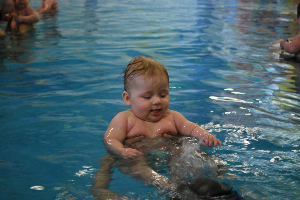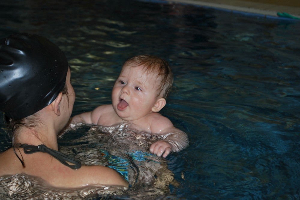 Vítečkovi je 6 měsíců a začíná s Janou chodit do bazénu. Vítek má moc rád vodu, takže si to hodně užívá. Na třetí hodinu jsem se šel podívat s nimi. Stál jsem u bazénu a udělal pár fotek. Byl jsem u Vítkova prvního celkového potopení.
