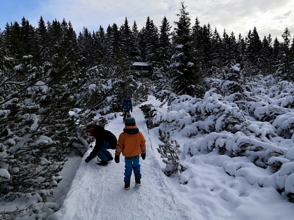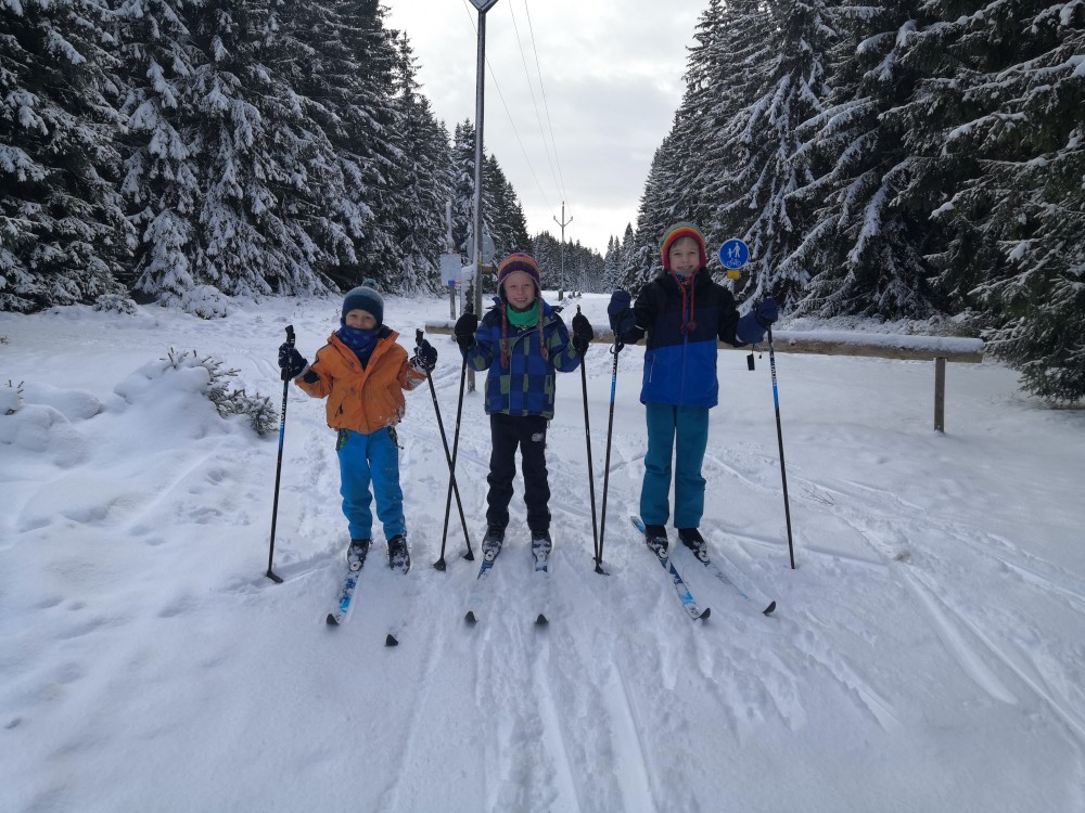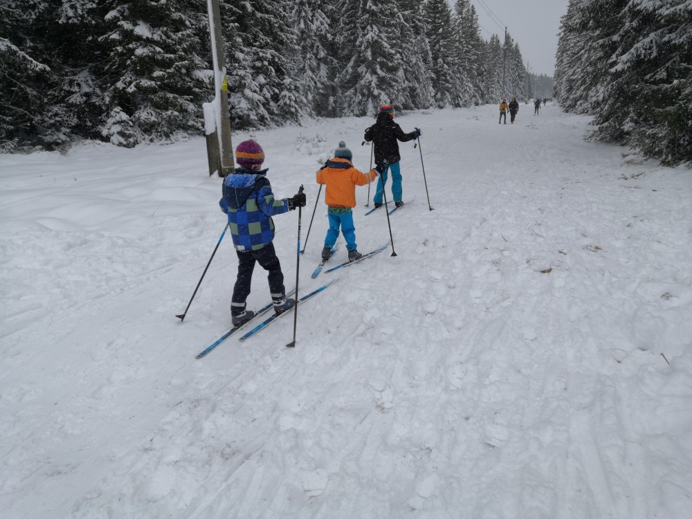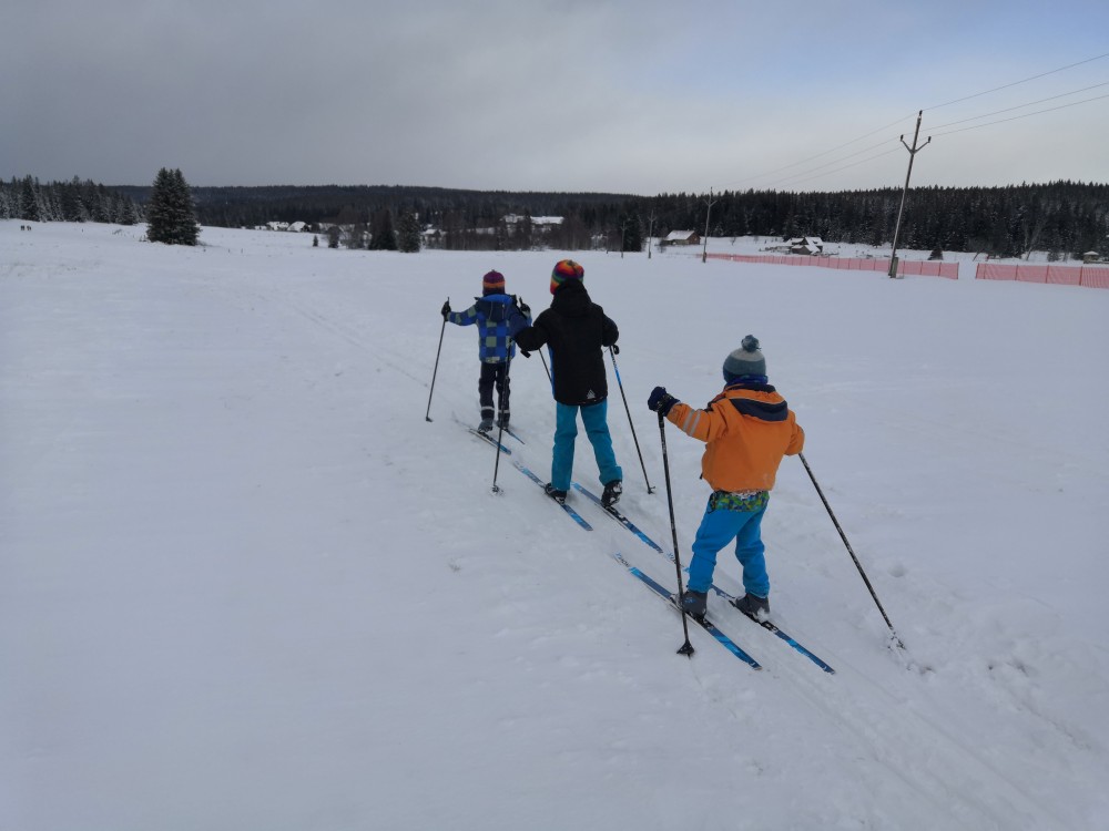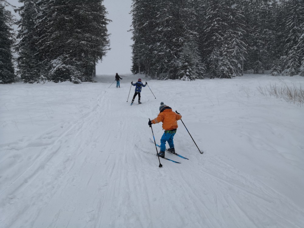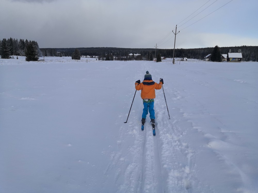 Kluci dostali pod stromeček běžky. Jedeme je vyzkoušet na Horskou Kvildu. U parkoviště u Jezerní slatě je zapadlé auto v příkopu, pomáhám ho vytlačit. Už nepojedeme dál, necháváme auto na parkovišti u slatě. Nandaváme běžky a kluci mohou vyrazit poprvé do stopy. Jde jim to dobře. Jiřík s Víťou ujeli vpřed, já jedu s Martínkem pomaleji.