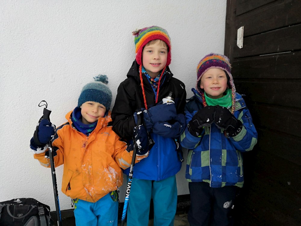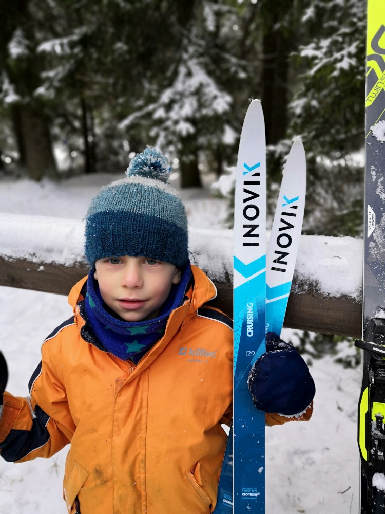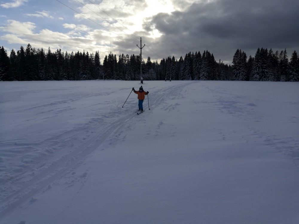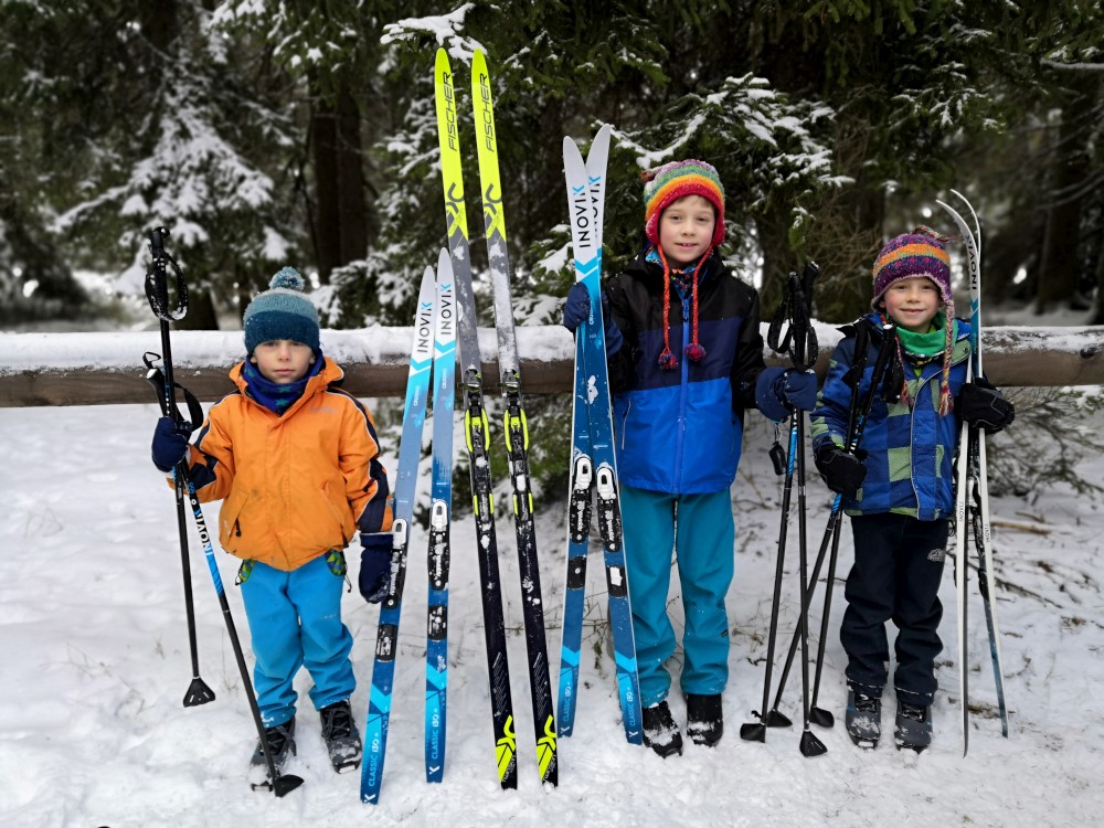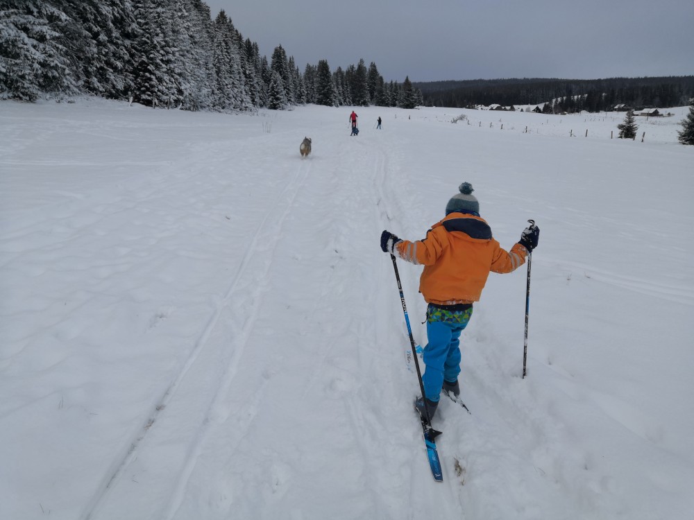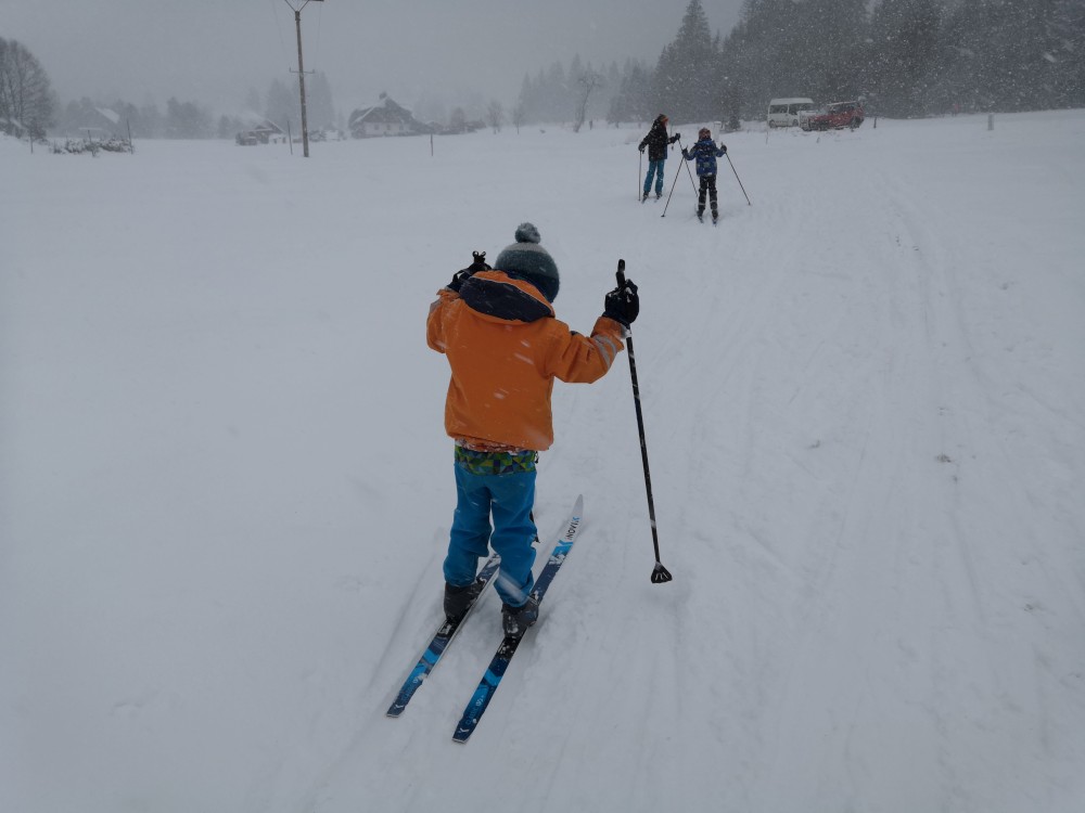 Kluci dostali pod stromeček běžky. Jedeme je vyzkoušet na Horskou Kvildu. U parkoviště u Jezerní slatě je zapadlé auto v příkopu, pomáhám ho vytlačit. Už nepojedeme dál, necháváme auto na parkovišti u slatě. Nandaváme běžky a kluci mohou vyrazit poprvé do stopy. Jde jim to dobře. Jiřík s Víťou ujeli vpřed, já jedu s Martínkem pomaleji.