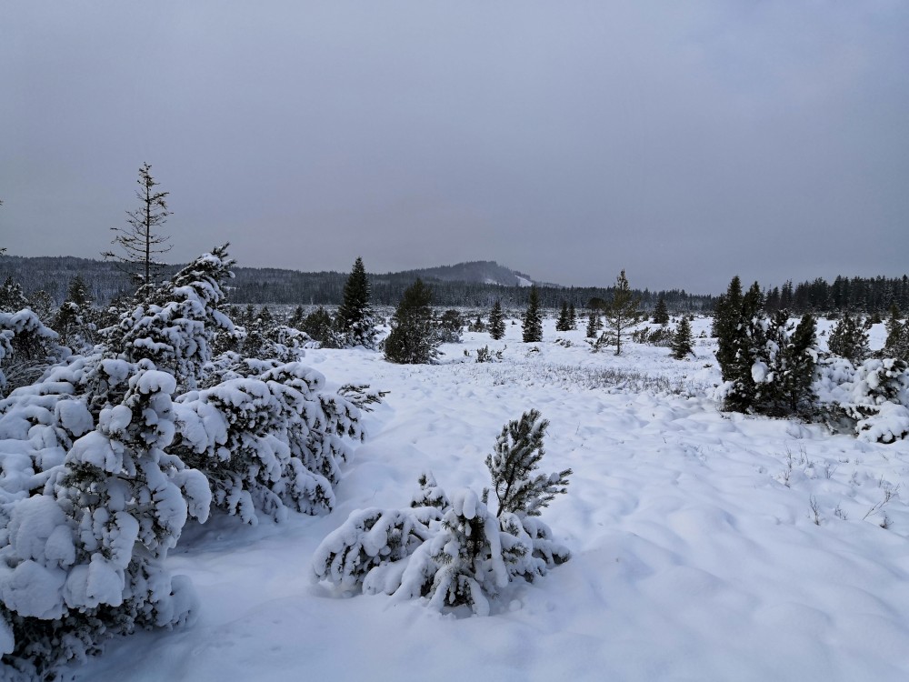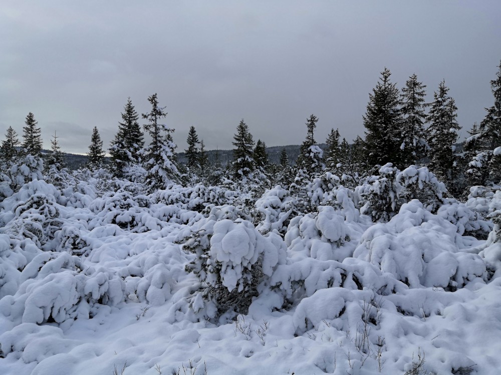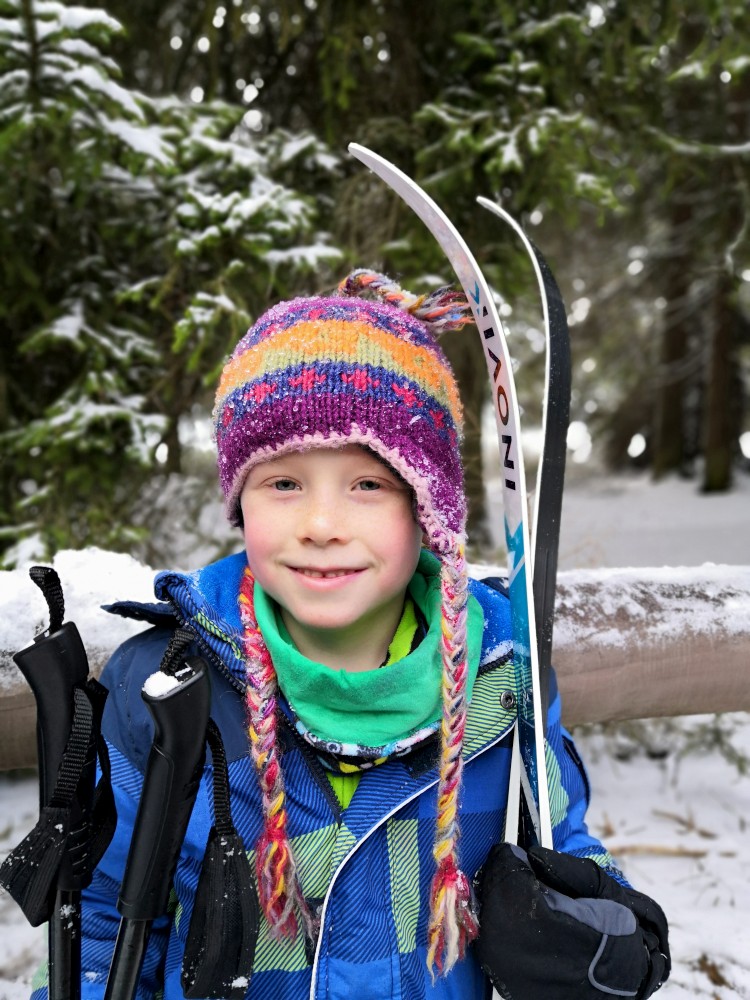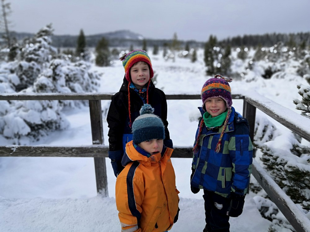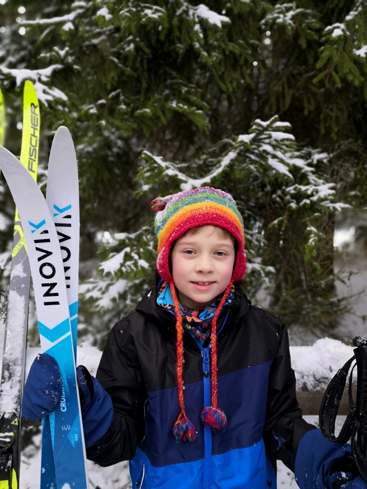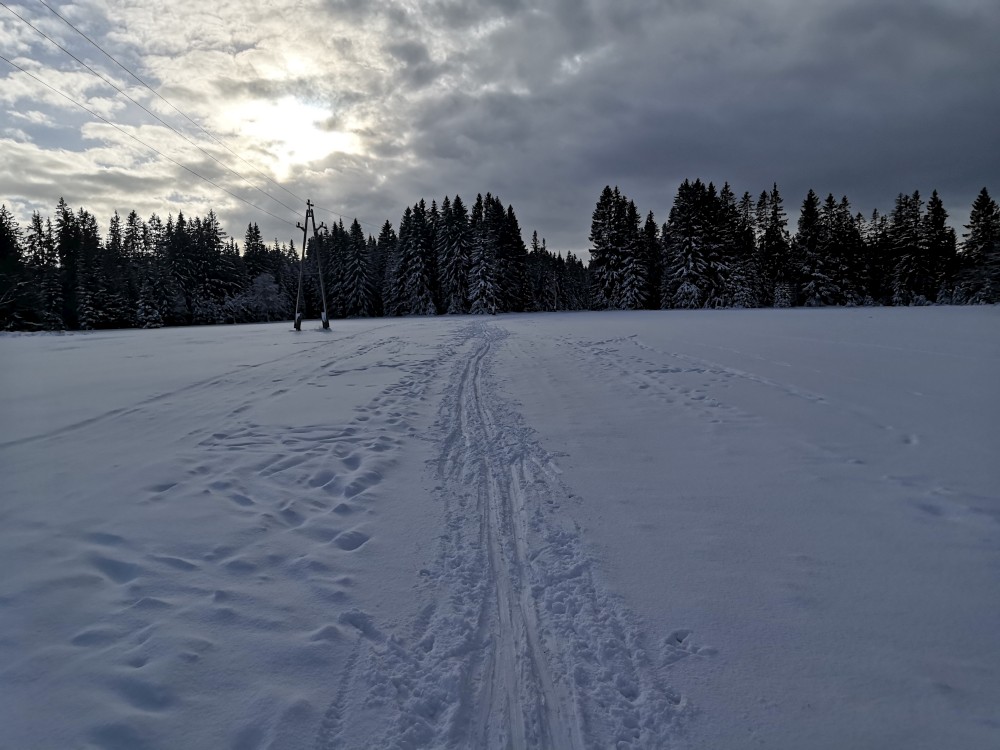 Kluci dostali pod stromeček běžky. Jedeme je vyzkoušet na Horskou Kvildu. U parkoviště u Jezerní slatě je zapadlé auto v příkopu, pomáhám ho vytlačit. Už nepojedeme dál, necháváme auto na parkovišti u slatě. Nandaváme běžky a kluci mohou vyrazit poprvé do stopy. Jde jim to dobře. Jiřík s Víťou ujeli vpřed, já jedu s Martínkem pomaleji.