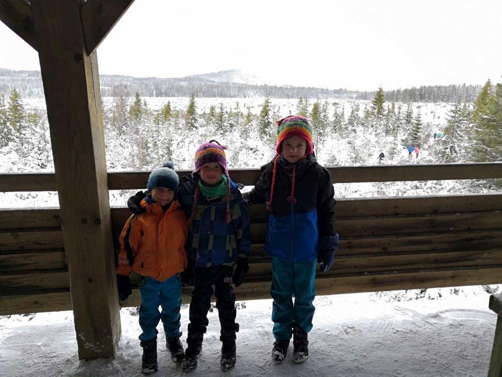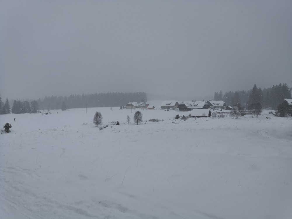 Jedeme směr Horská Kvilda. Bohužel se začíná kazit počasí, přichází sněhová vánice a vítr. Schováme se v závětří u zdi jednoho z místních domů. Dáváme čaj a vracíme se zpět k autu. Pro ten první výjezd těch 4 - 5 km bude stačit. U auta sundaváme běžky a jdeme se ještě podívat na Jezerní slať.