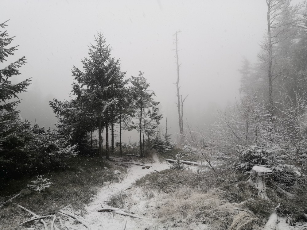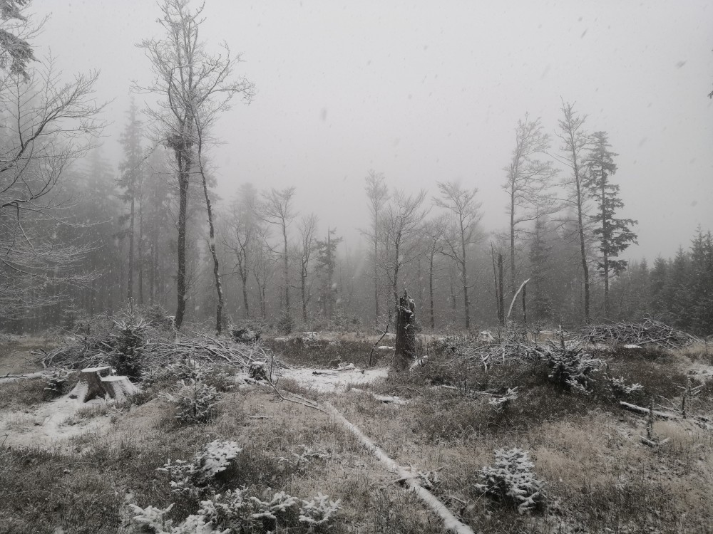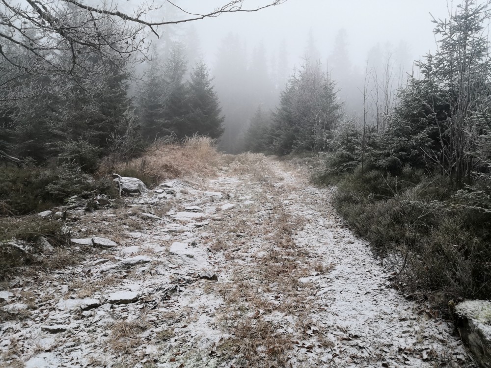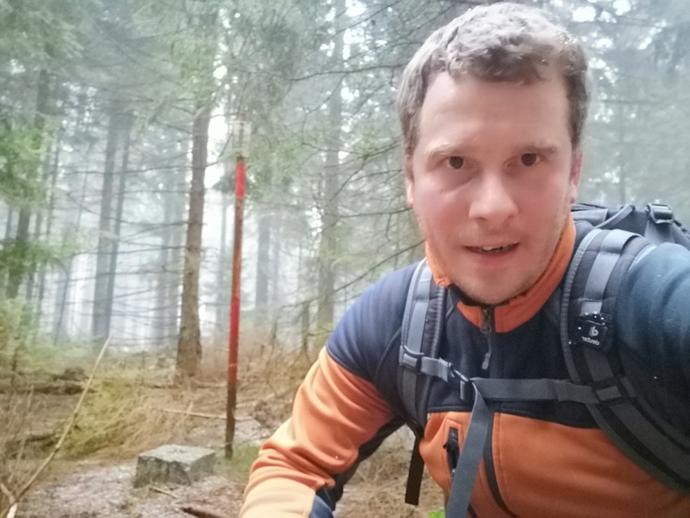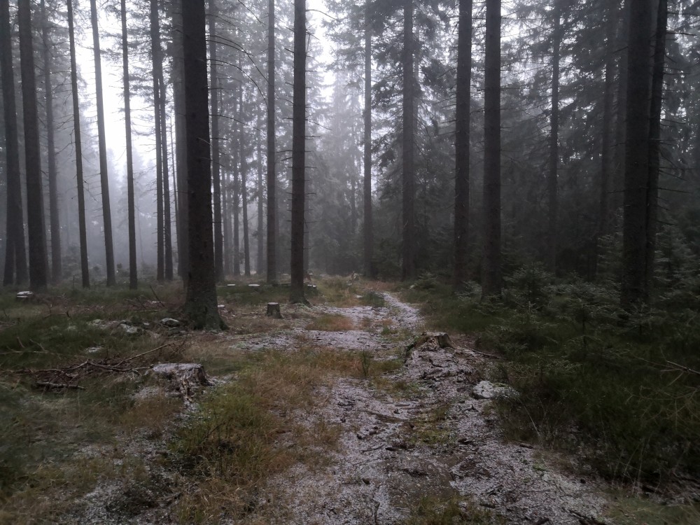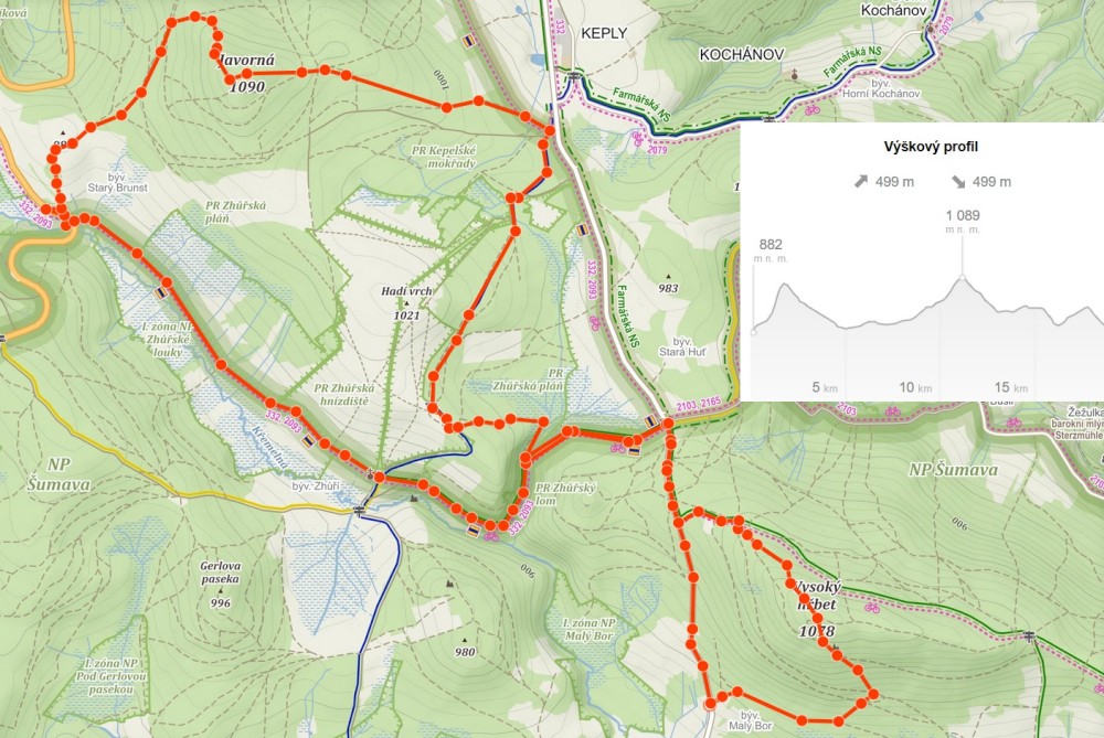Další ranní výprava na Šumavu. Auto nechávám na parkovišti u bývalé osady Malý Bor a vyrážím na Vysoký hřbet. Po dobytí vrcholu pokračuji k zelené turistické značce a po ní na Starou Huť a pak dále na Zhůří. Jdu kolem Křemelné až k hlavní silnici. Tak je velká bobří hráz. Odtud stoupám na Javornou a pak dolů na Keply. Odtud jdu po zelené na rozcestí Pod Hadím vrchem. Kousek za ní odbočuji doleva po špatně znatelné cestě a napojuji na silnici. Vracím se k autu. Ještě přejíždím do obce Javorník. Nechávám auto u sochy Klostermanna a vybíhám na vrchol ke Klostermannově rozhledně.