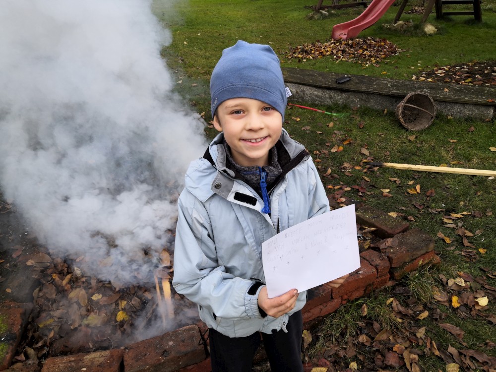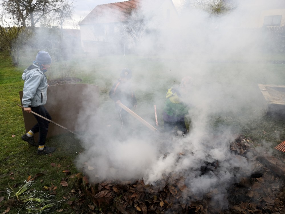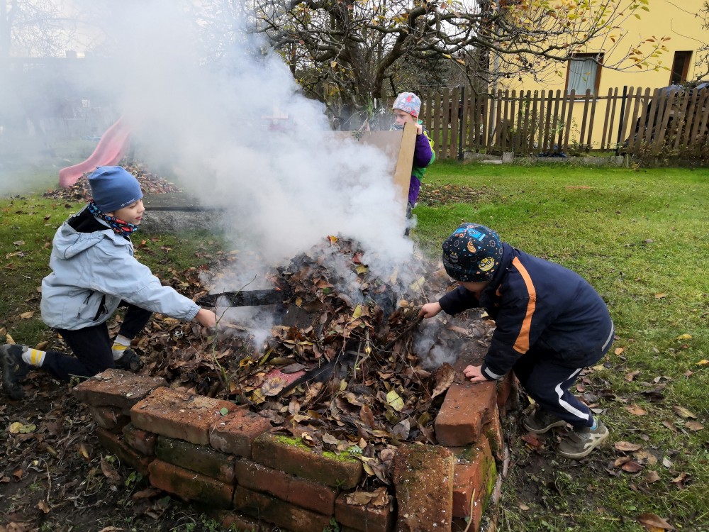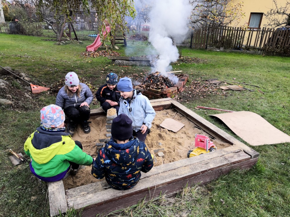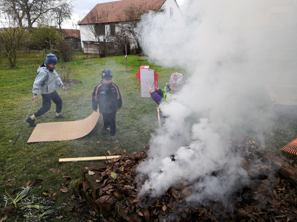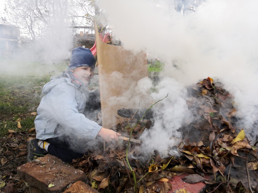 Děláme oheň na zahraně. Kluci dělají kouřové projektíky. Přichází je navštívit Tonča a Fanym.