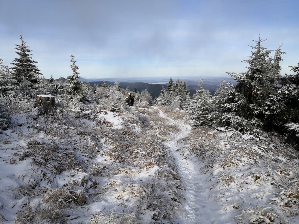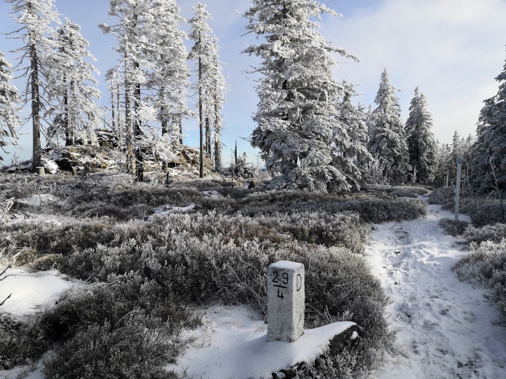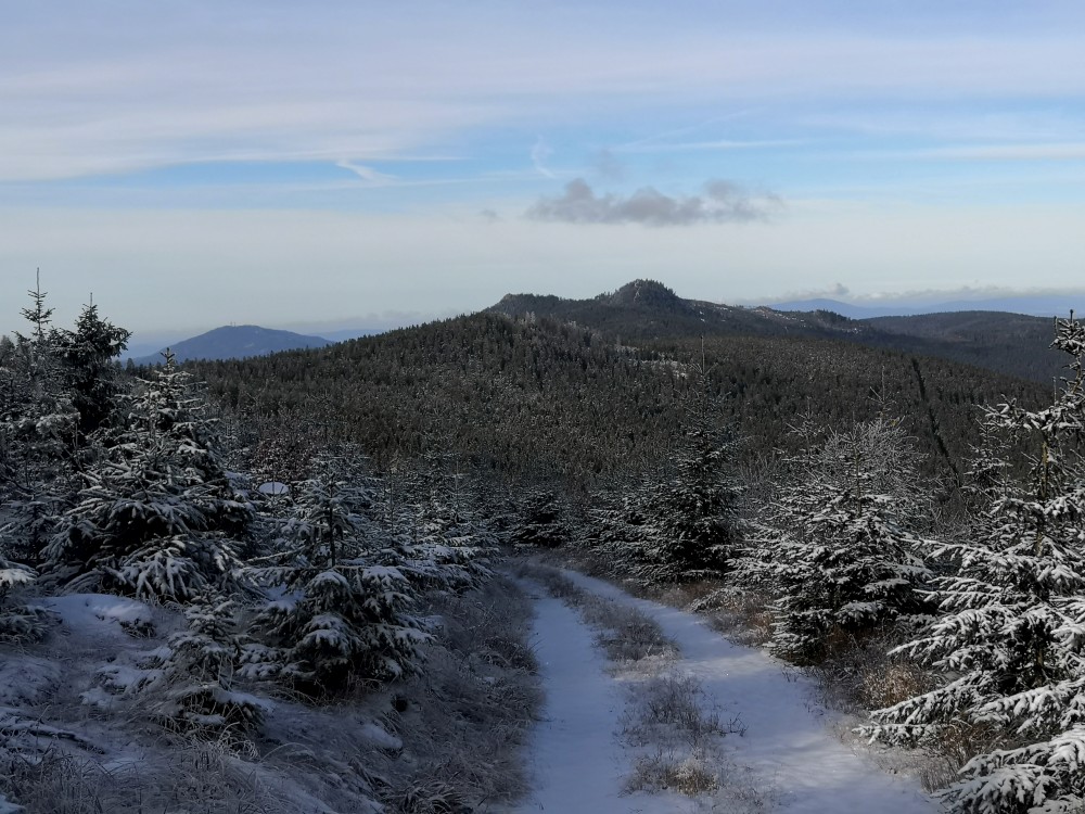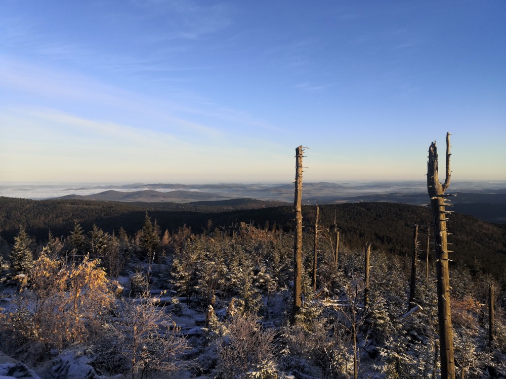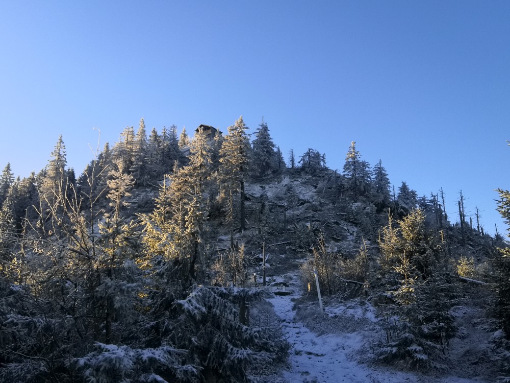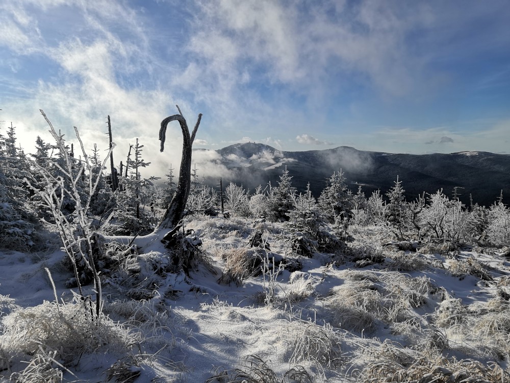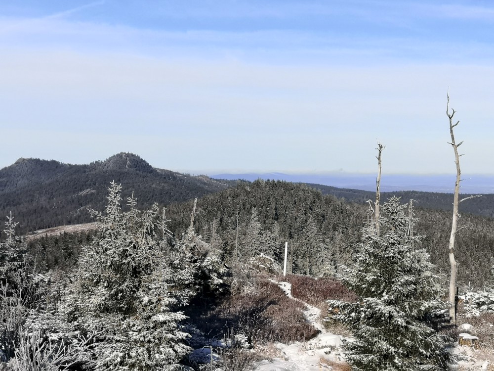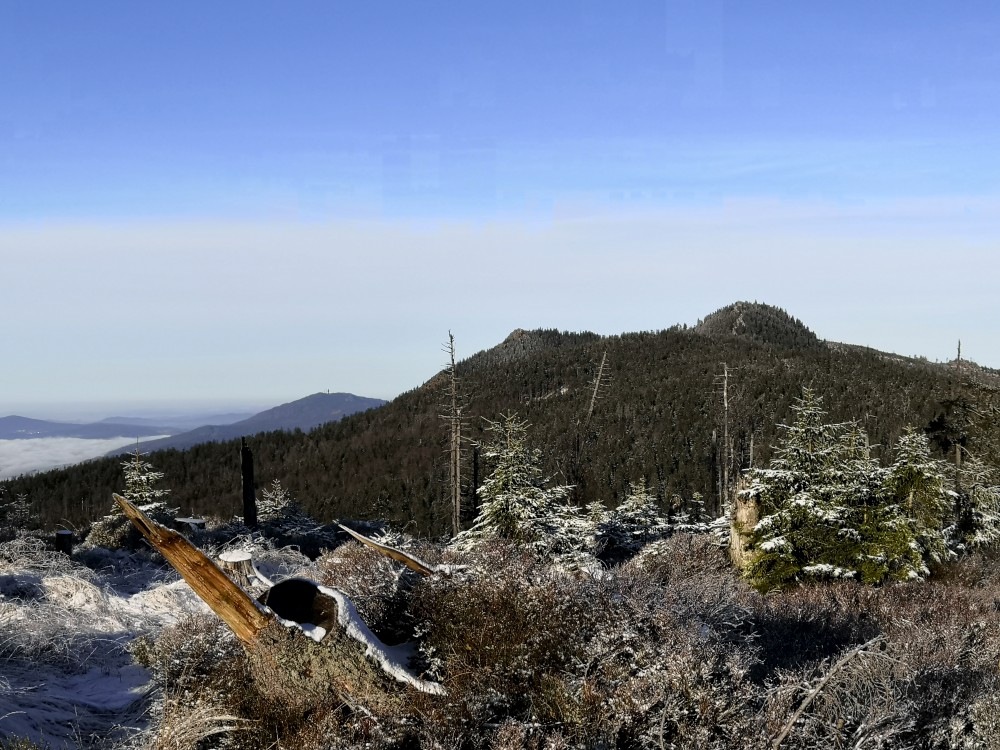 Jedu zase na Šumavu na dopolední výlet. Dnes je to daleko, až za Železnou rudou, takže jedu už kolem půl páté ráno. Kolem půl sedmé nechávám auto v obci Hamry a po tmě stoupám přes Stateček na vrchol Ostrý. Nahoře jsem před osmou. Východ slunce jsem nestihl, ale jsou krásné výhledy. Po chvíli kochání se vydávám hřebenovkou přes Malý a Velký Kokrháč až na Svaroh, nejvyšší bod mé dnešní cesty. Pak sbíhám dolů, jdu se ještě podívat na vodopád Bílá Strž. Odtud už spěchám k autu.