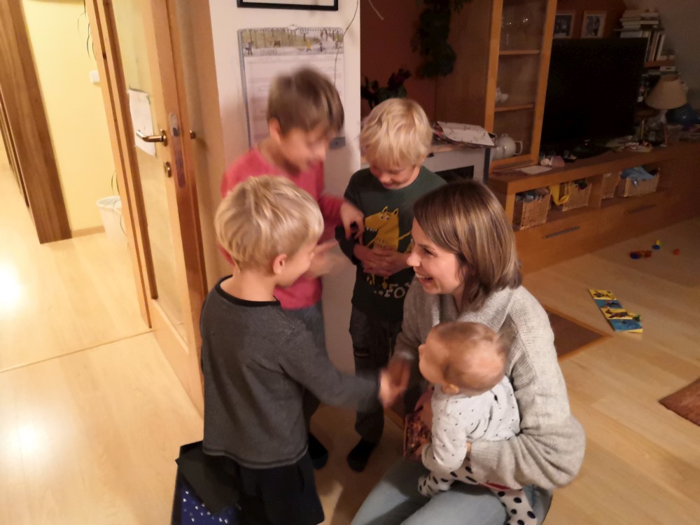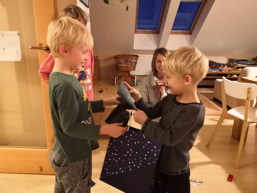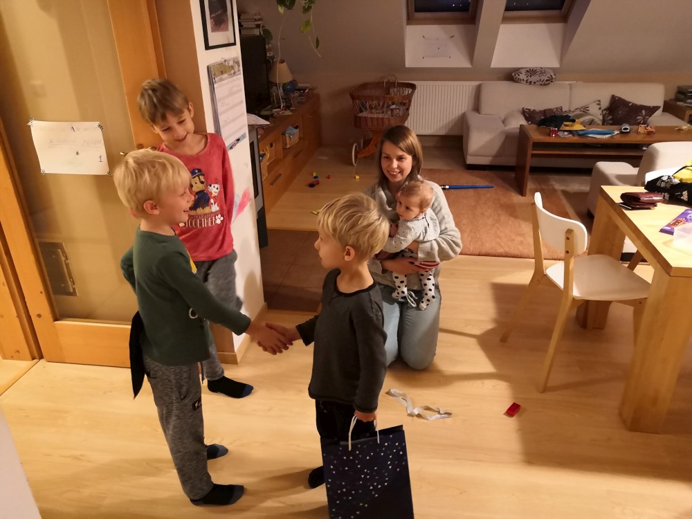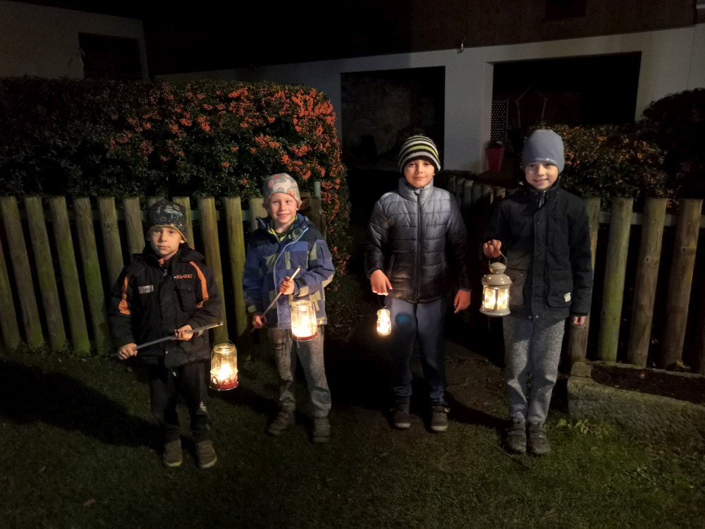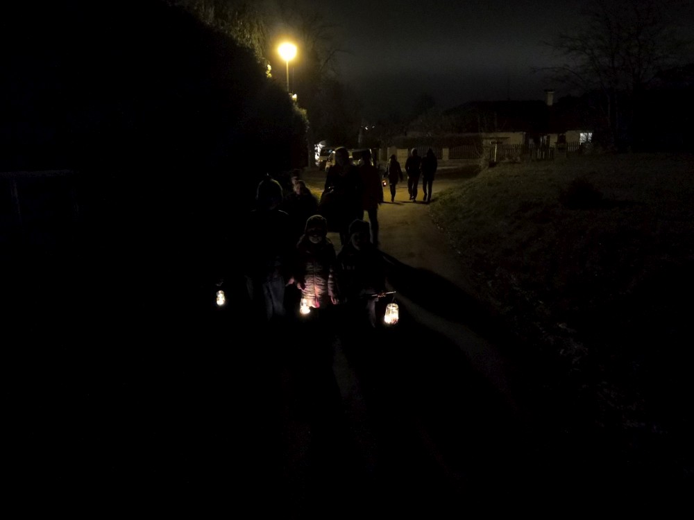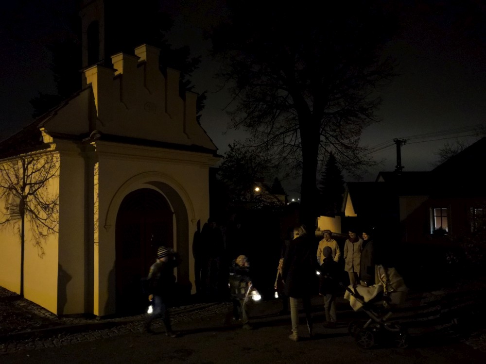 Martínek má dneska svátek. Nejdříve máme malou oslavu doma a pak jdeme na lucerničkový pochod po Horkách. Ten tradiční v Táboře je zrušen. Jde s námi Pavel s rodinou, Mací s dětma, babička Hanka. U kapličky k nám přijíždí strejda Martin na bílé Vespě.