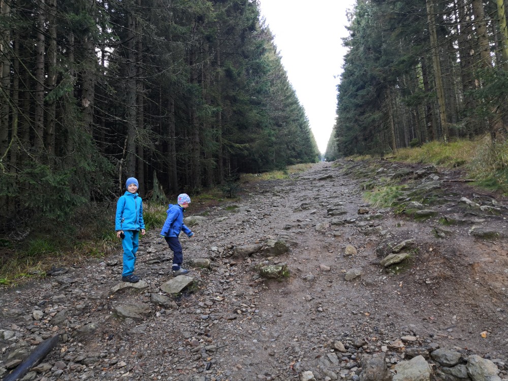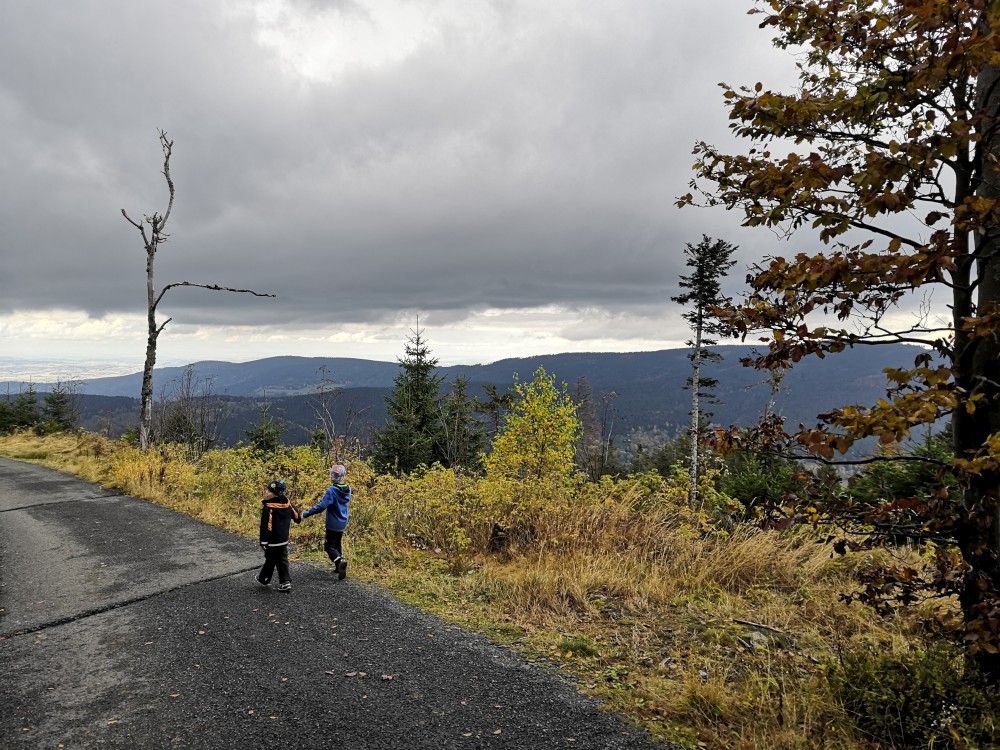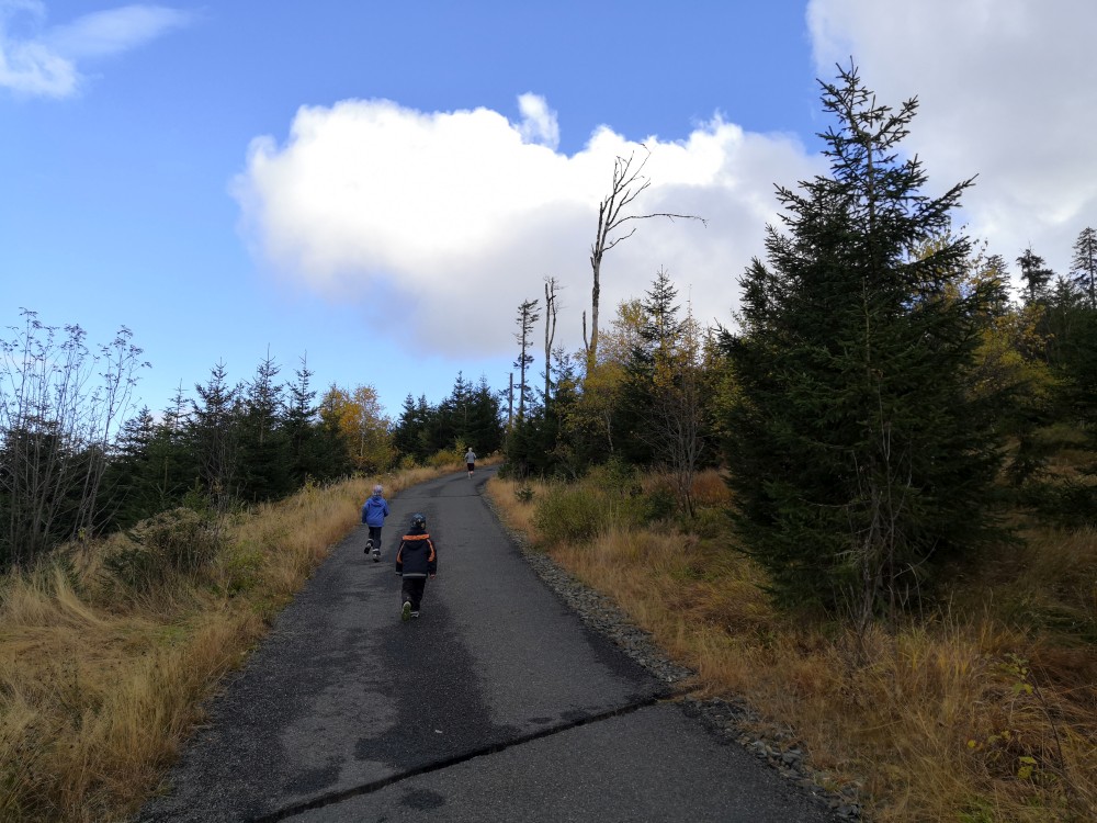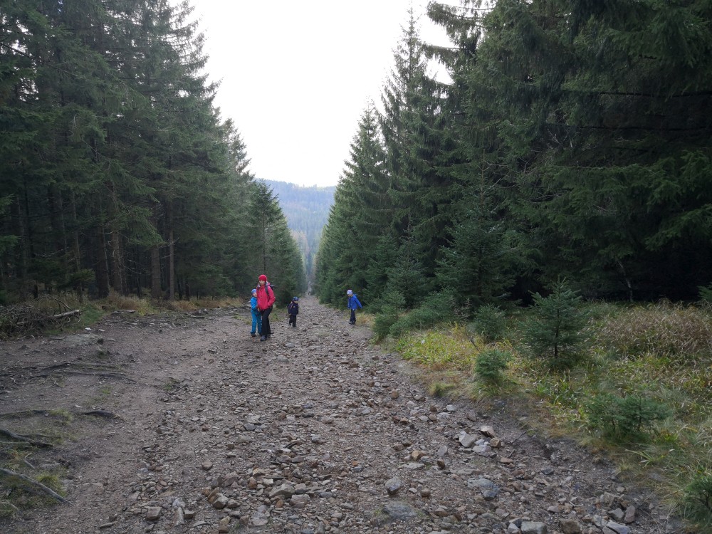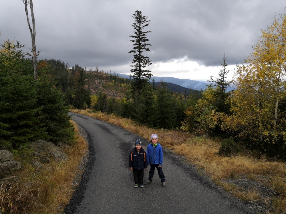 Od Rozvodí jdeme k rozcestí Pod Malým Špičákem. Zde se dělíme. Dle online map má být cesta na Špičák v této době uzavřena, ale není. Já s Jiříkem a Martínkem se jdeme podívat na Špičák, Jana s Bětuškou a Víťou pokračují dolů k Čertovu jezeru.