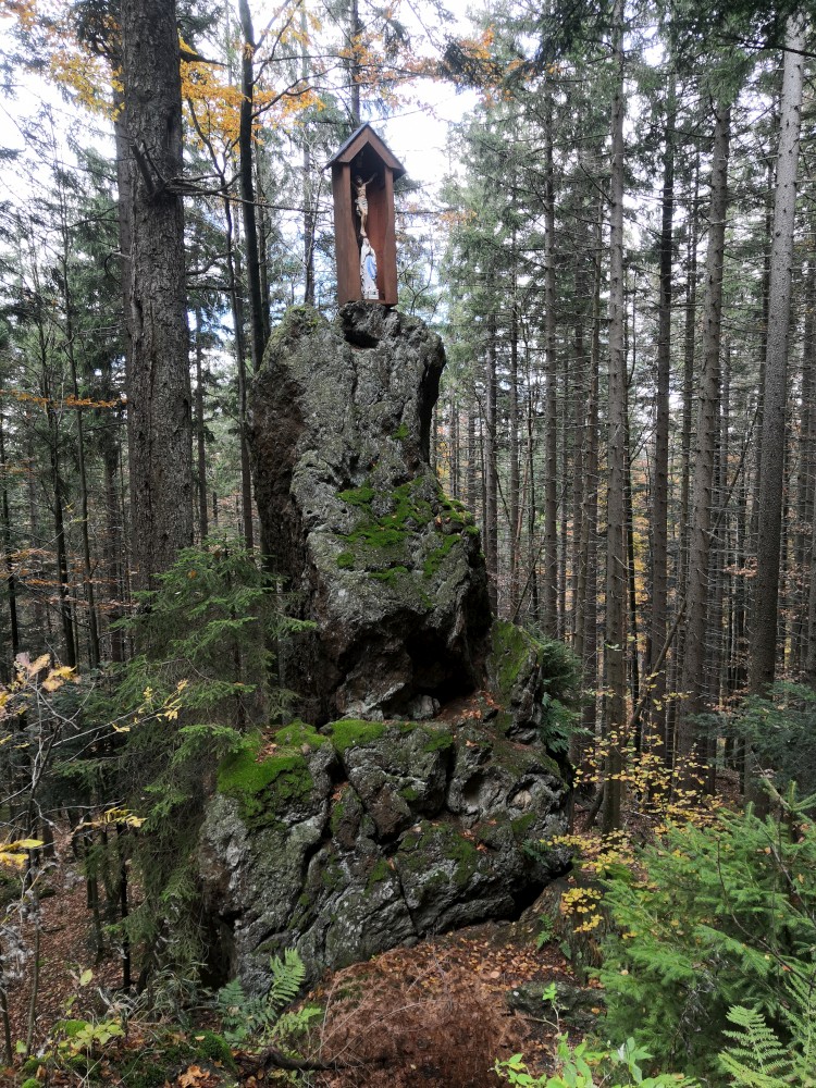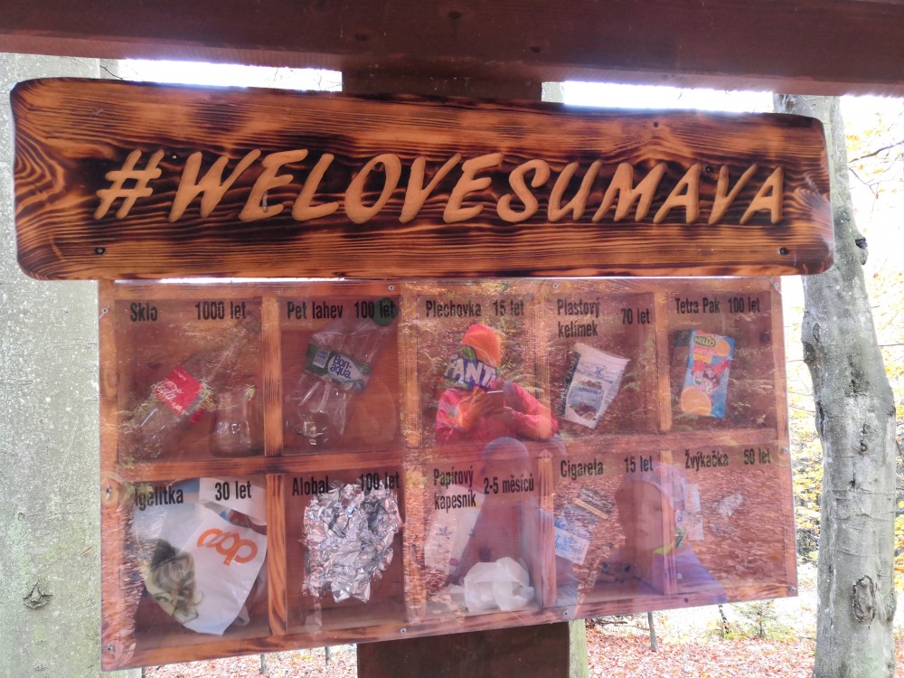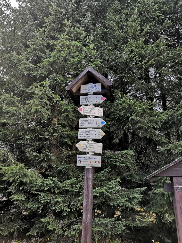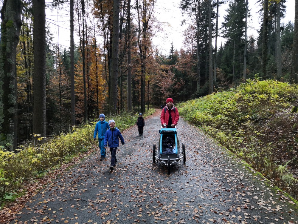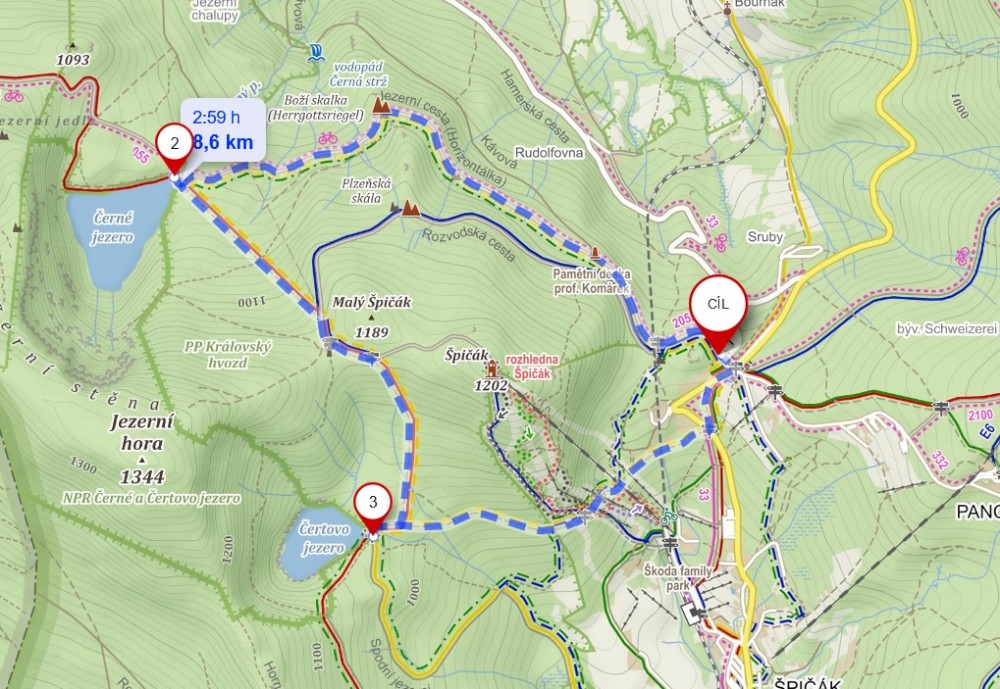 Od Rozvodí jdeme k rozcestí Pod Malým Špičákem. Zde se dělíme. Dle online map má být cesta na Špičák v této době uzavřena, ale není. Já s Jiříkem a Martínkem se jdeme podívat na Špičák, Jana s Bětuškou a Víťou pokračují dolů k Čertovu jezeru.