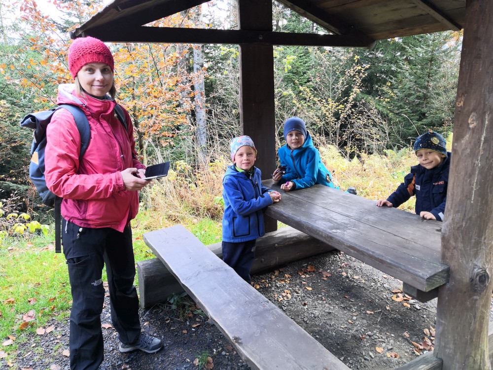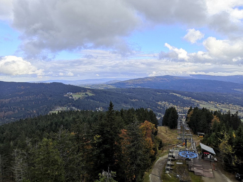 Potkáváme se u jezera. Svačíme, fotíme, čteme cedule. Pak pokračujeme kousek stejnou cestou, kterou jsme přišli a pak po žlutém jezerním okruhu přes sjezdovky zpět na parkoviště. U sjezdovek pozorujeme lidi, co jezdí na místních trailech. Na parkovišti jsme před pátou. Balíme se do auta a jedeme domů. V Týně nad Vltavou objednáváme pizzu k večeři.