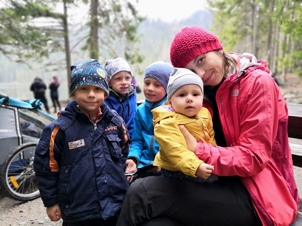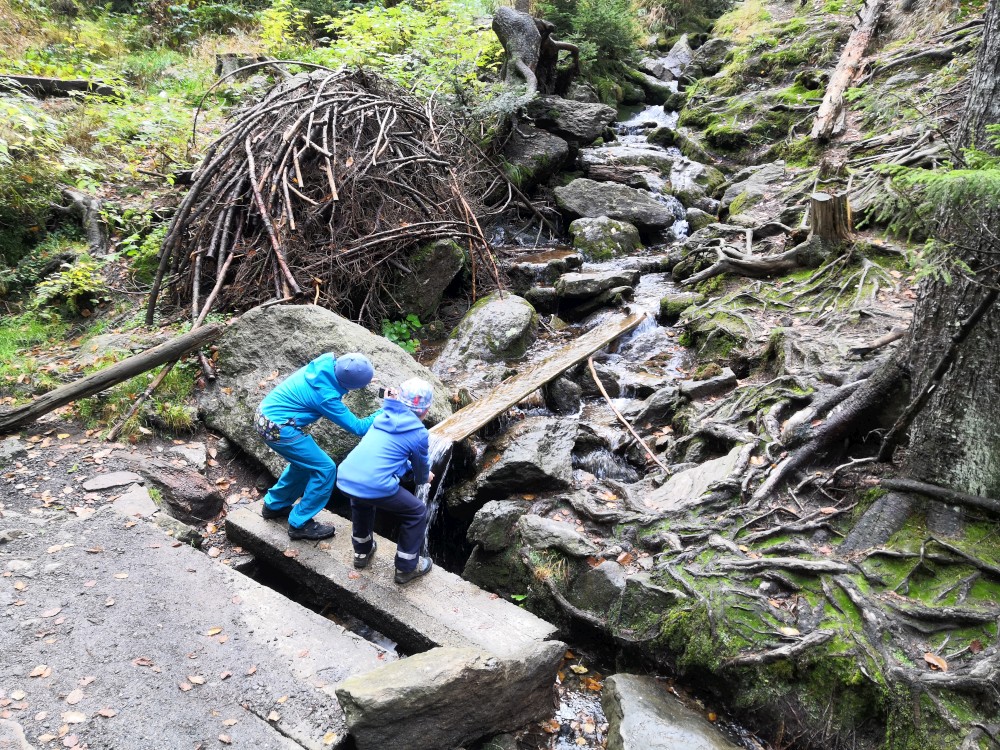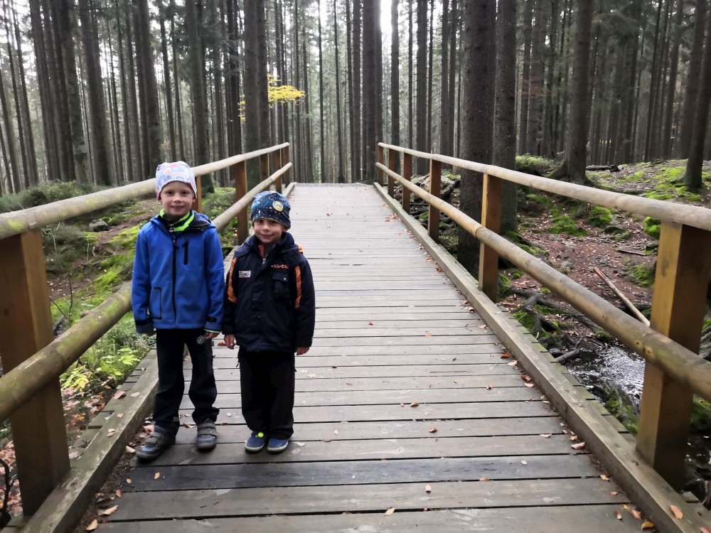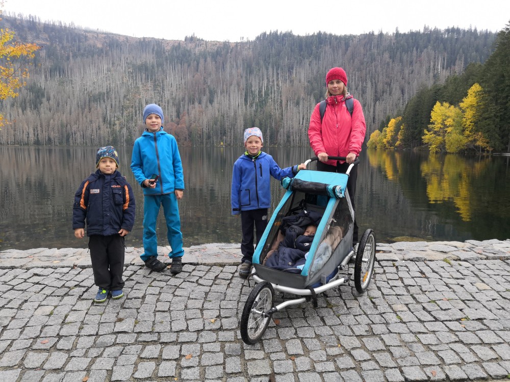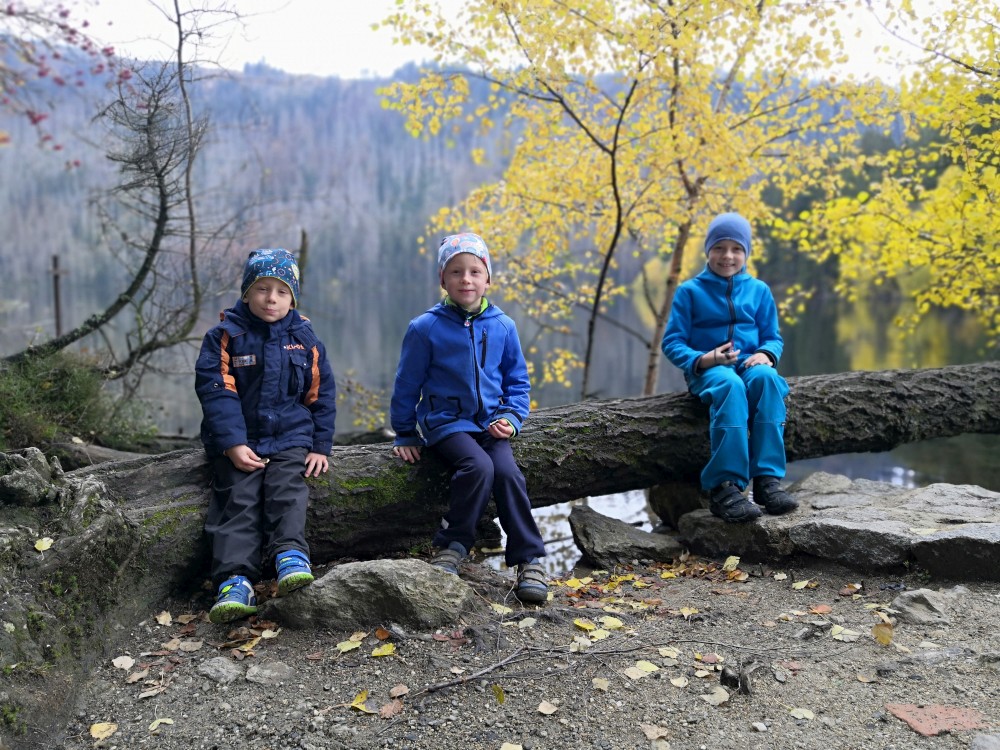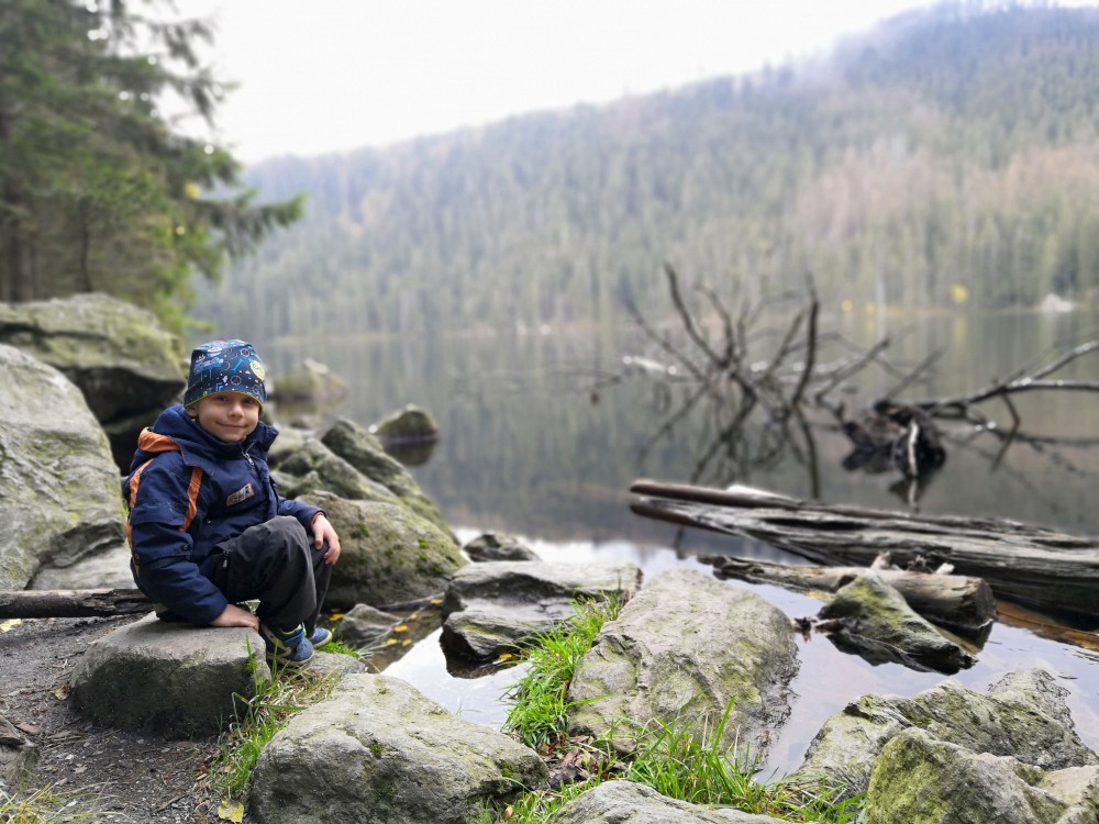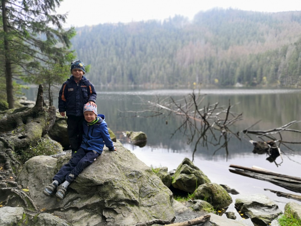 Dáváme sváču, čteme si informační cedule, kluci si hrají u břehu. Zkouší teplotu vody, zkoumají život pod hladinou. Vyrážíme po červené na Rozvodí. Cesta je mnohem náročnější než doposud. Jdeme po velmi prudké kamenité cestě vzhůru. Lidé nás varují, že to s vozíčkem nedáme. Ale zas tak hrozné to nebylo.