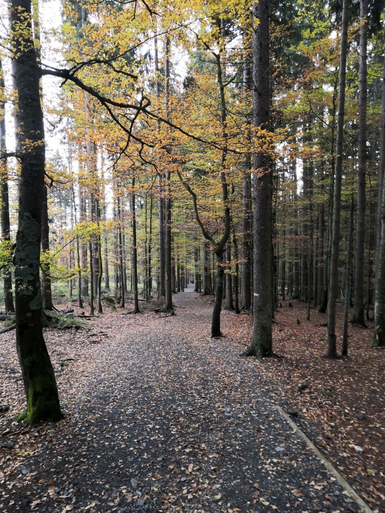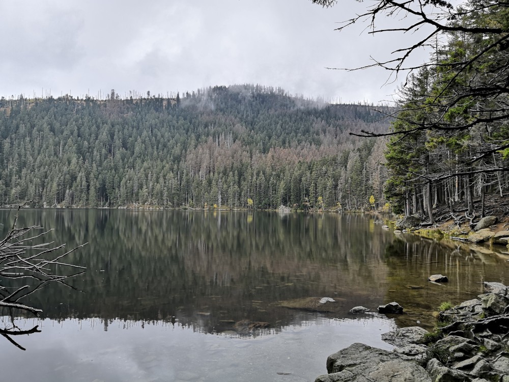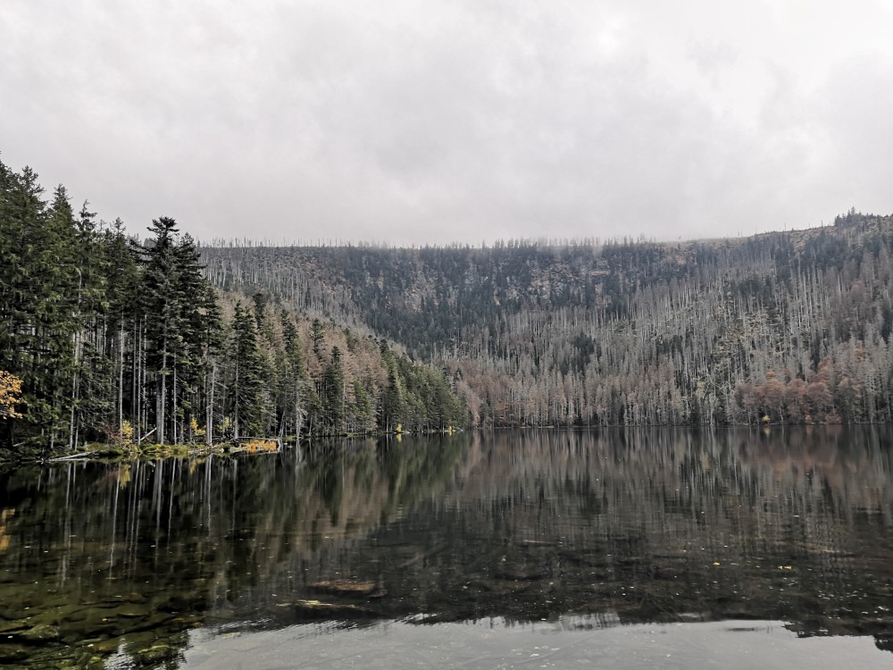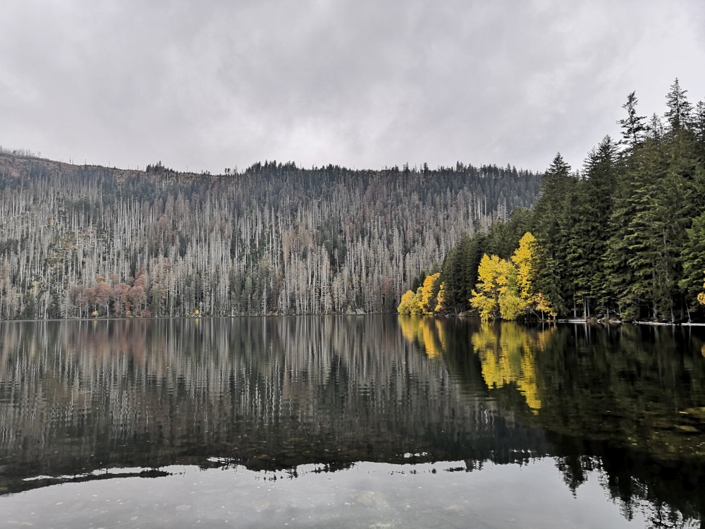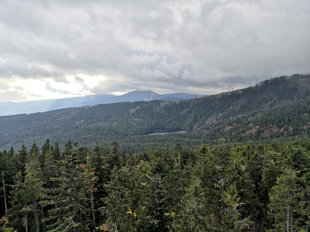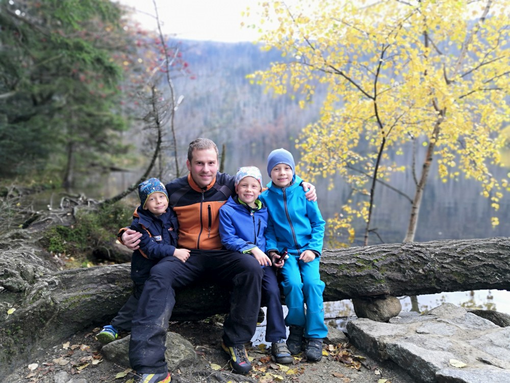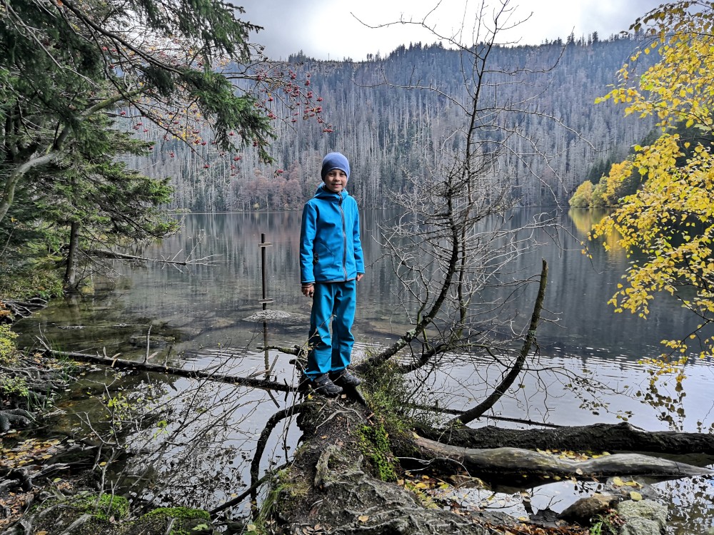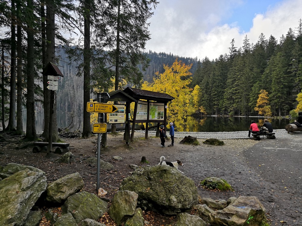 Dneska jedeme na výlet na Šumavu. Je krásně. Kolem jedné hodiny odpoledne necháváme auto na parkovišti ve Špičáckém sedle, dáváme u místního kiosku párek v rohlíku a vyrážíme na jezerní okruh. Jdeme nejdříve k Černému jezeru. Cesta je pohodlná, po zpevněné cestě. Za chvíli jsme u jezera.