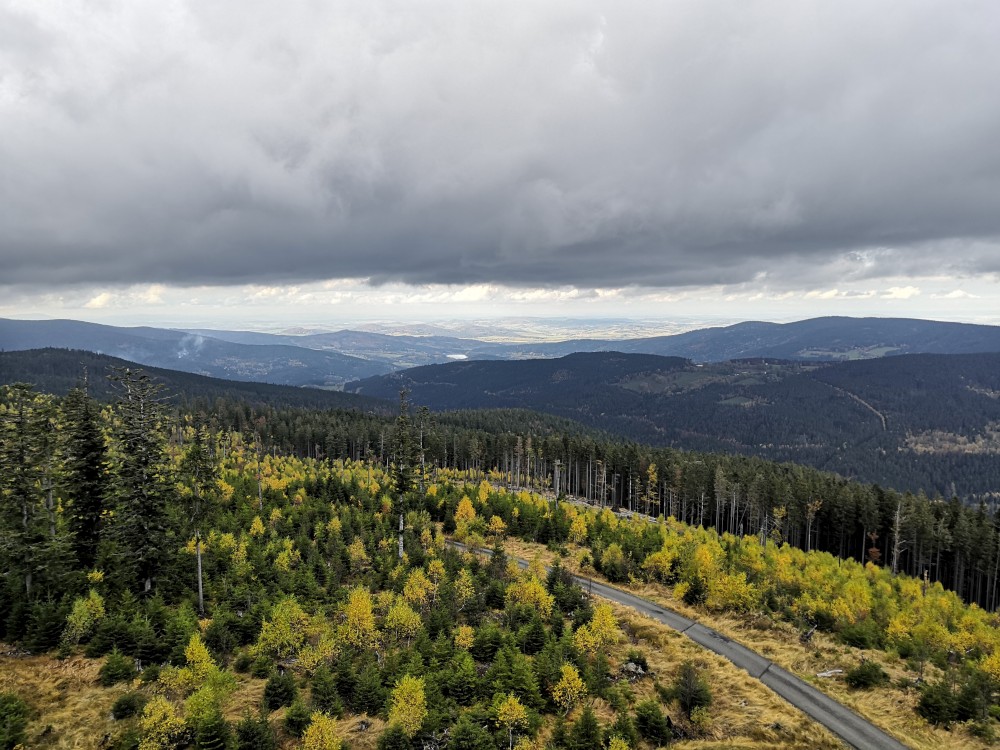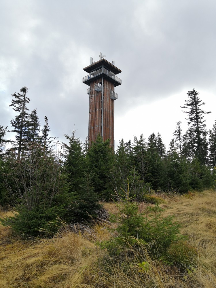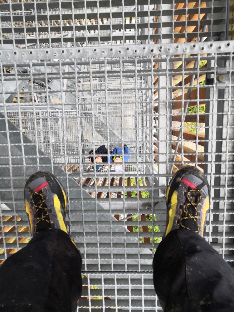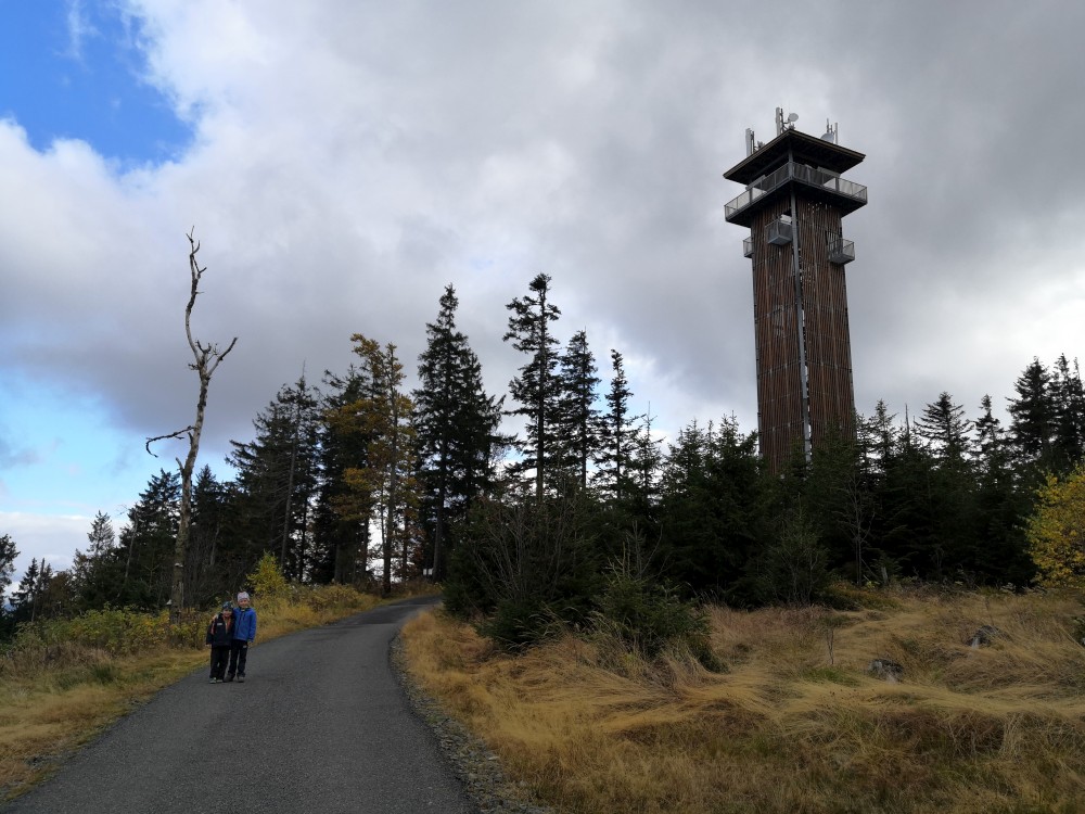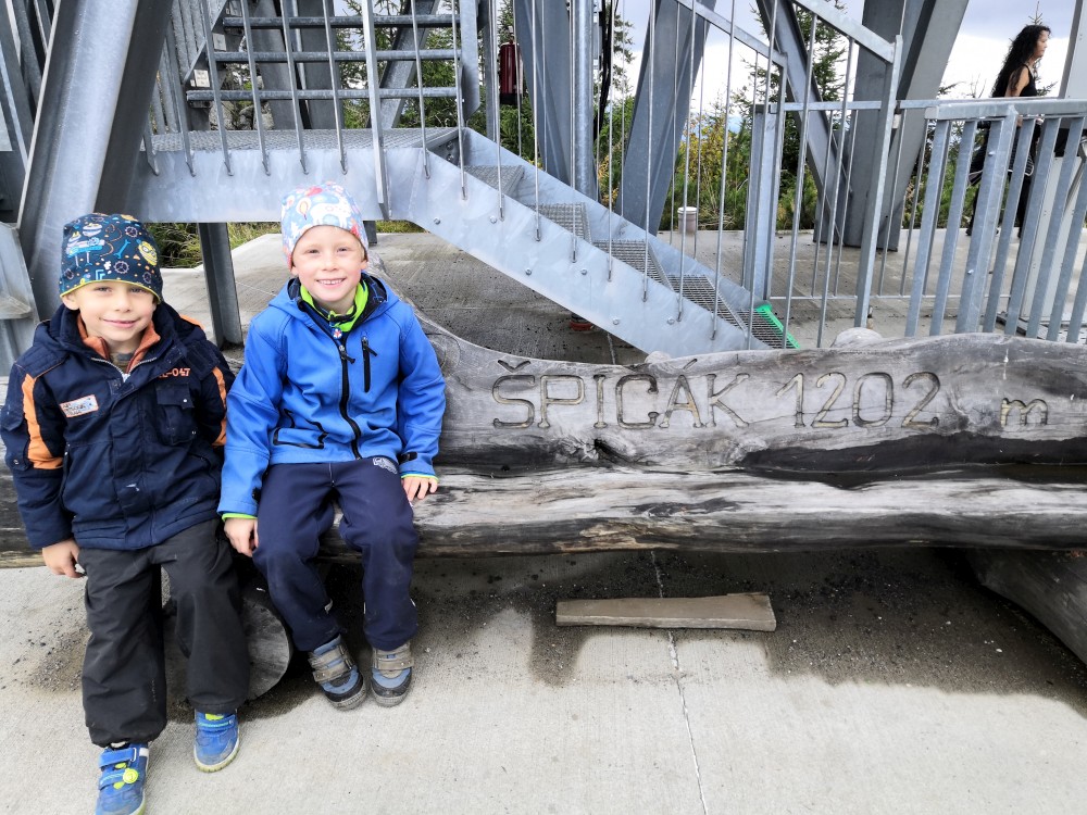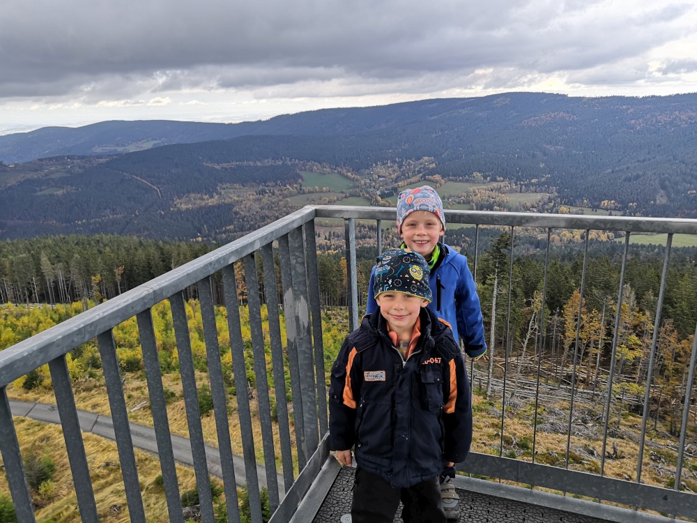 Na Špičáku je rozhledna. Lezeme nahoru. Jsou tu krásné výhledy. Také je to trošku adrenalin. Jsou zde vyhlídkové terásky, které vystupují mimo půdorys rozhledny a podlahu tvoří jen kovový rošt. Je tedy pod nohama vidět dolů. Nezdržujeme se dlouho, jdeme dolů k jezeru za Janou, Víťou a Bětuškou.