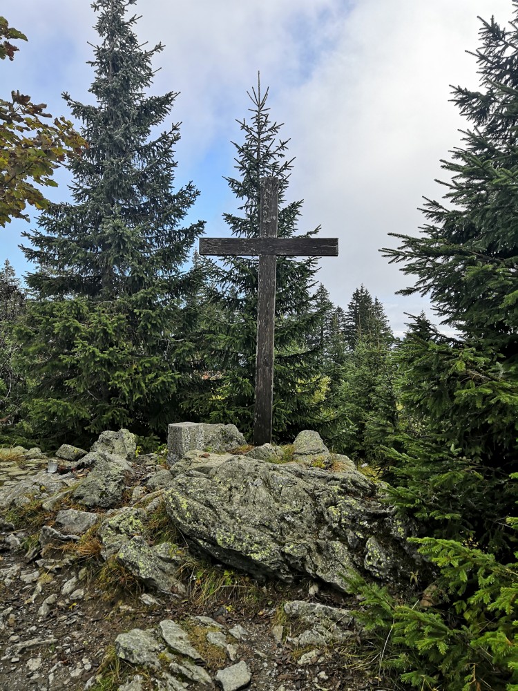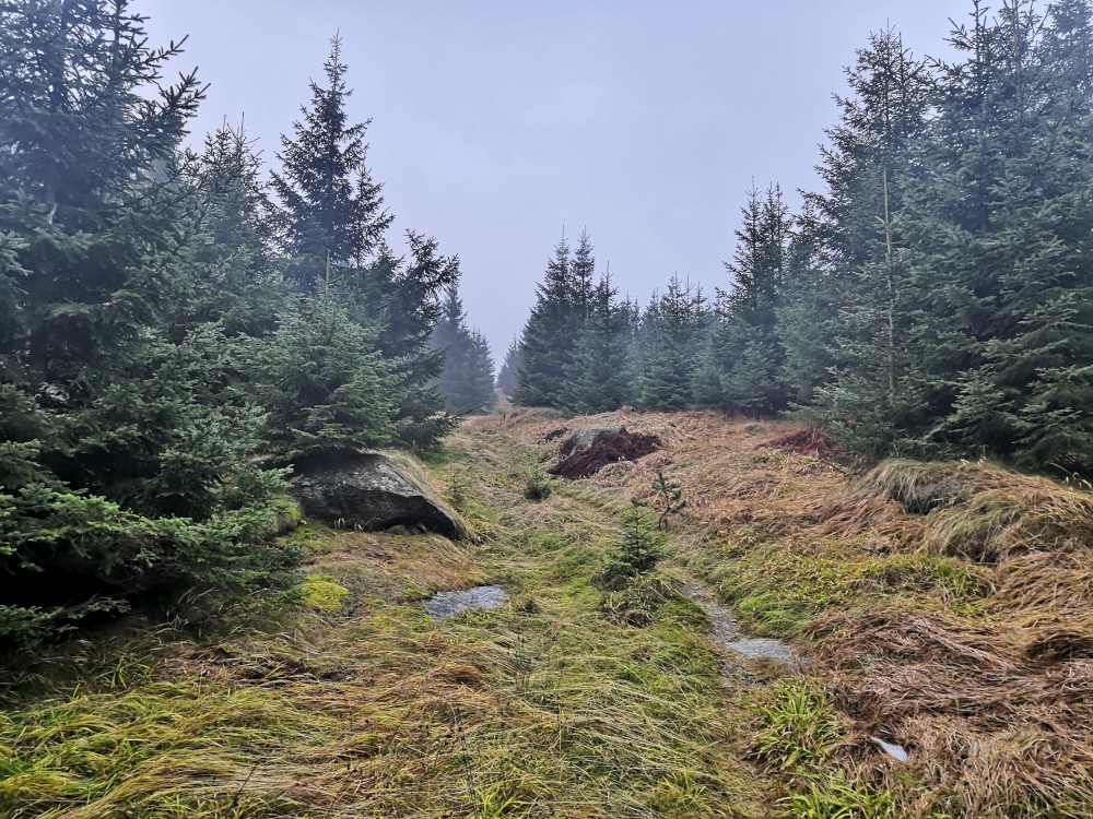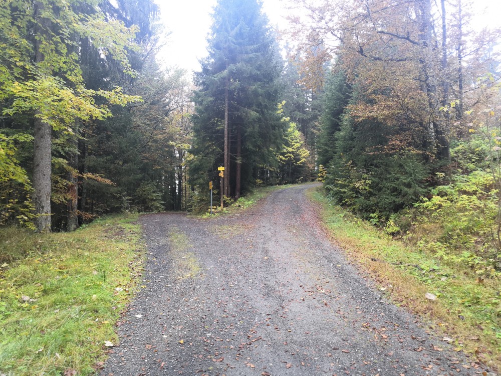 Po chvíli se od žluté odpojuji a jdu po prudké neznačené lesní cestě. Cesta se chvílemi ztrácí, terén je těžký, po prudké spádnici vzhůru. Napojuji se na cestu která již jde po traverze, jde se lépe, jen je zde hodně vody. Dostávám se na zpevněnou cestu a odtud ní je to už kousek na vrchol.