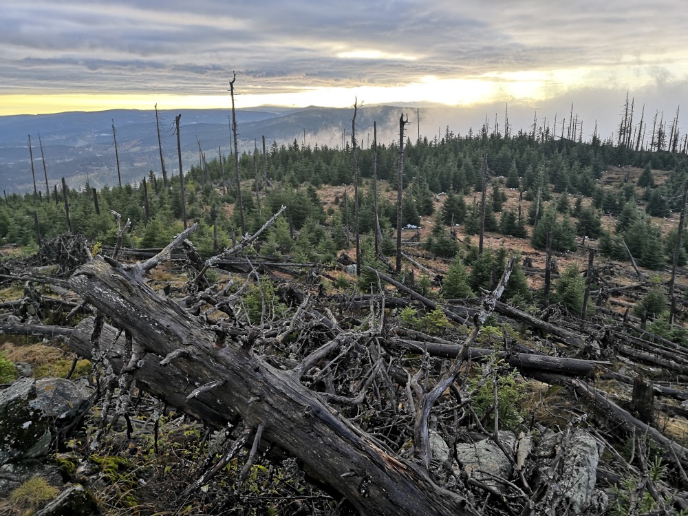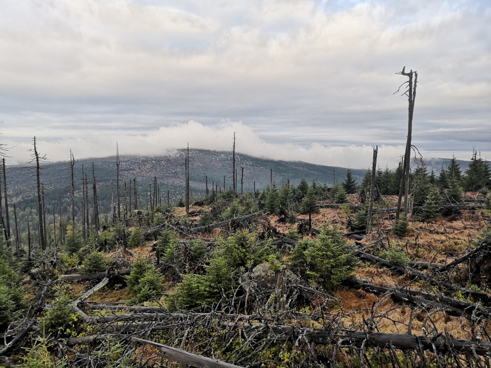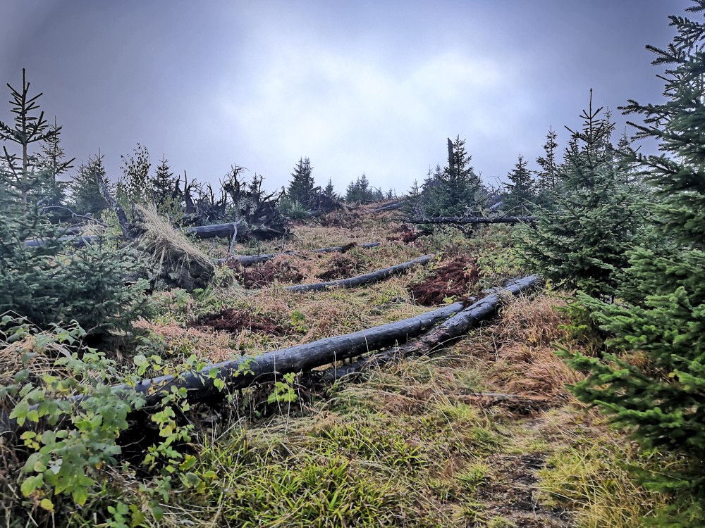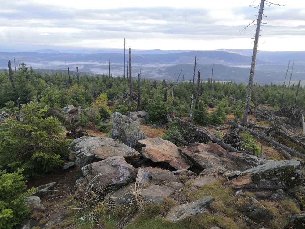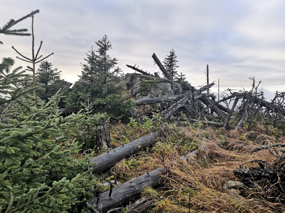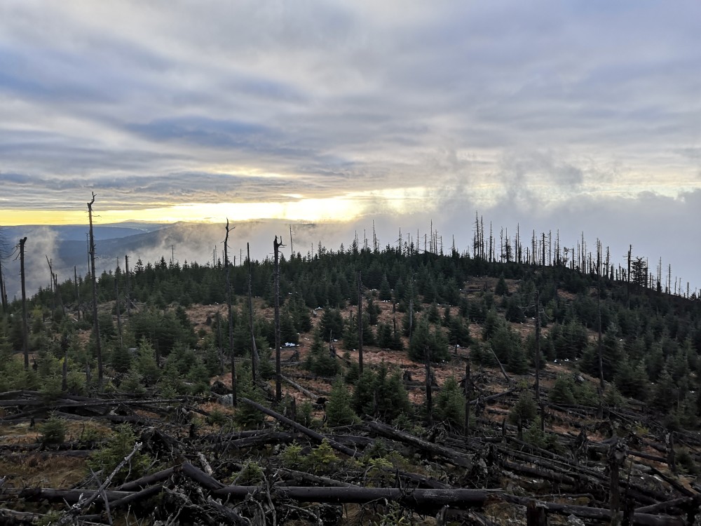 Poledník se hodně změnil od té doby, co jsem tu byl naposled. Po orkánu Kiril zde všude tyčí pahýly polámaných stromů. Mezi nimi rostou stromy nové. Moc se mi líbí, jak rozmanitě se les samovolně obnovuje. Na Poledníku potkávám pár lidí, co zde nocovali. Rozhledna je zavřená. Je ve špatném technickém stavu a čeká na rekonstrukci.
