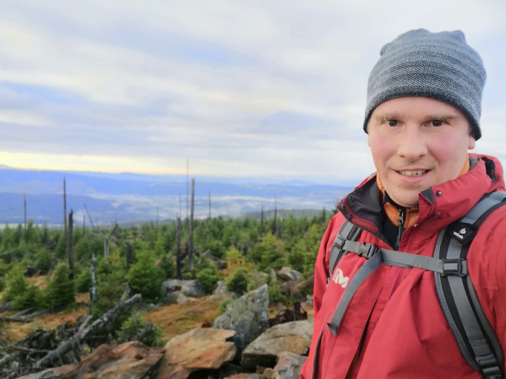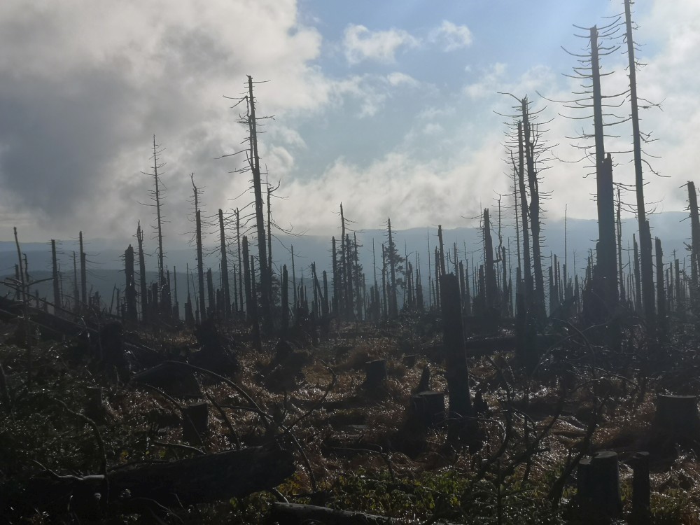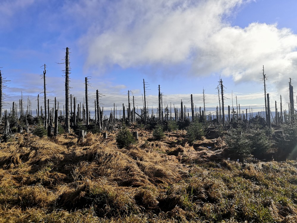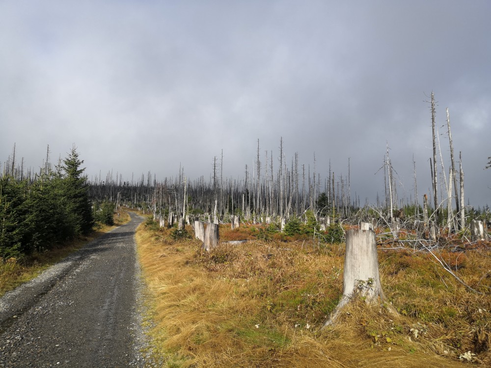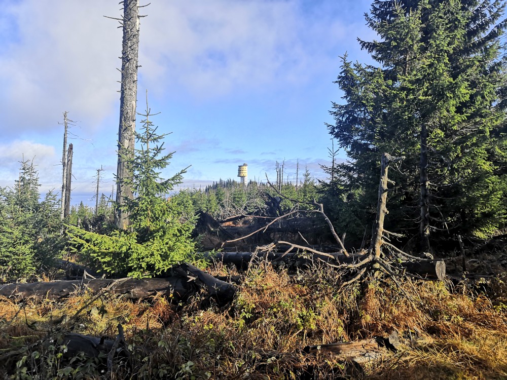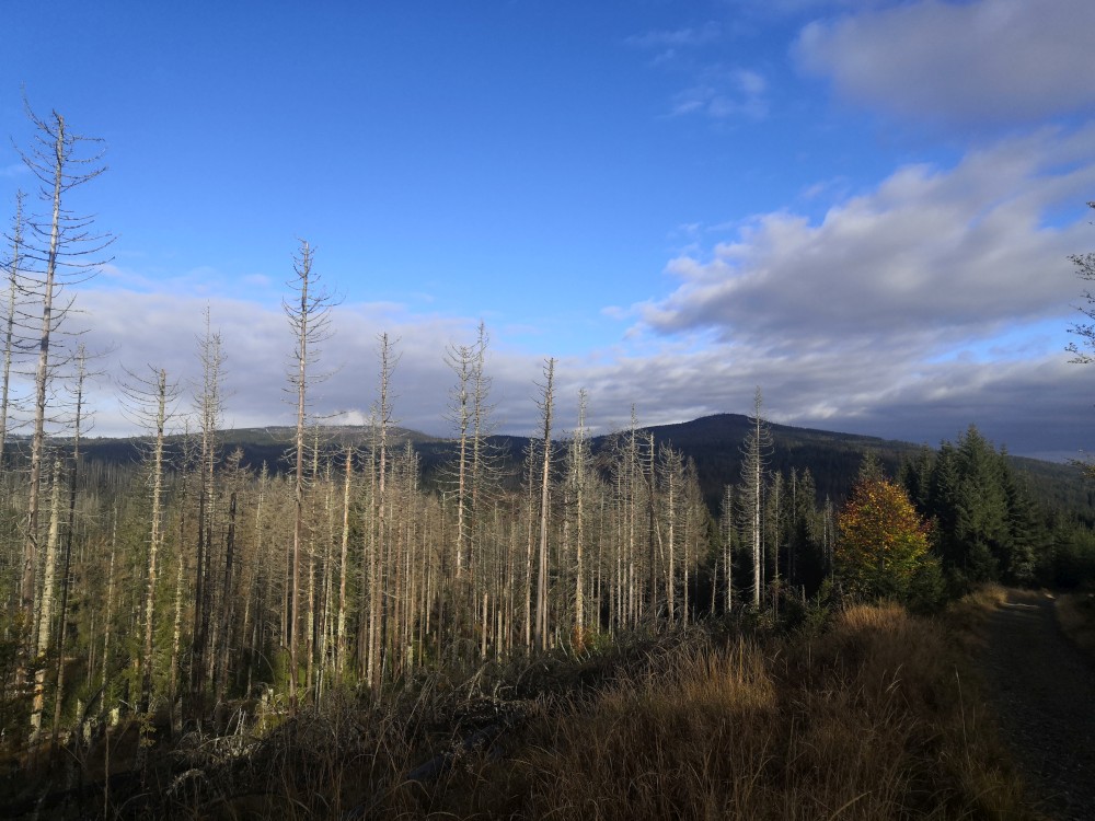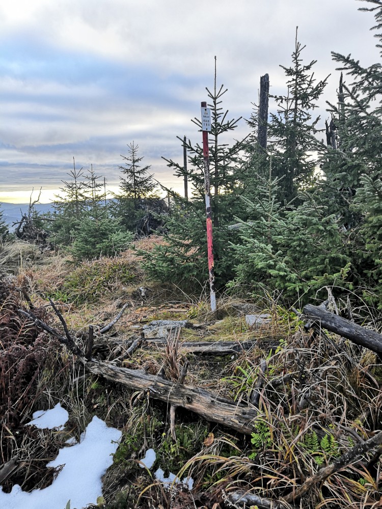 Poledník se hodně změnil od té doby, co jsem tu byl naposled. Po orkánu Kiril zde všude tyčí pahýly polámaných stromů. Mezi nimi rostou stromy nové. Moc se mi líbí, jak rozmanitě se les samovolně obnovuje. Na Poledníku potkávám pár lidí, co zde nocovali. Rozhledna je zavřená. Je ve špatném technickém stavu a čeká na rekonstrukci.
