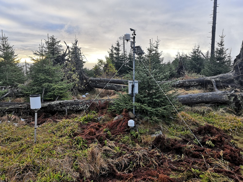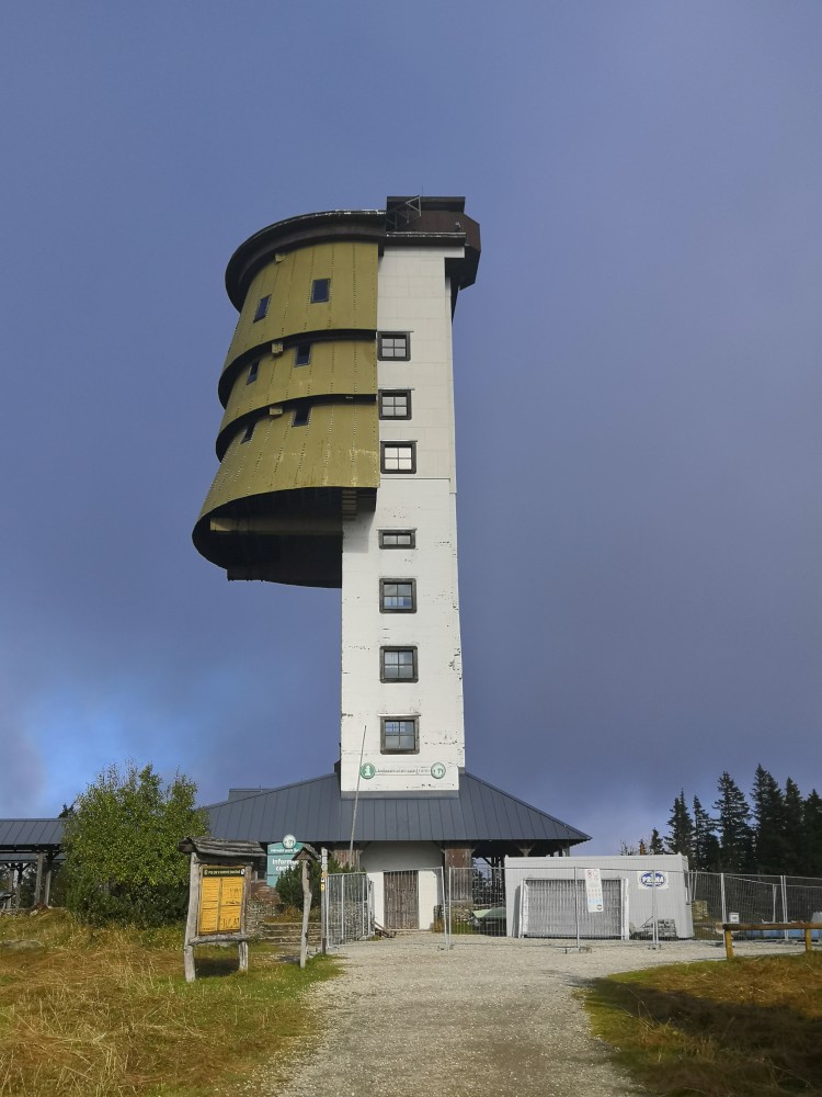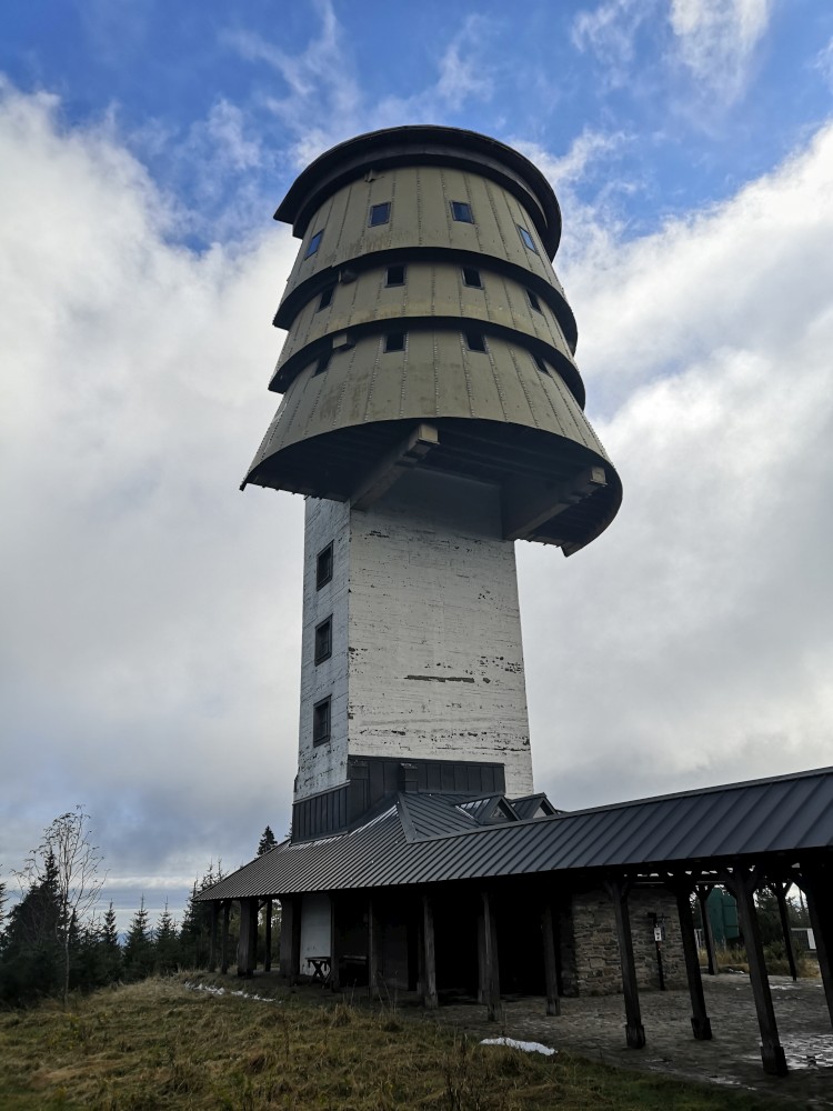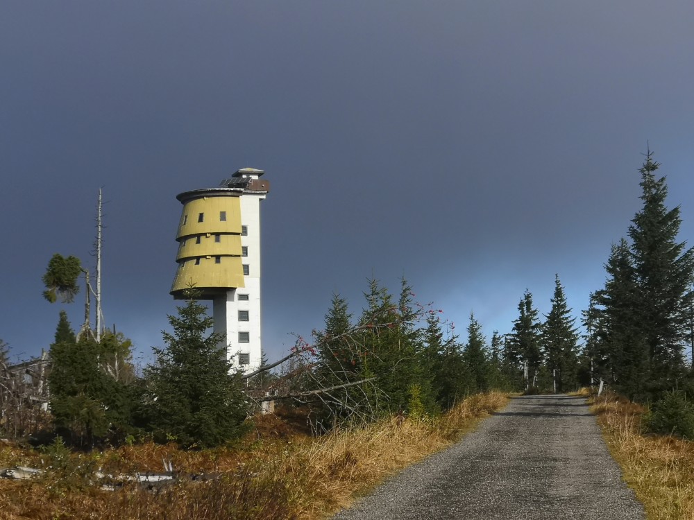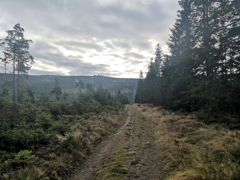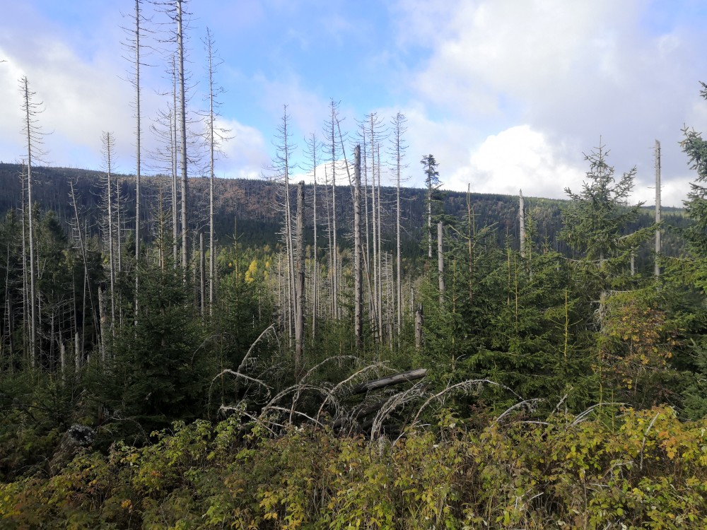 Poledník se hodně změnil od té doby, co jsem tu byl naposled. Po orkánu Kiril zde všude tyčí pahýly polámaných stromů. Mezi nimi rostou stromy nové. Moc se mi líbí, jak rozmanitě se les samovolně obnovuje. Na Poledníku potkávám pár lidí, co zde nocovali. Rozhledna je zavřená. Je ve špatném technickém stavu a čeká na rekonstrukci.