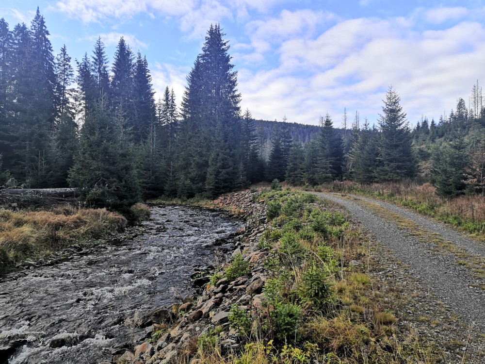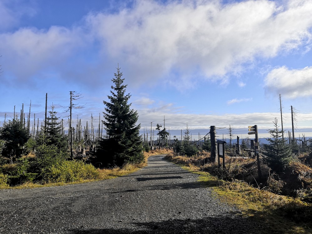 Jedu zase na Šumavu na dopolední výšlap. Dnes to bude vydatné, 22 km a převýšení přes 700 m. Ráno jsem trochu zaspal, jedu až v půl šesté, v Prášilech před půl osmou. Platím parkování a vyrážím po žluté za západ na horu Žďánidla.
