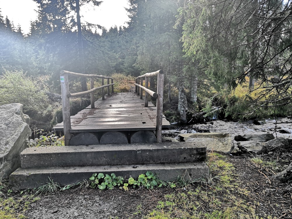 Po žluté se dostávám na Gsenget, bývalou osadu, která zde byla založena v 18.tém století. Také je to sedlo, které bylo používáno prý už od pravěku. Odtud dále klesám až k Frantovu mostu. Odtud už naopak jen prudce stoupám až na Poledník.